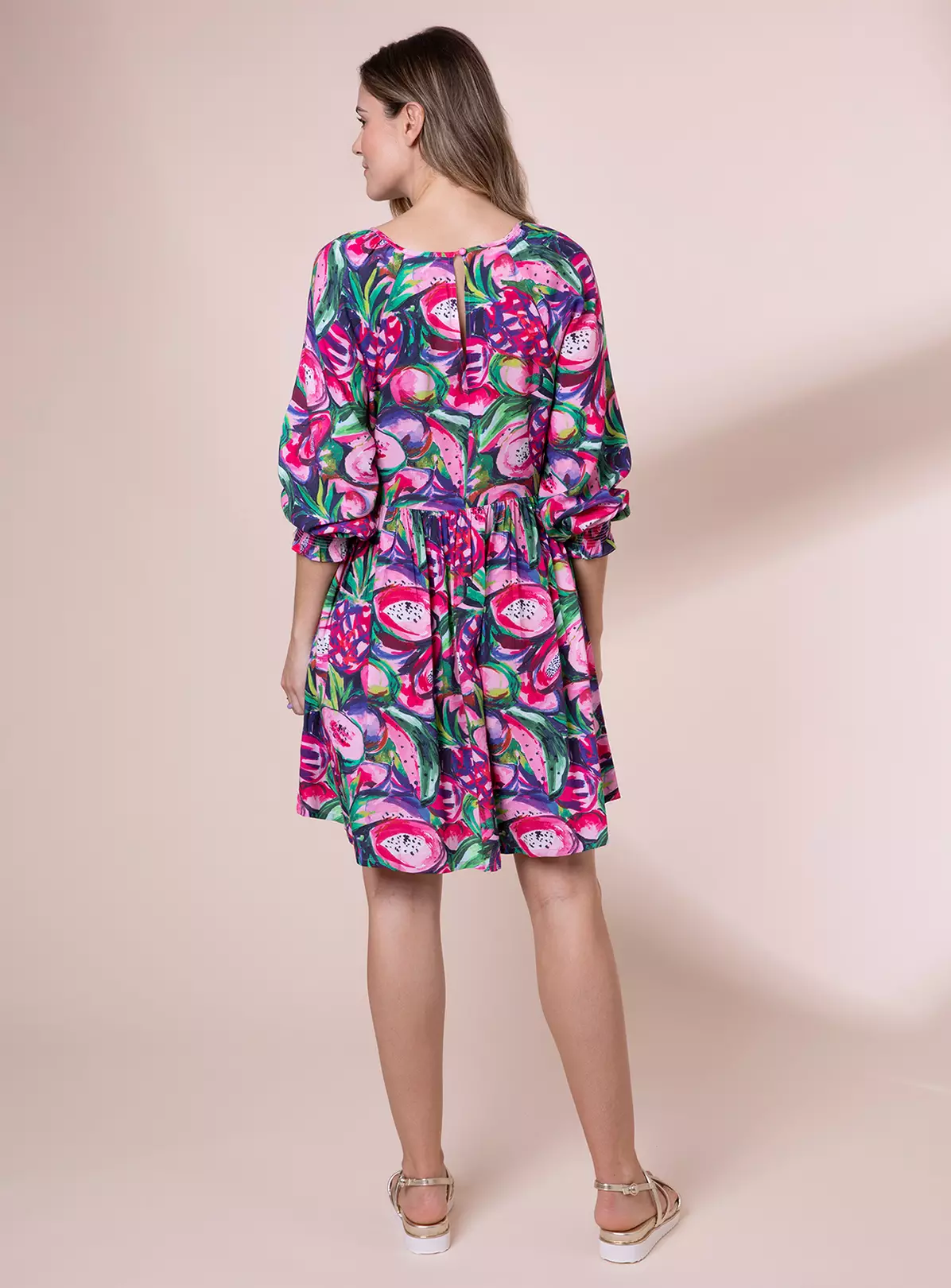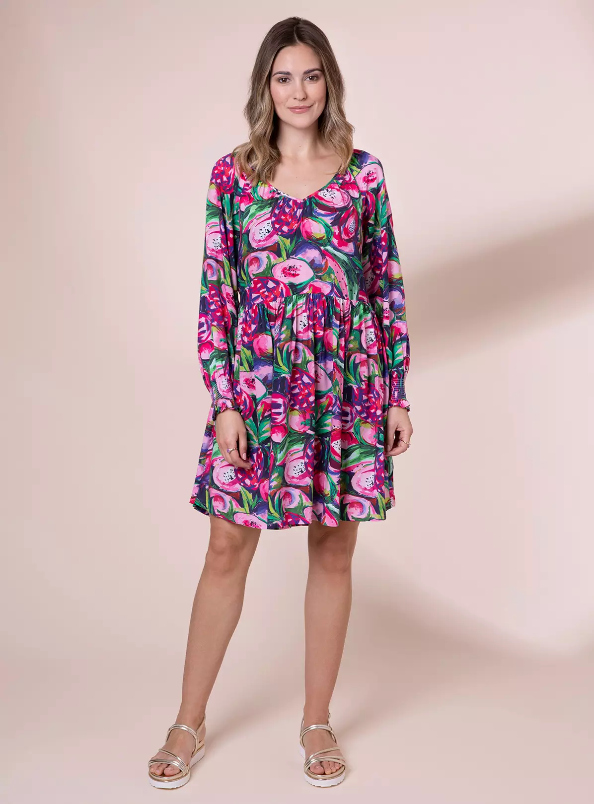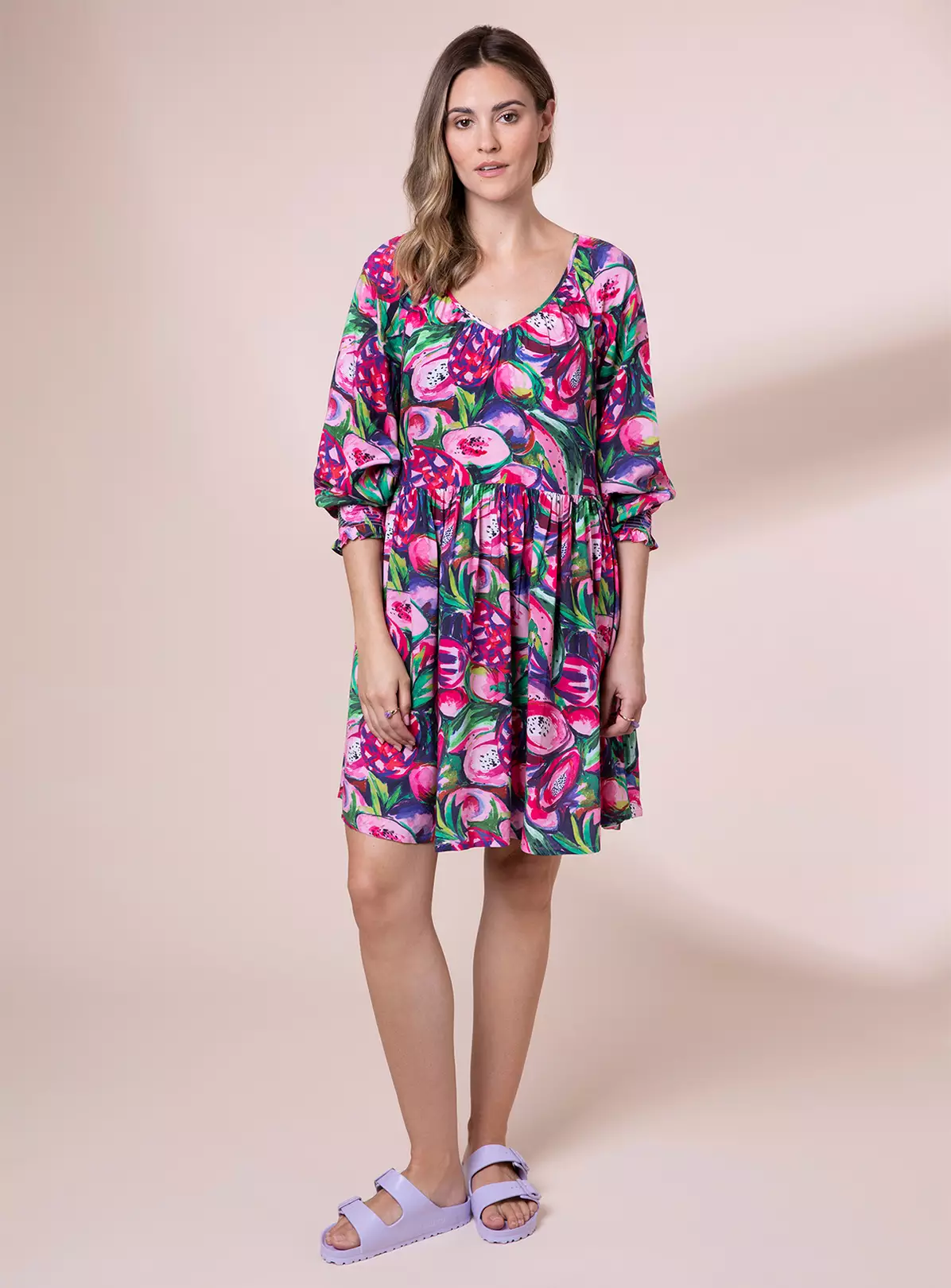 Perfect for dressing up or dressing down, our Laurie mini dresses are super versatile and made from a gorgeous EcoVero™ fabric, which is biodegradable, sustainable, super soft and made from responsibly sourced wood (yes wood!). Featuring a flattering v-neck, flowy shape, shirred cuff detailing and a vintage inspired cut fruit print in stunning purple colourway. Made from 100% Lenzing™ Ecovero™ Colour: Multi Side pockets Shirred cuff detailing Mini length Care: Machine wash 30° Fits true to size