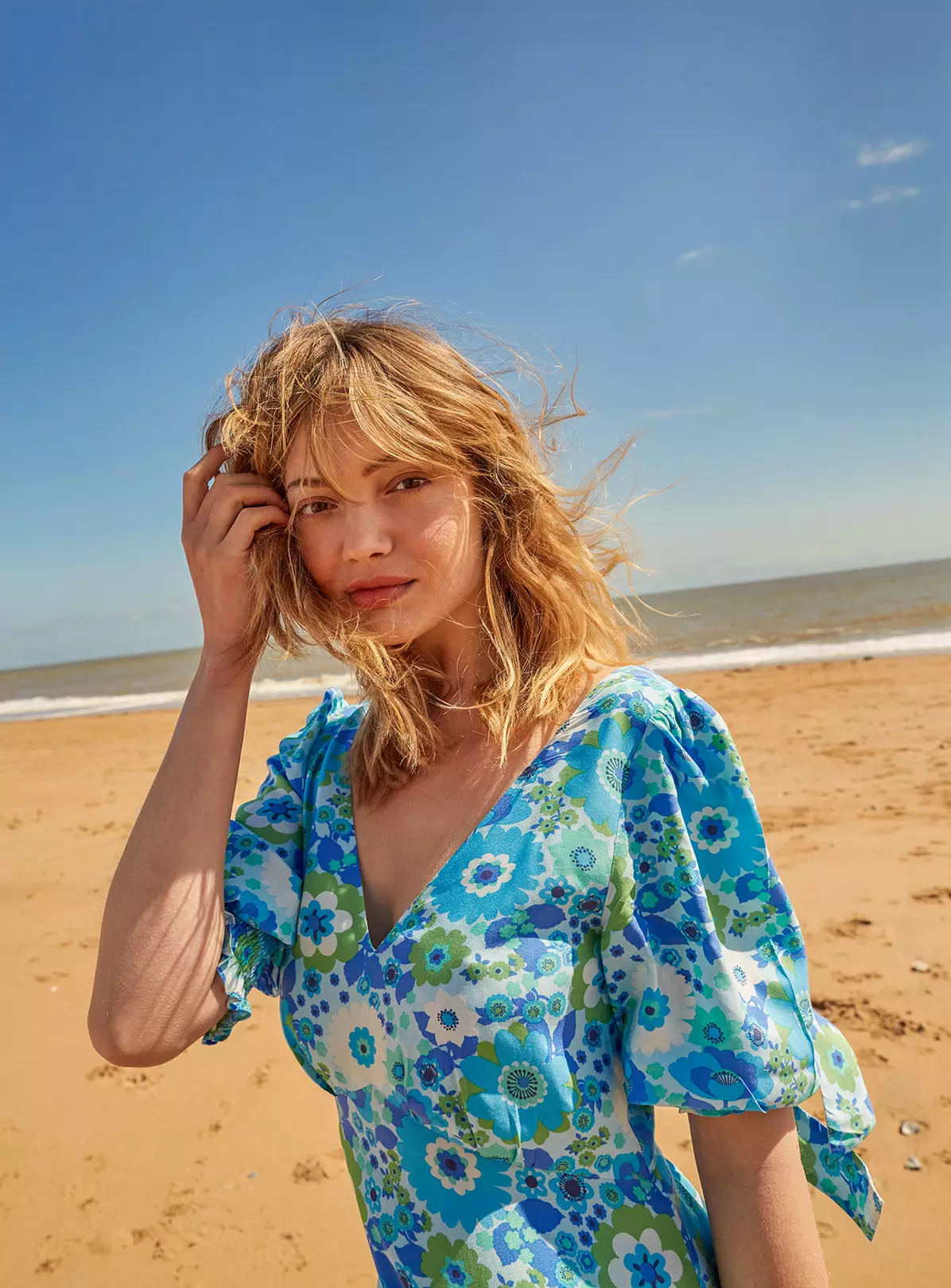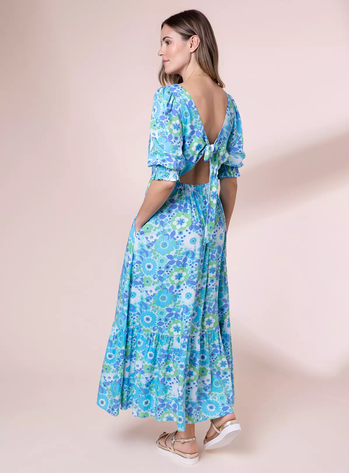 Elegant and effortlessly stylish, our Olivia midi dress is made from a gorgeous EcoVero™ fabric, which is biodegradable, sustainable, super soft and made from responsibly sourced wood (yes wood!). Featuring open back with gorgeous bow tie, short sleeve with shirred cuff detailing and a vintage inspired nostalgic flower print in sophisticated pale blue colourway. Made from 100% Lenzing™ Ecovero™ Colour: Multi / pale blue Side pockets Shirred cuff detailing Tie back bow Care: Machine wash 30° Fits true to size