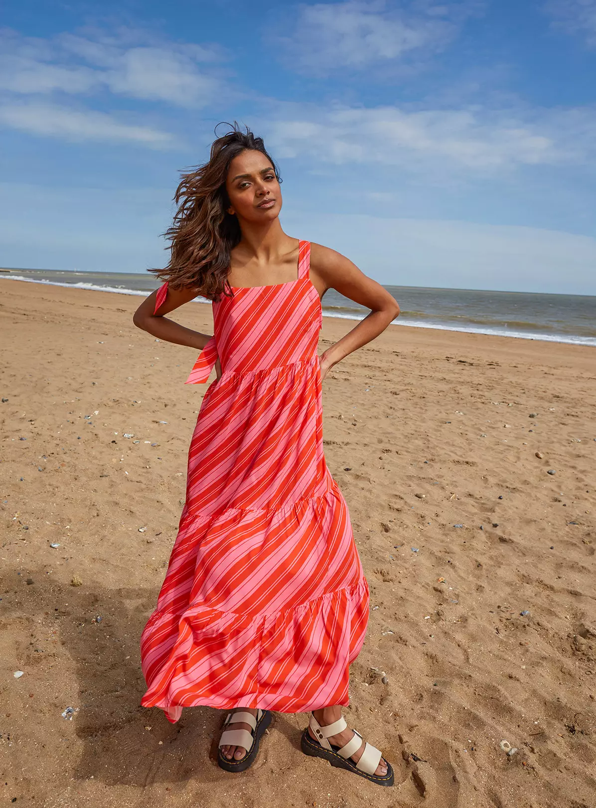 Fun and free-flowing, our strappy midi dresses are just perfect for summer and made from a gorgeous EcoVero™ fabric, which is biodegradable, sustainable, super soft and made from responsibly sourced wood (yes wood!). Featuring stylish bow tie back, tiered easy to wear shape and a vintage inspired diagonal pink stripe print. Made from 100% Lenzing™ Ecovero™ Colour: Red and pink Side pockets Tie back bow Care: Machine wash 30° Fits true to size