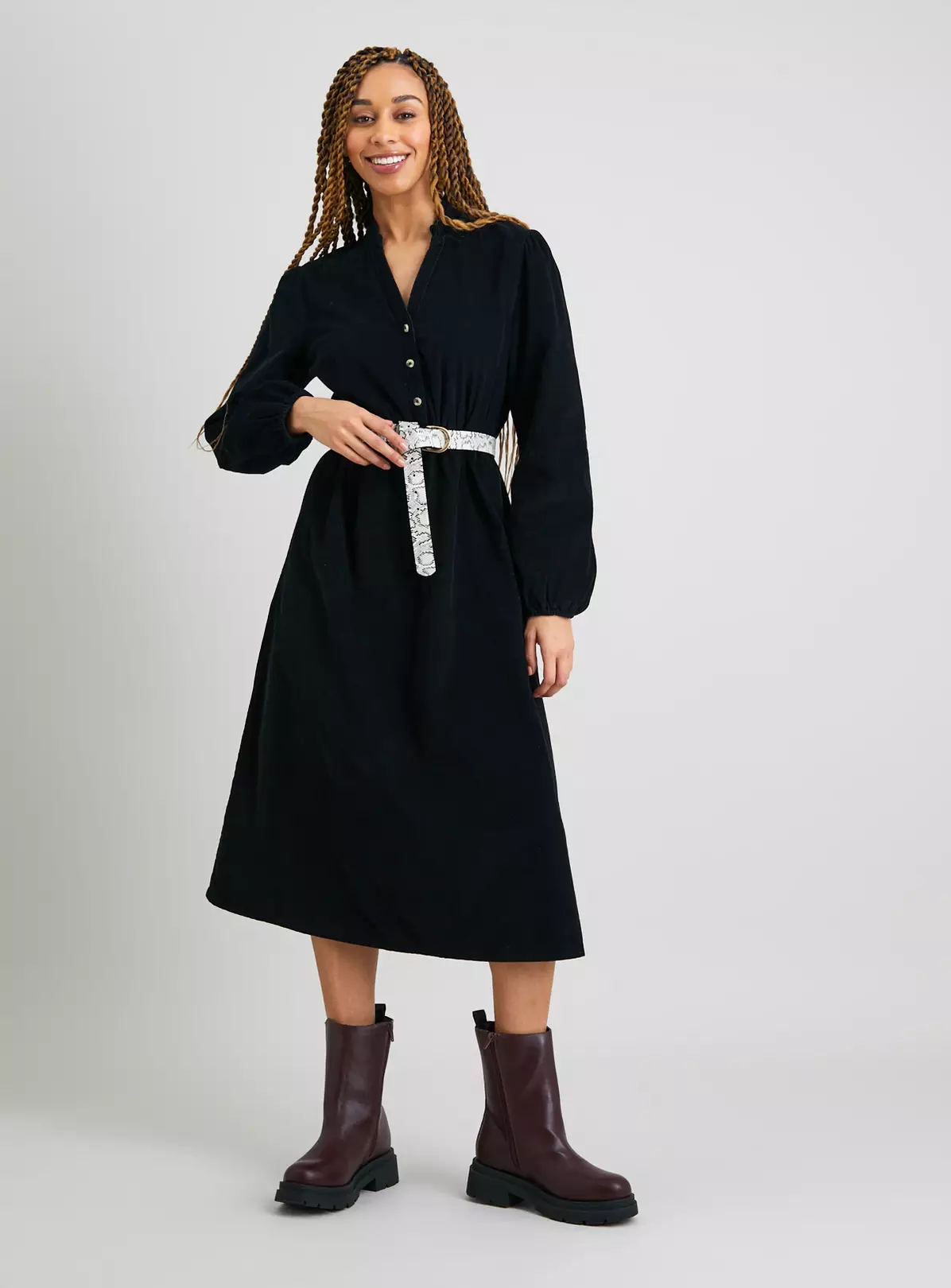 Our fabulous pure cotton cord shirt-style dress exudes effortless style and is so easy to wear. With a cute V-neck, it has three values to the bodice section, long flowy sleeves and a comfy elasticated waist. Available in other colours (including pink: style no: 141701581).