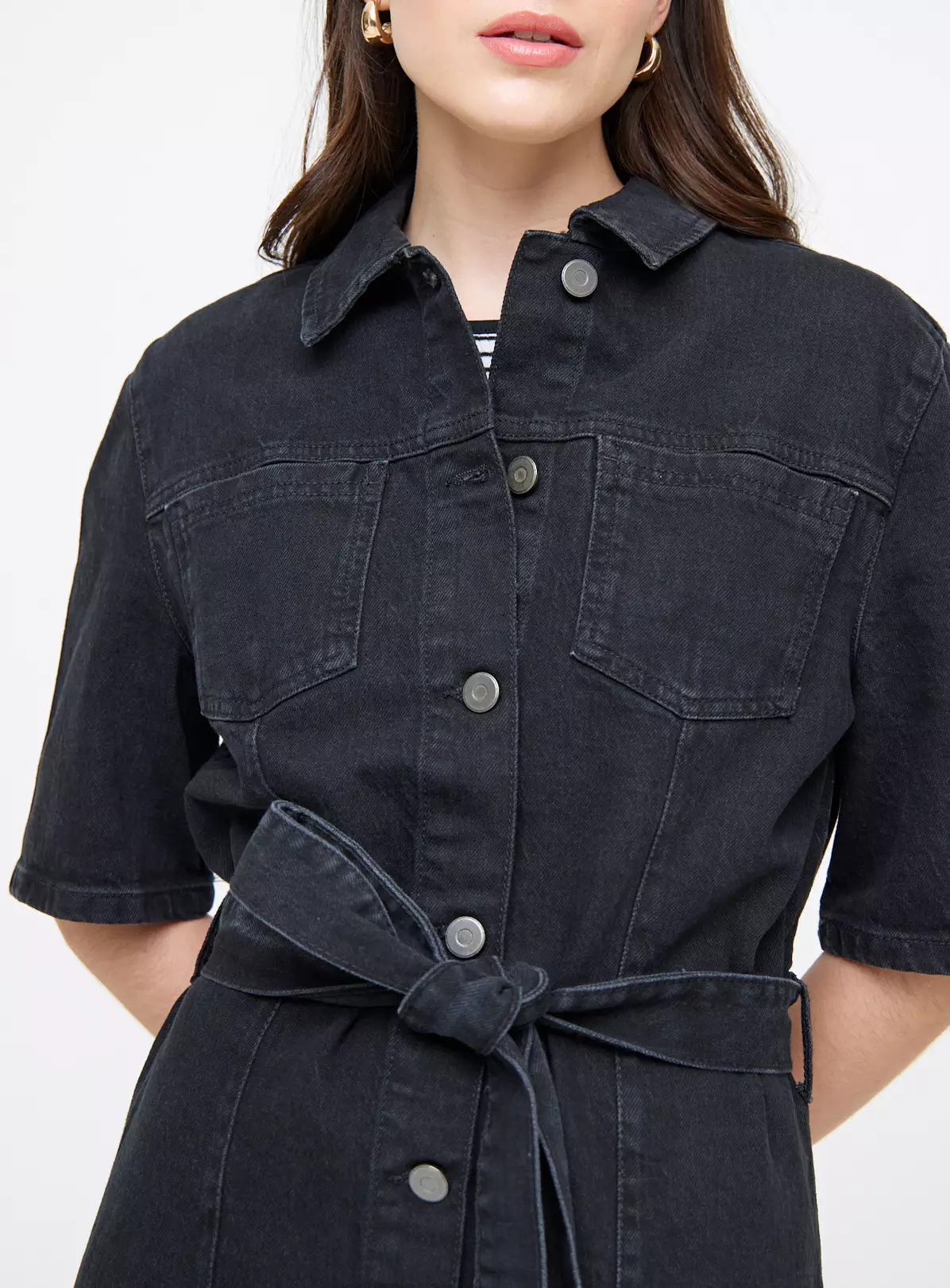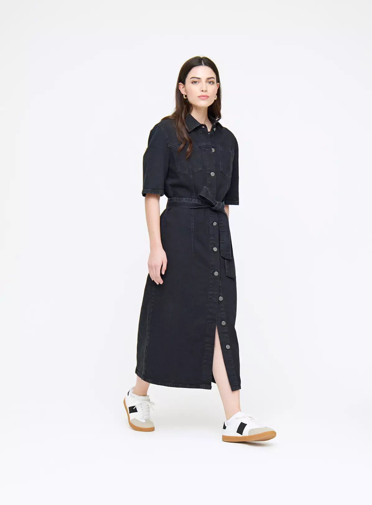 Stay on-trend this season with our denim black midi dress. Featuring a value-through front fastening, it has a tie-waist belt designed to accentuate your figure. Finish off your look with white trainers.