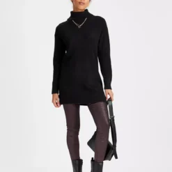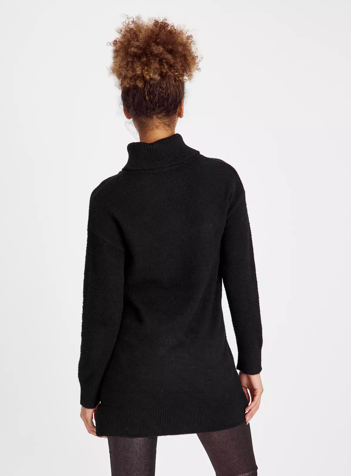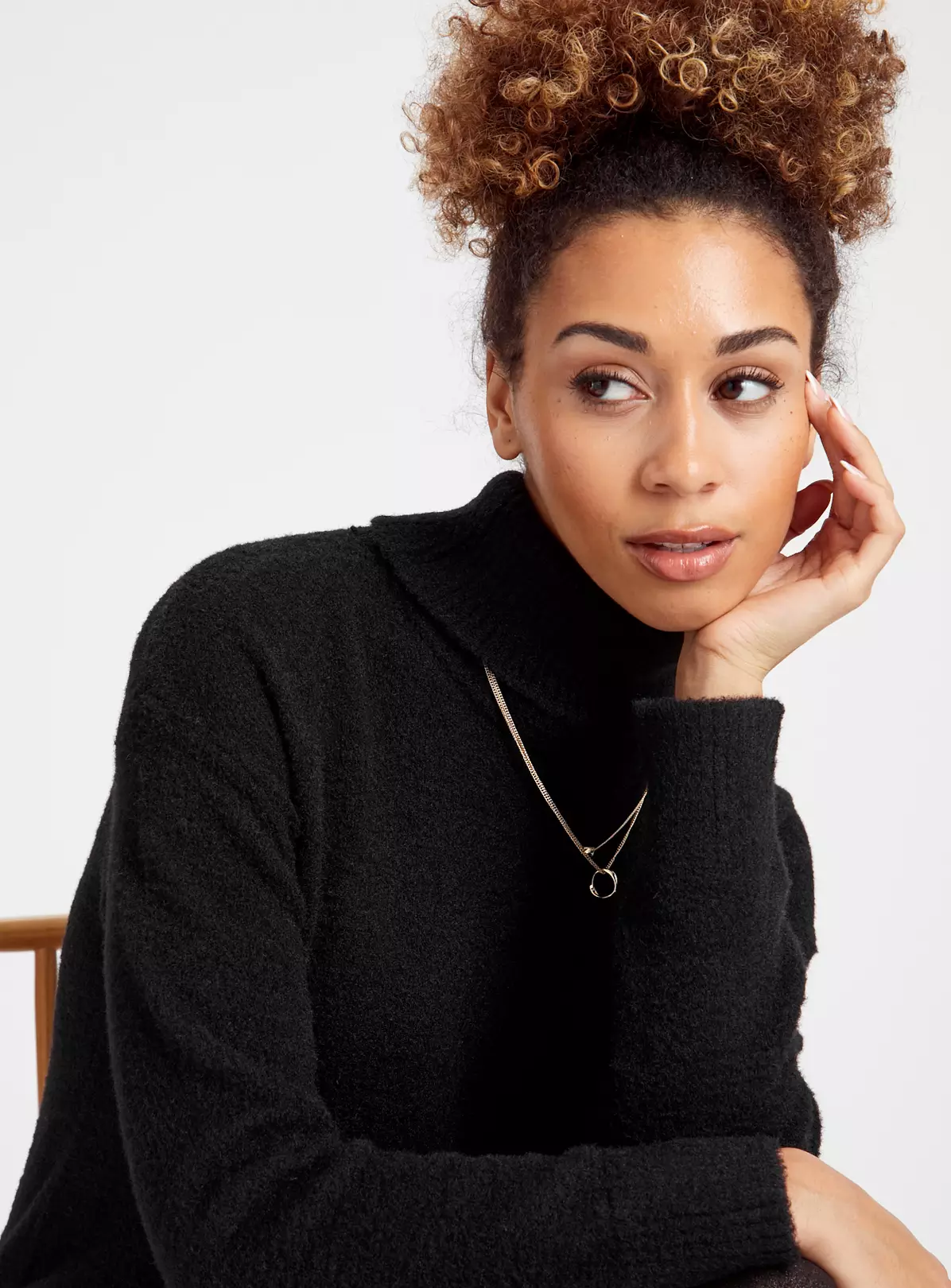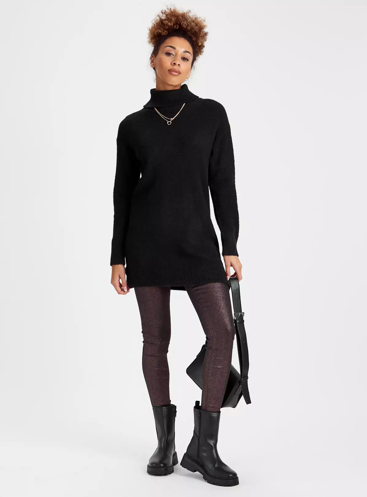 In a staple black, our gorgeous jumper dress is elevated by a flattering roll neck design and comes in a cosy knitted fabric. Style it with a pair of black leather boots for a chic work outfit.