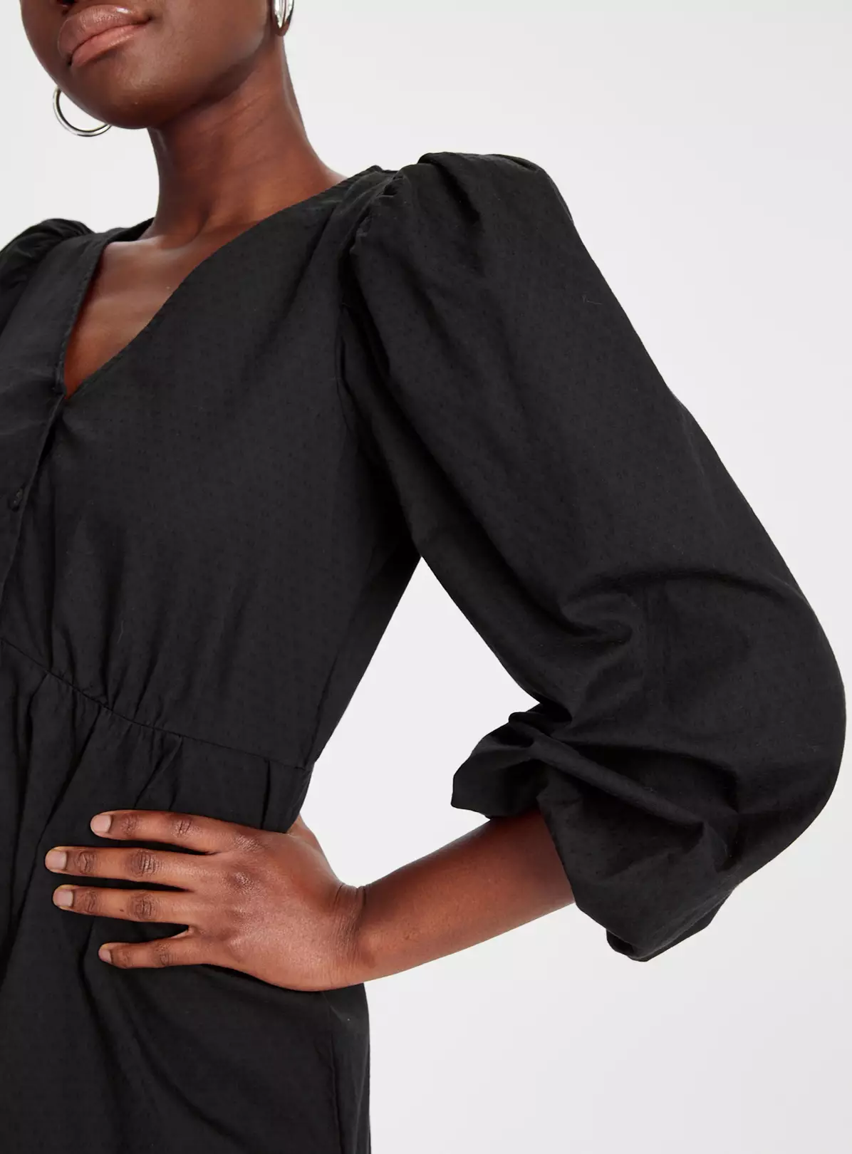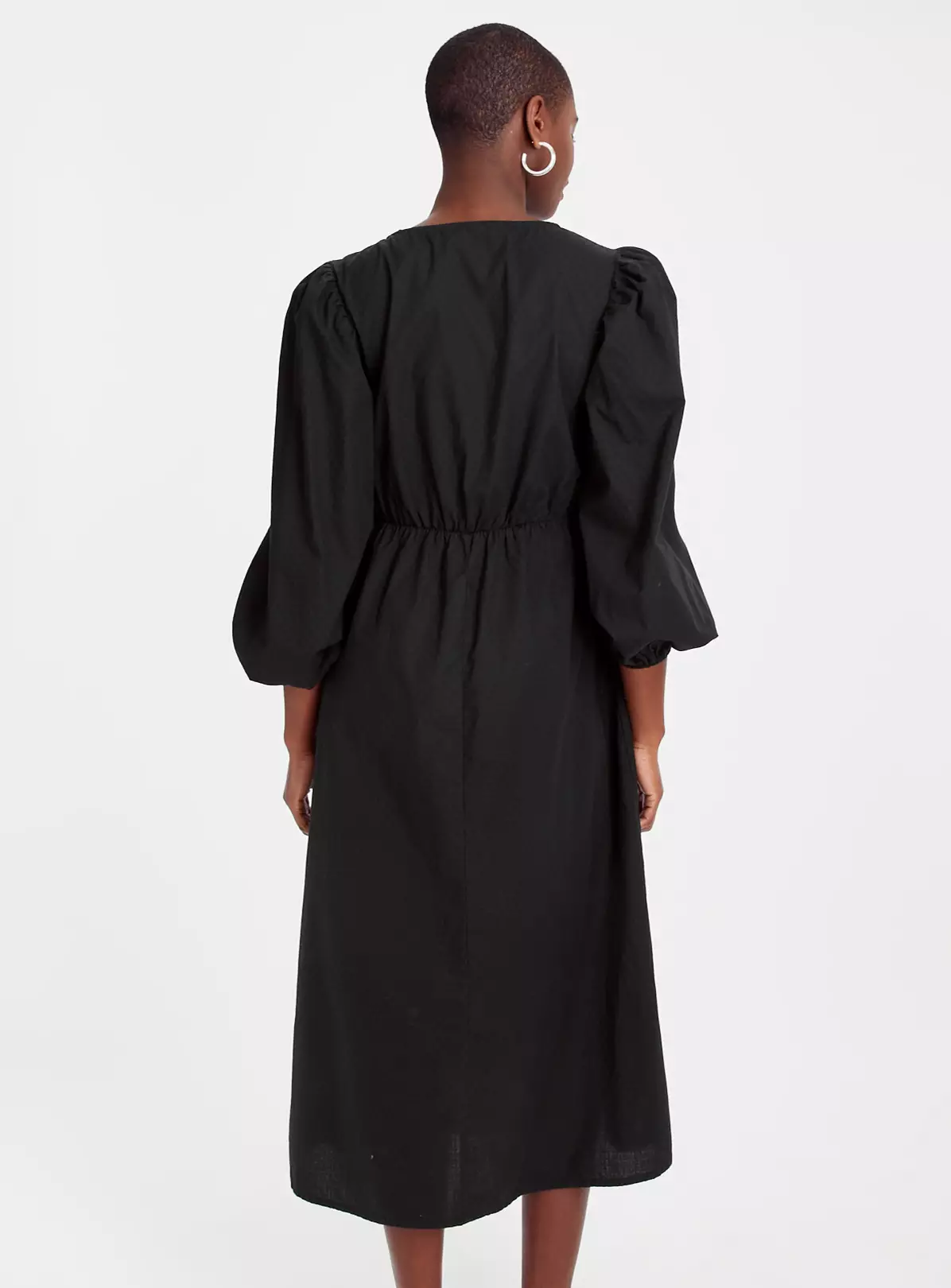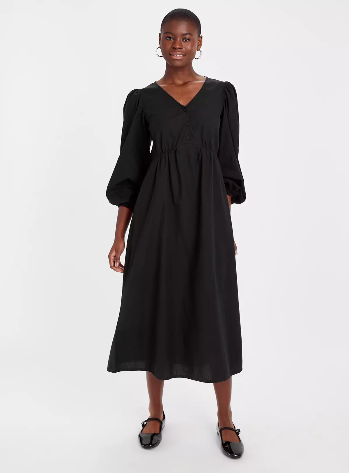 Our cute tea dress in classic black is the ultimate grab and go piece for when you just don’t know what to wear. Made from a soft, textured cotton, it has a V-neck with three values and boho-style floaty sleeves. Dress it up, or dress it down depending on how you feel. We love it!