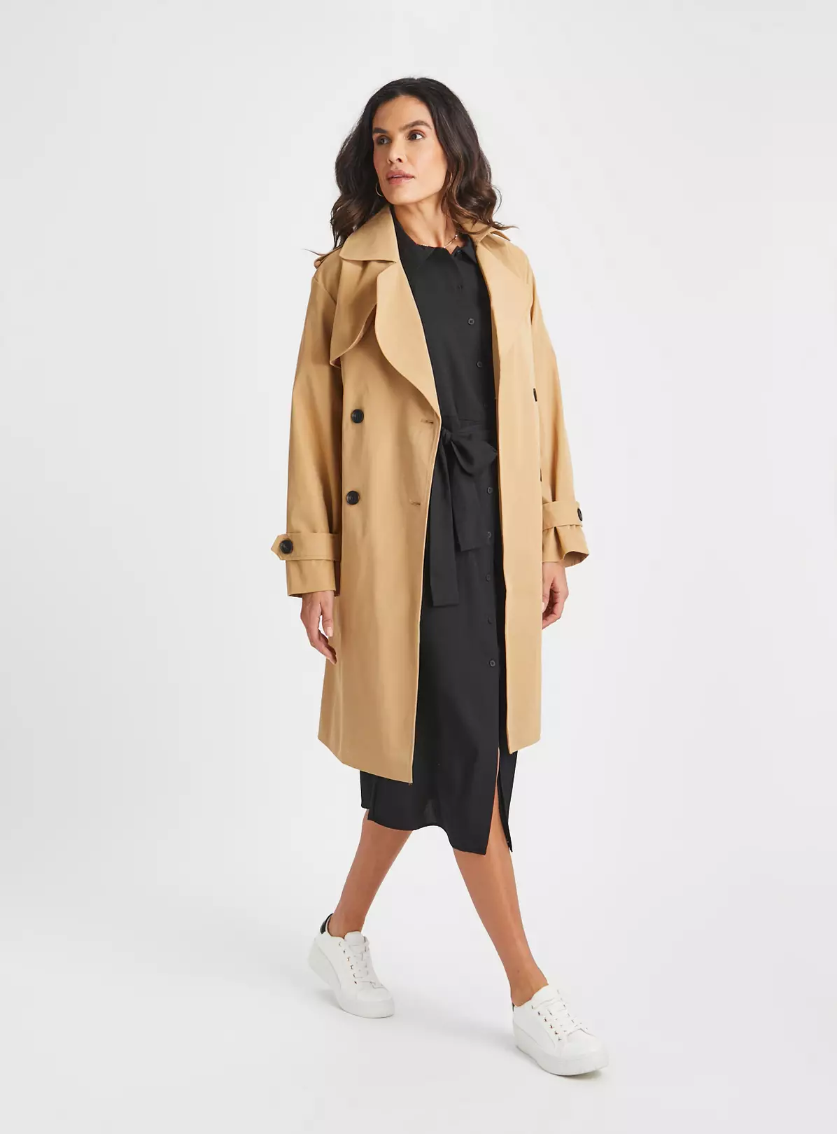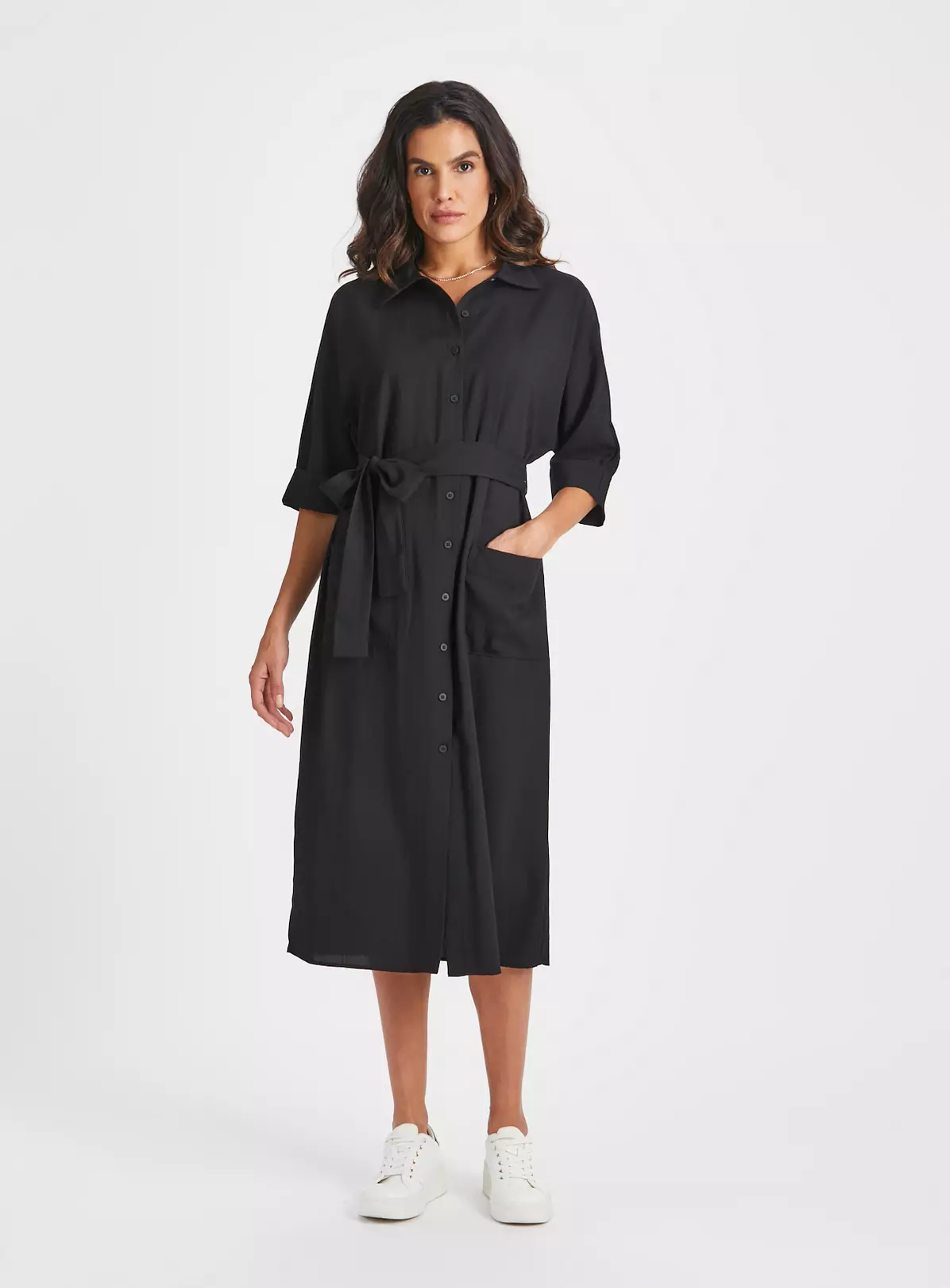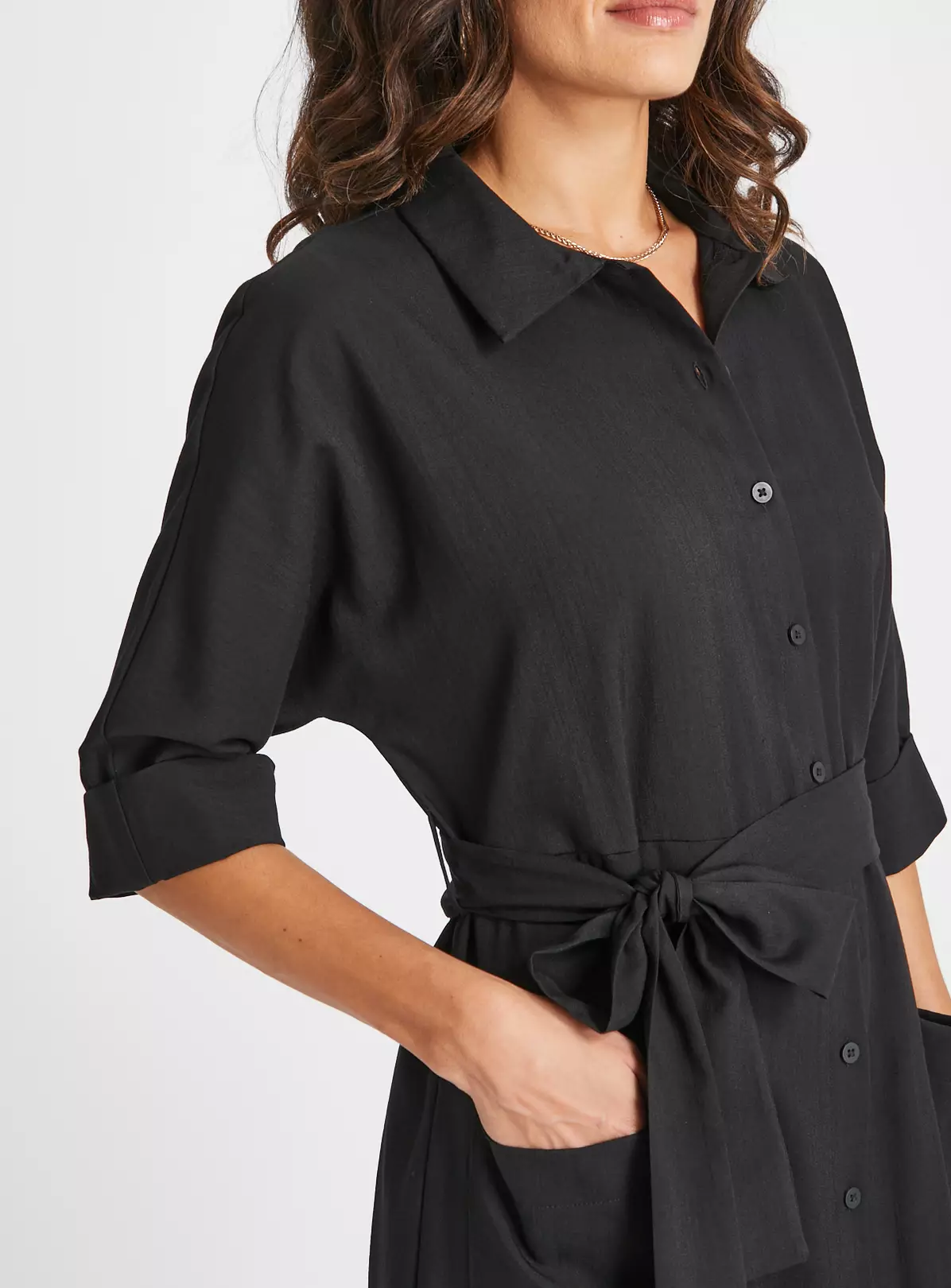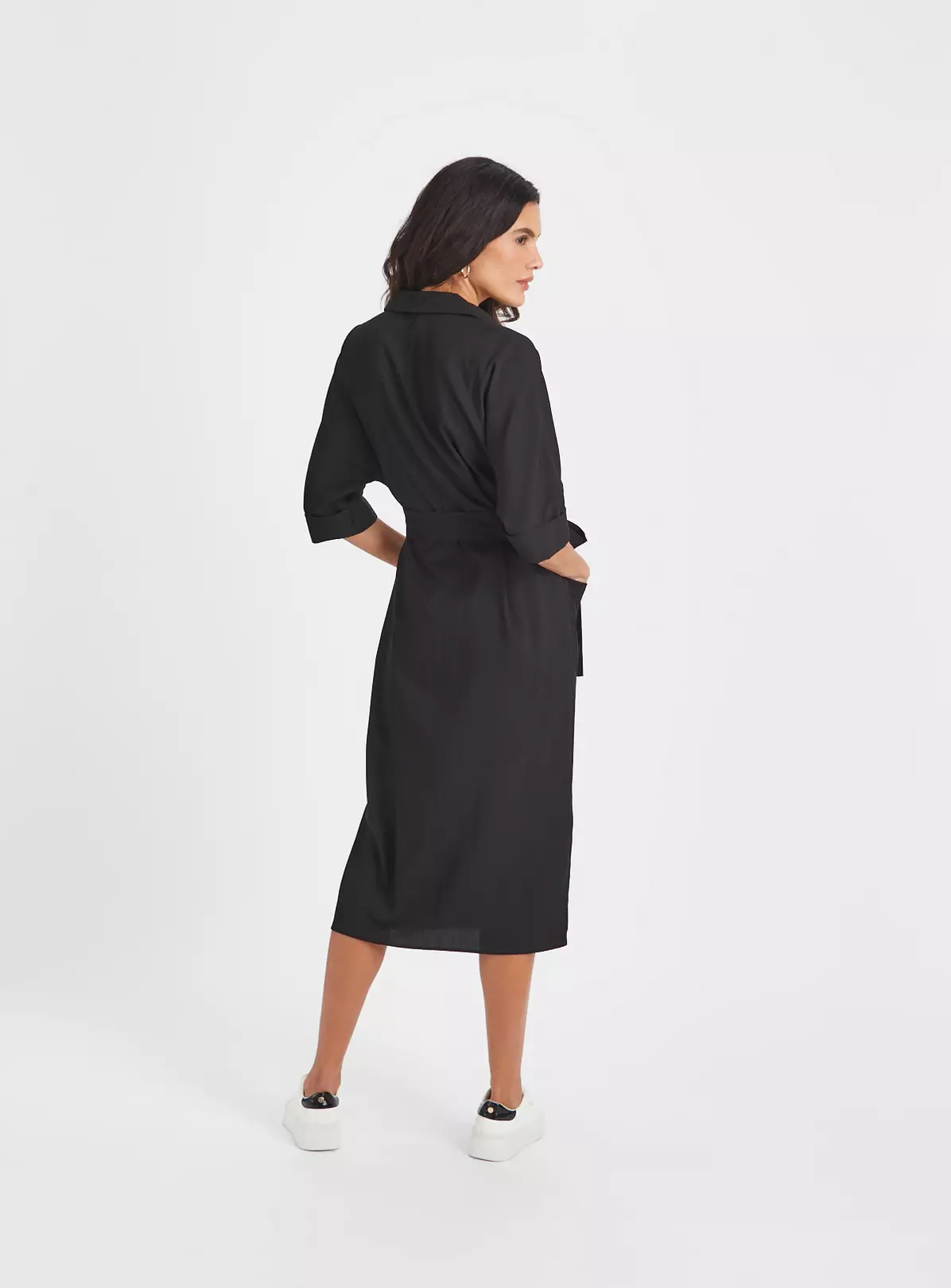 Our gorgeous shirt dress in classic black is perfect for spring. Featuring a flattering tie-waist, a collar and two handy pockets. Pair with white trainers to complete the look.