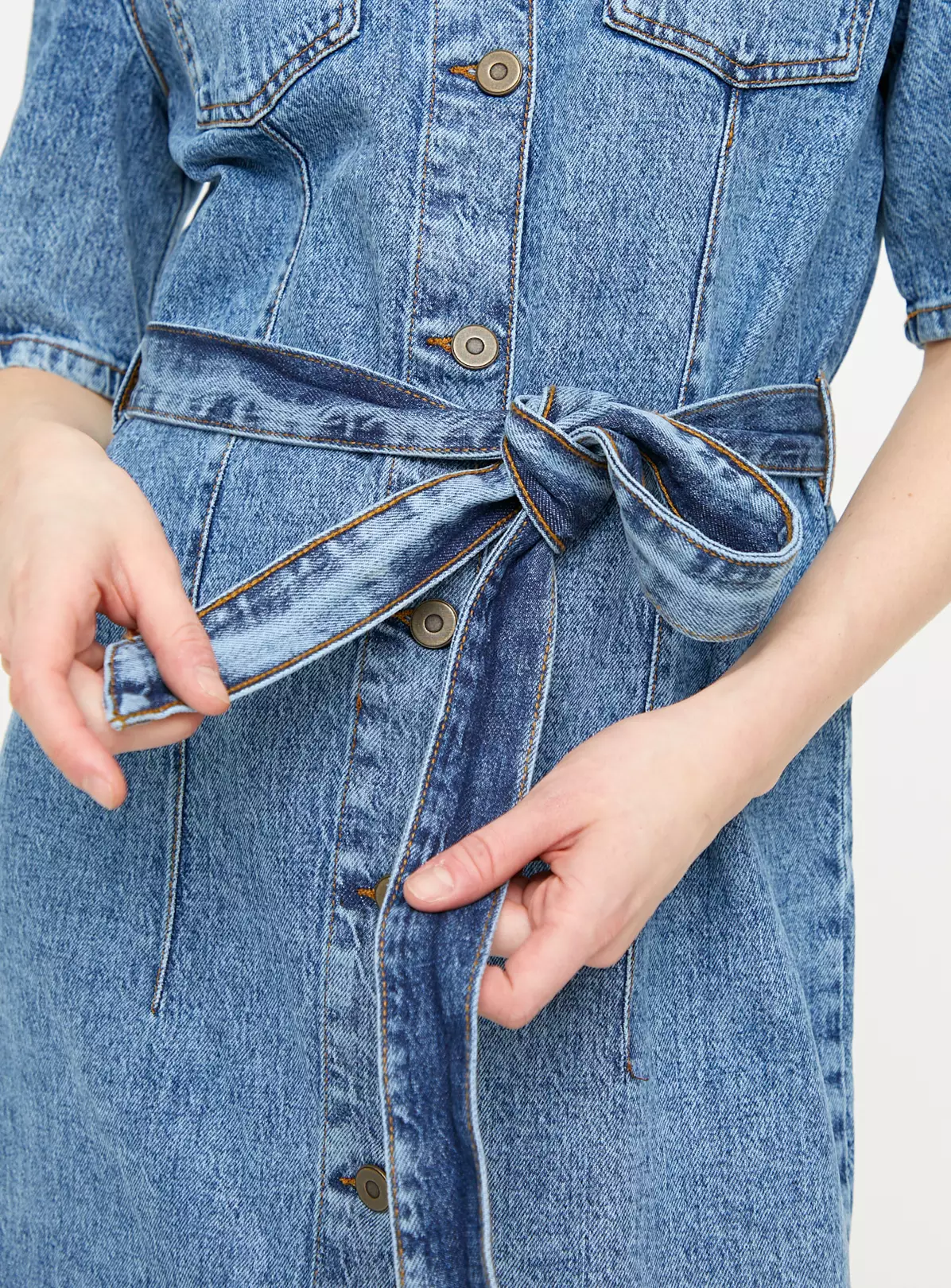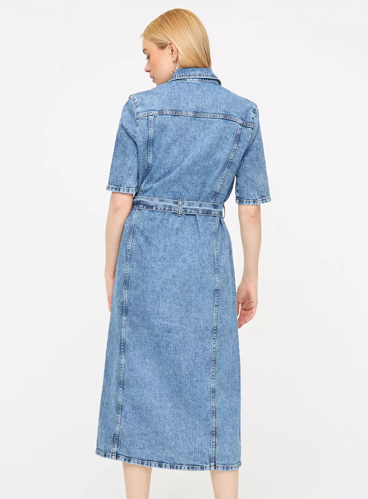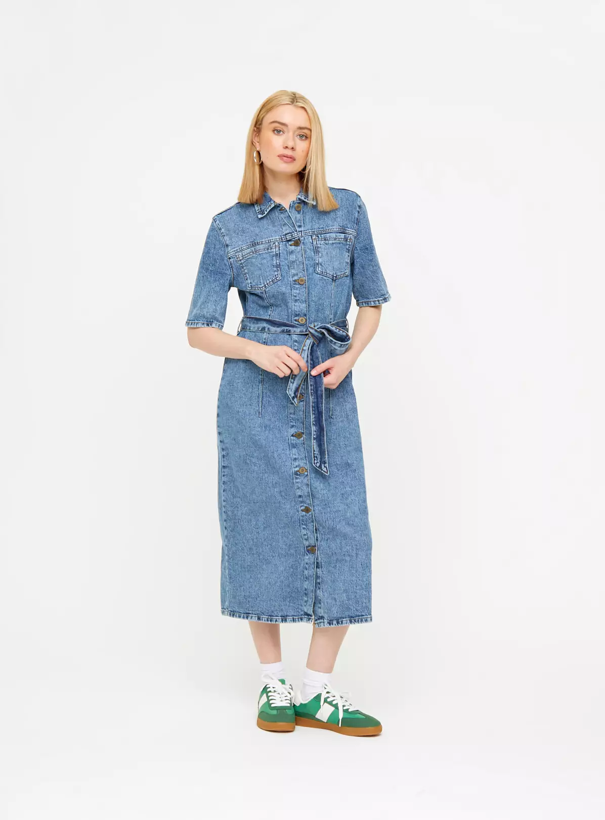 Stay on-trend this season with our denim blue midi dress. Featuring a value-through front fastening, it has a tie-waist belt designed to accentuate your figure. Finish off your look with statement green trainers and socks.