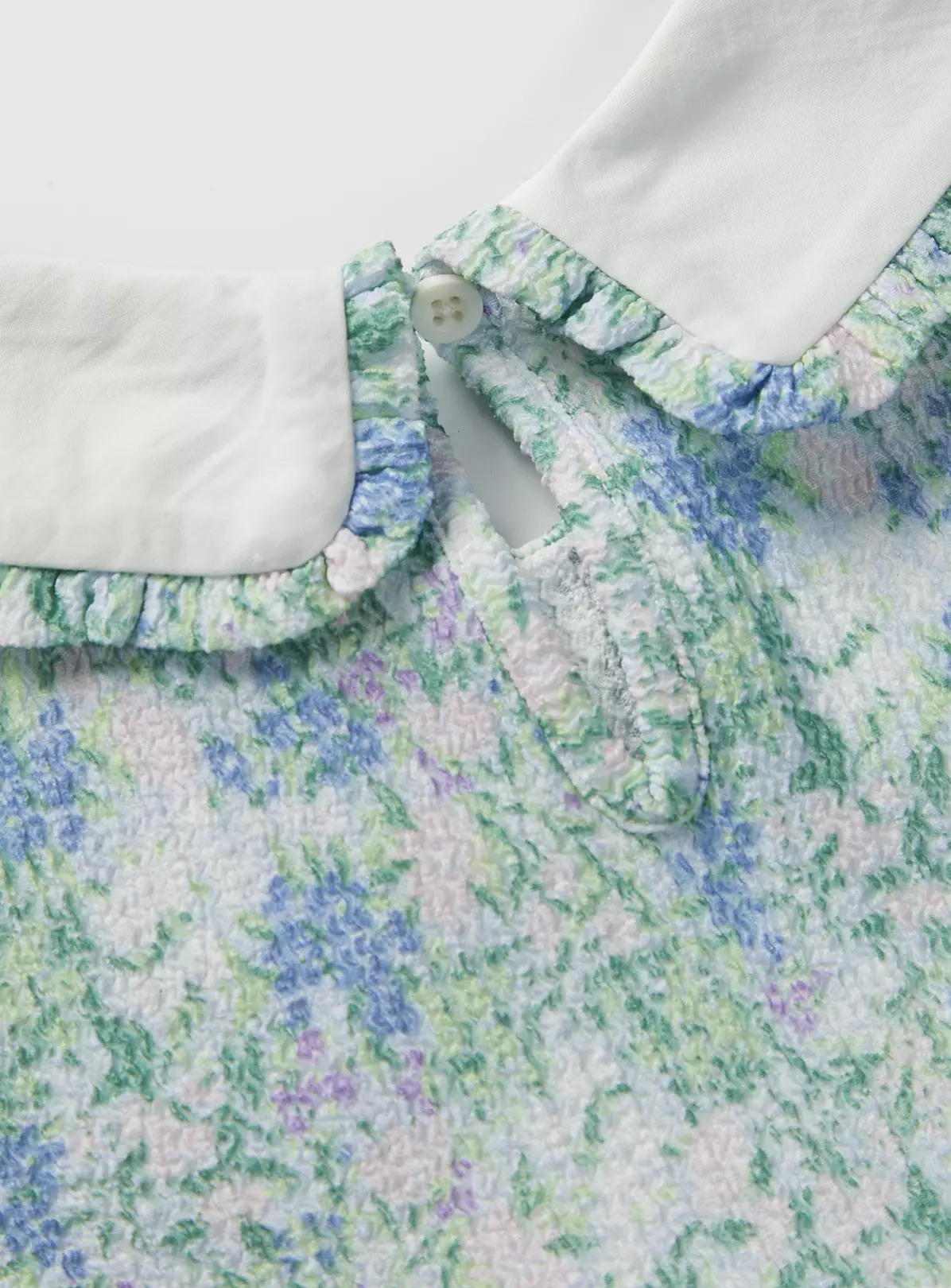 They’ll love this dreamy blue floral dress. In a crinkled fabric and with a statement collar, it comes in a jersey fabric with added stretch. Team with the coordinating pink tights on cooler days for a super pretty combo.