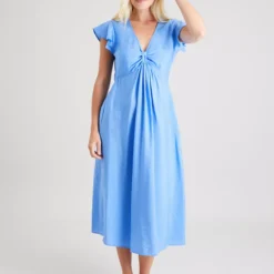 Get ready for sunny days with this gorgeous blue midi dress. It has short frill sleeves, ruched v neckline and made in a breezy lightweight fabric. Made for comfort and style, its perfect for strolling along the beach or even enjoying a summer picnic. Pair it with your favourite sandals or wedges for an effortlessly chic look!