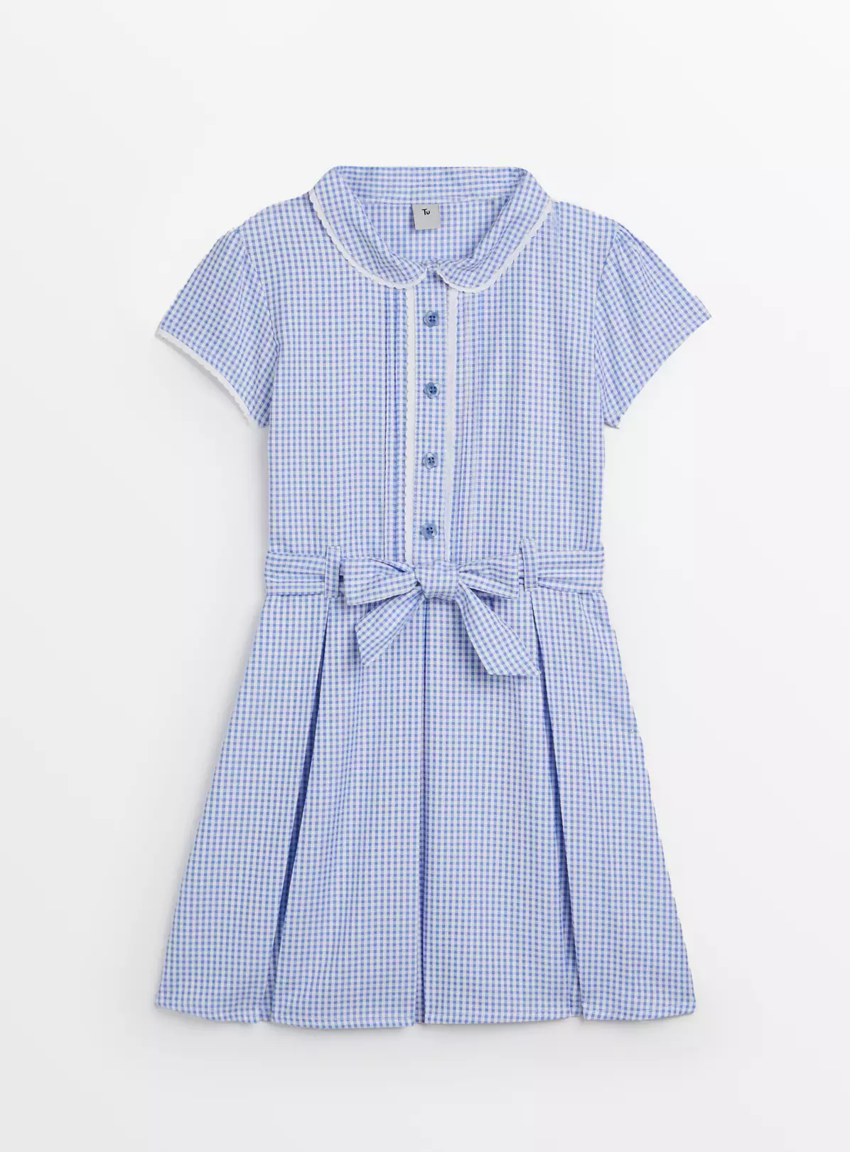 Coated with Teflon EcoElite for extra stain resistance, our easy iron, cotton rich blue gingham dress will keep its looks no matter hard they work and play. With a box pleated skirt, a pretty tie bow at the front and a lace trim, it’s perfect for everyday school wear on warmer days. And with the dress with ease one touch fastening to the waist, they’ll be ready in a flash. Available in several colours.