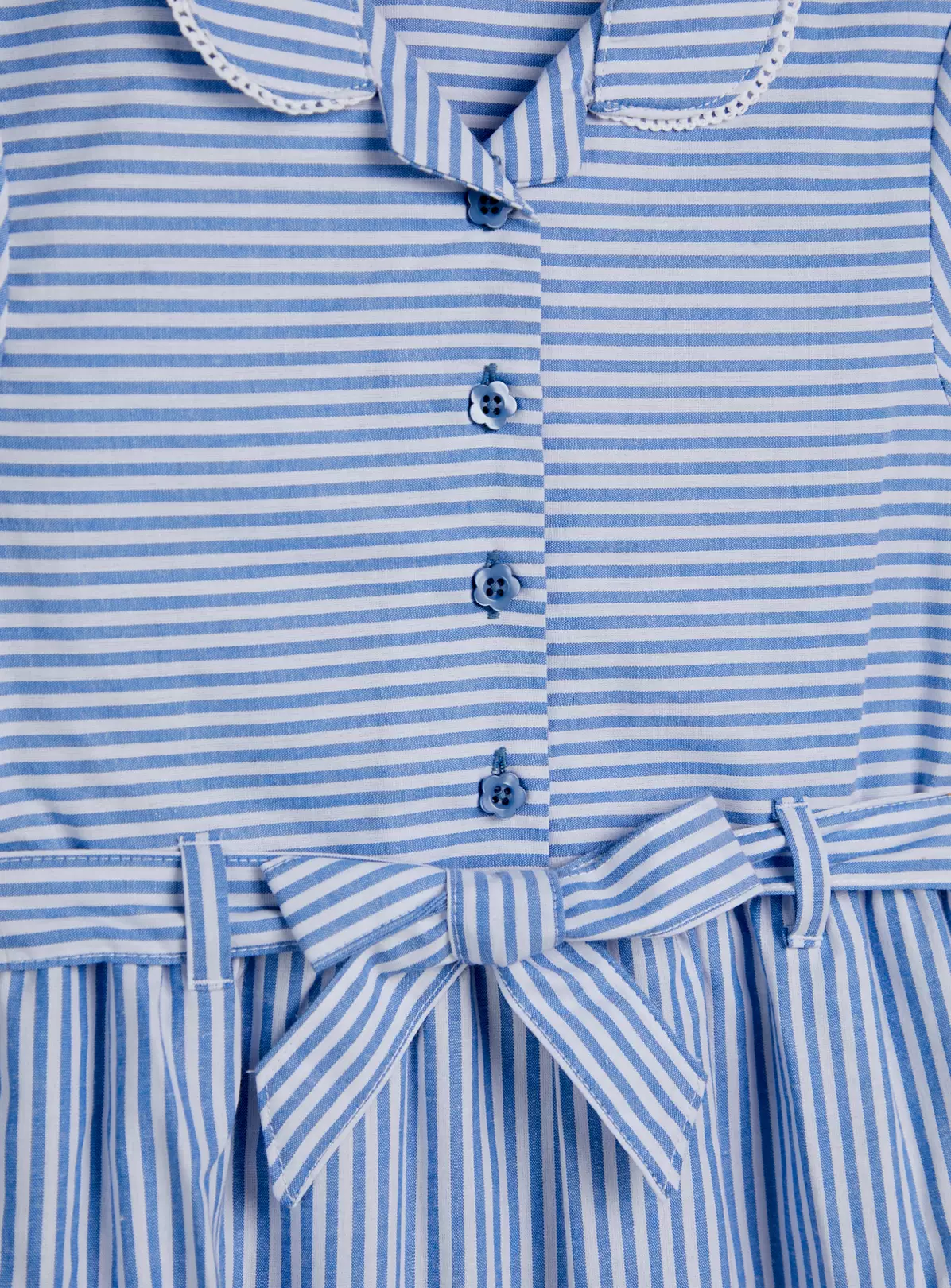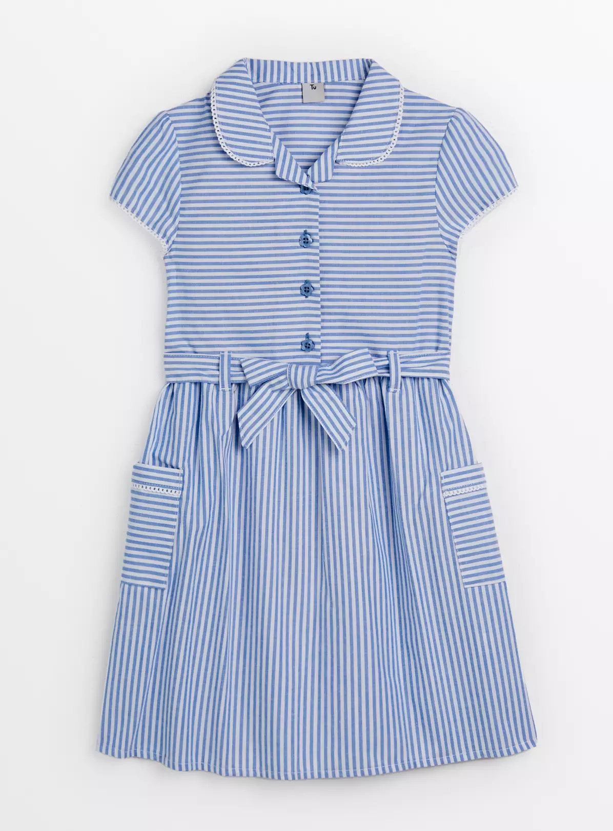 Coated with Teflon EcoElite for extra stain resistance, our easy iron, cotton rich stripe dress will keep its looks no matter what school ground japes your kids put it through. With a gathered skirt, a bow tie-belt to the front and a pretty scalloped edged collar, they are perfect for everyday school wear on warmer days. Available in other colours.