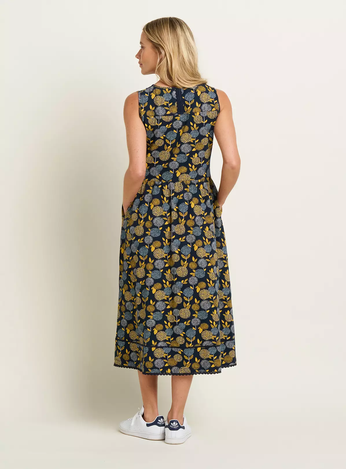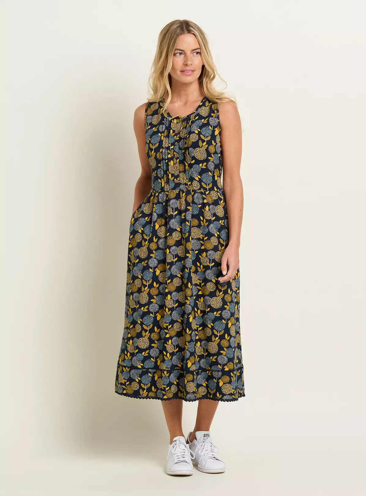 We like big blooms, and we cannot lie. This sleeveless, a-line midi dress, the Luna is far from ordinary. Showcasing a bold pattern of big blooms in navy blue and yellow, it’s versatile but full of personality. Its pockets, subtle pleats, little bits of lace trim, and a floaty, flattering skirt make for an incredibly comfortable summer dress. Also available in this range: wrap dress, t-shirt.