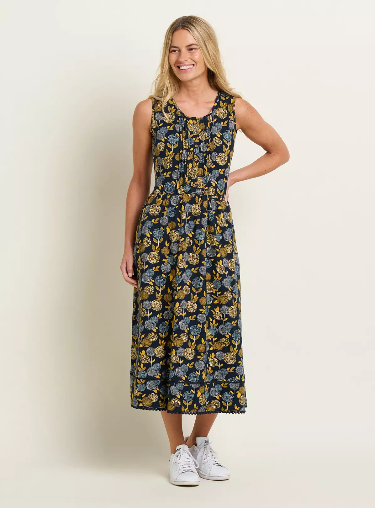 We like big blooms, and we cannot lie. This sleeveless, a-line midi dress, the Luna is far from ordinary. Showcasing a bold pattern of big blooms in navy blue and yellow, it’s versatile but full of personality. Its pockets, subtle pleats, little bits of lace trim, and a floaty, flattering skirt make for an incredibly comfortable summer dress. Also available in this range: wrap dress, t-shirt.