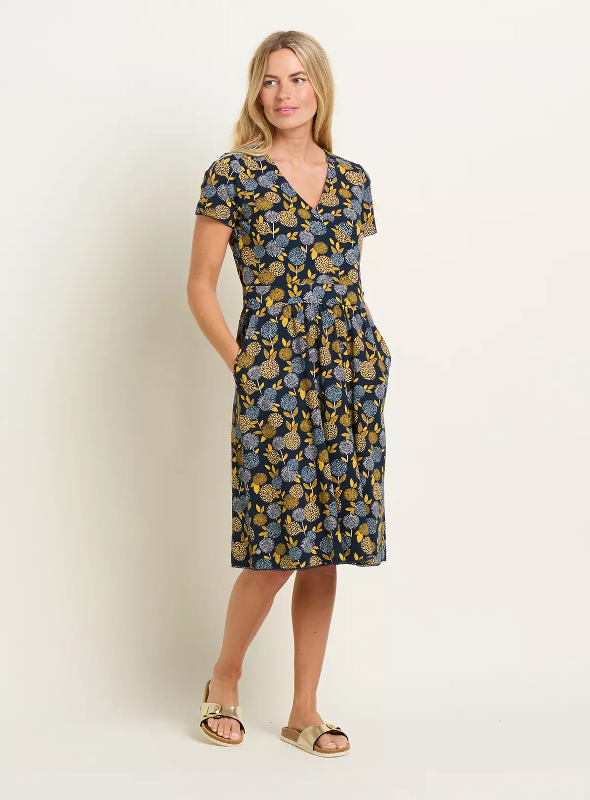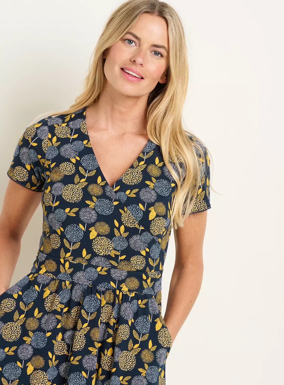 Bloom where you are planted with the Luna jersey wrap dress. Featuring a bold, navy blue and yellow floral printed pattern, this dress has a wrap neckline, cap sleeves, a ruched side waistband and a flattering fit and flare skirt. Pockets and lace trim on the sleeve, hem and back elevate this day dress from everyday to essential. Also available in this range: sleeveless dress, t-shirt.