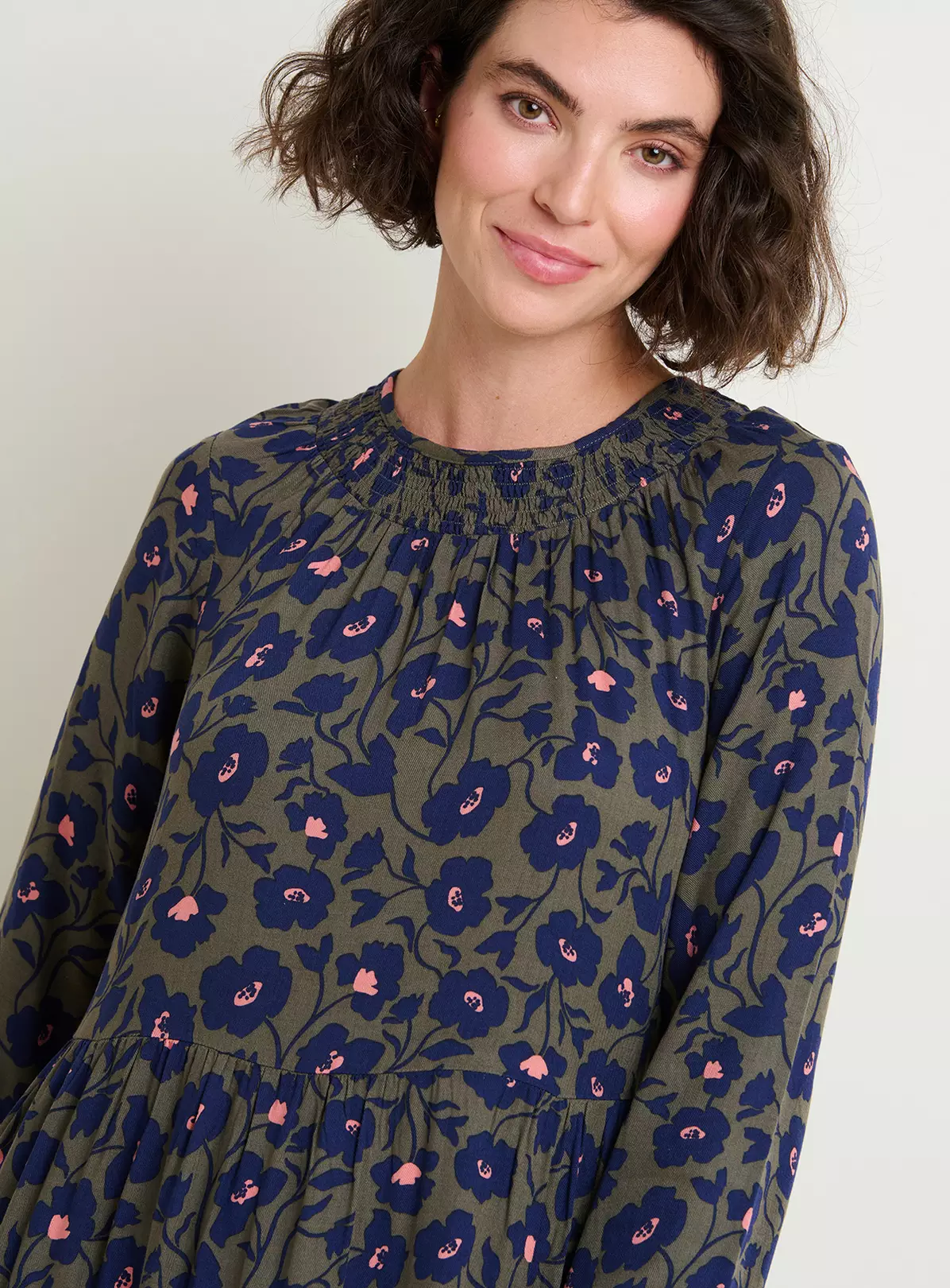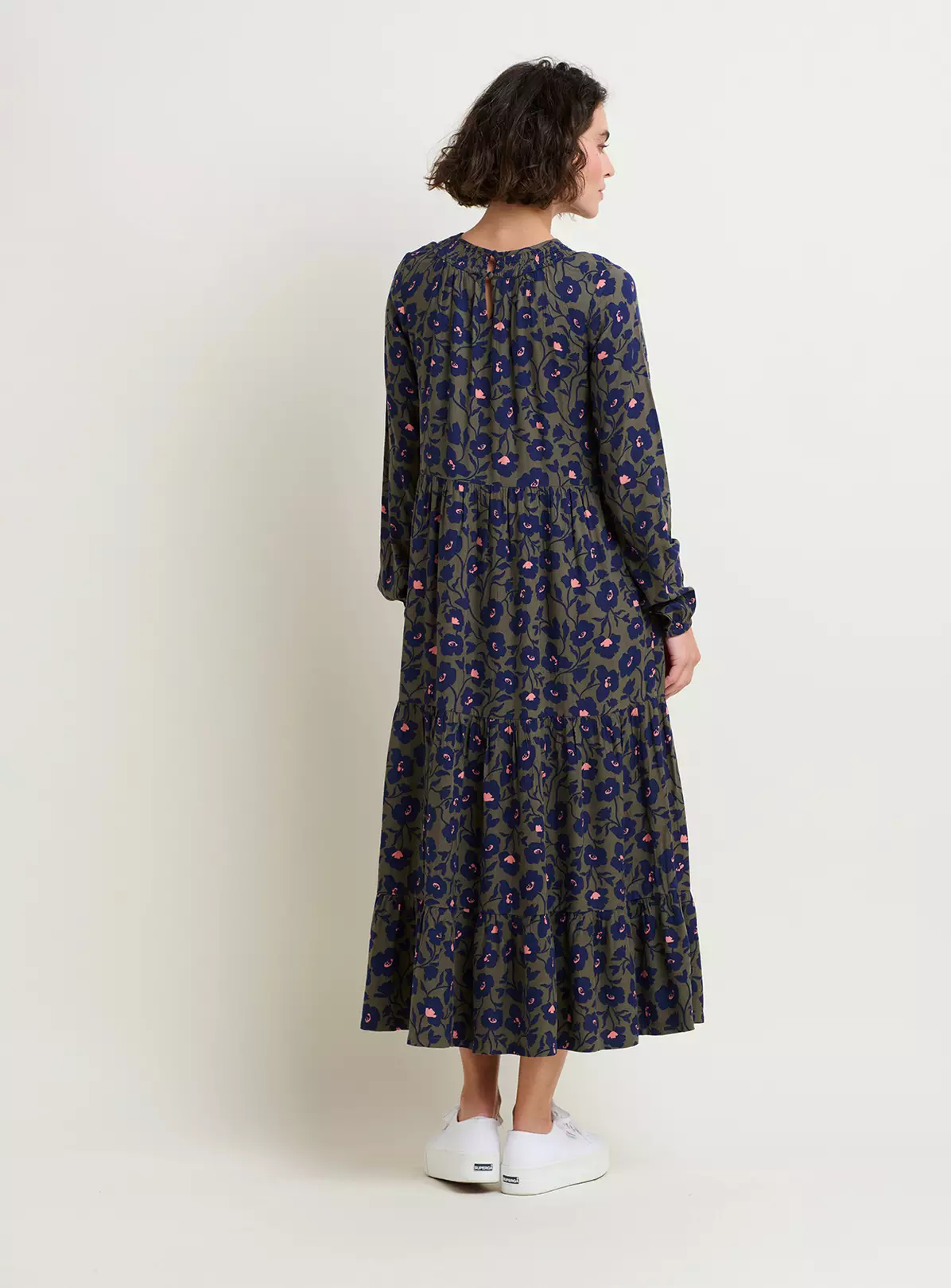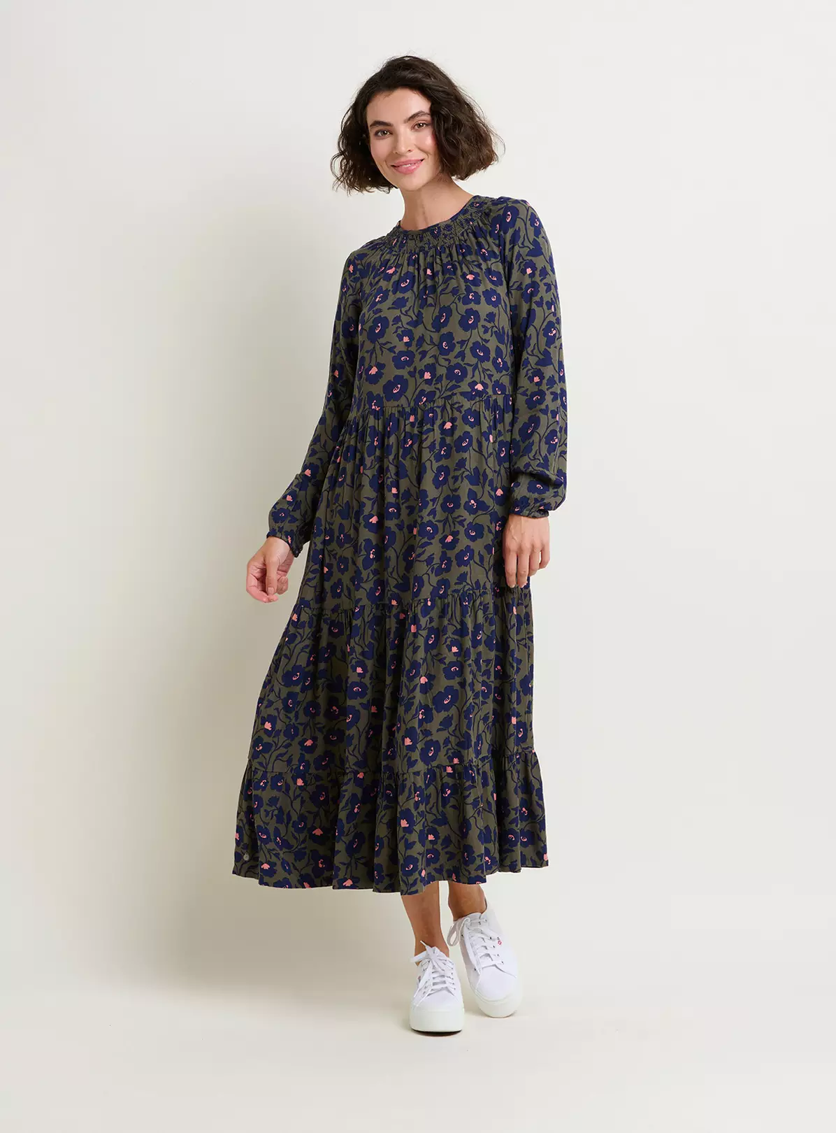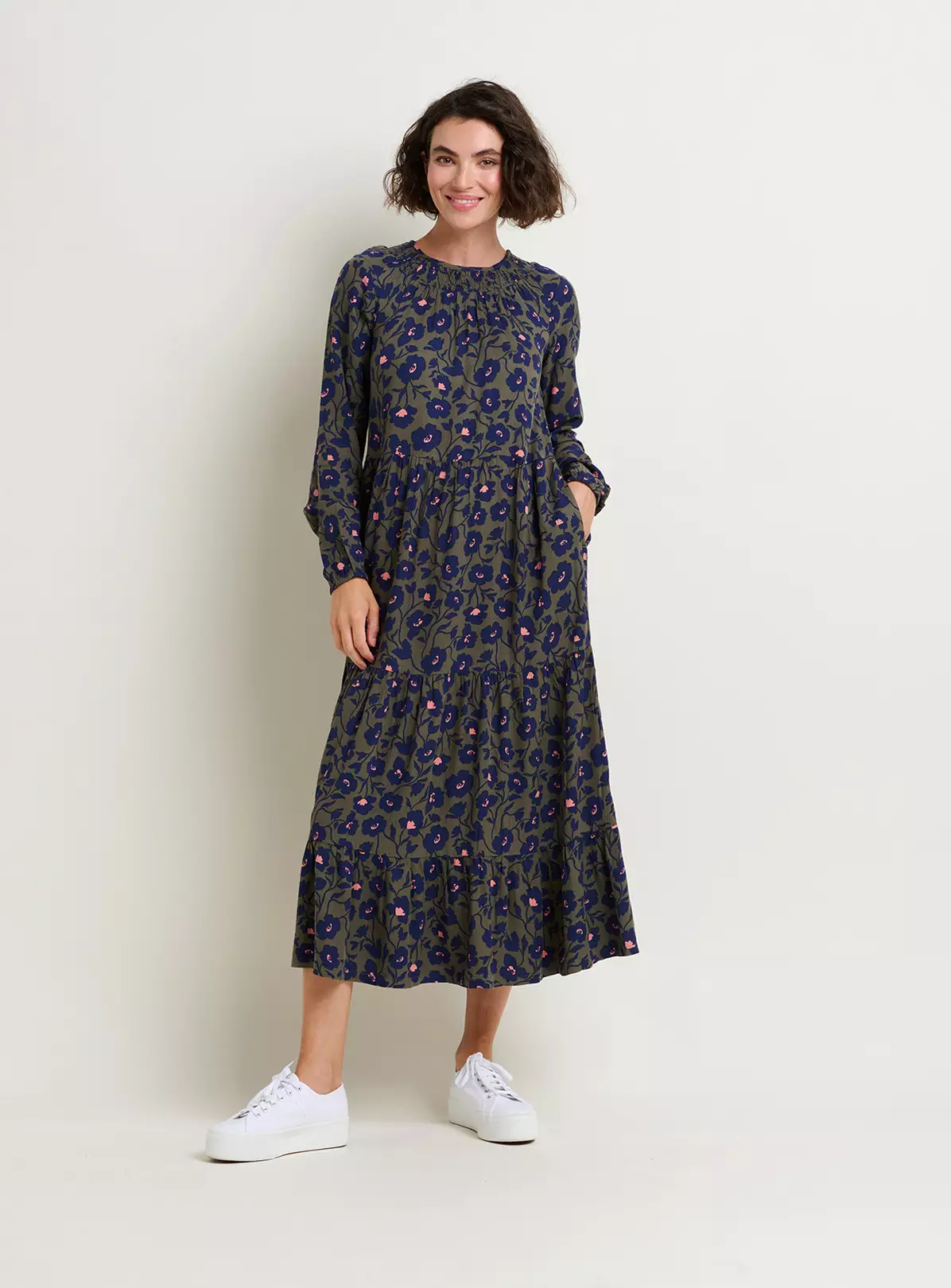 An elegant autumnal must have, this viscose maxi dress boasts shape with a round neck, shirring panel and elasticated sleeve cuffs. The tiered skirt is flattering and floaty, while also warm enough to wear during the colder months. It also features convenient side pockets for practical everyday wear.
