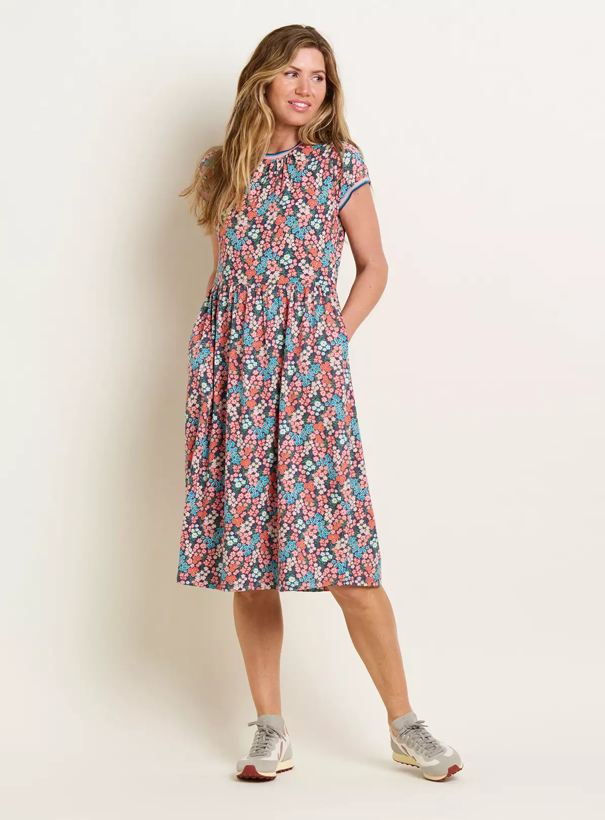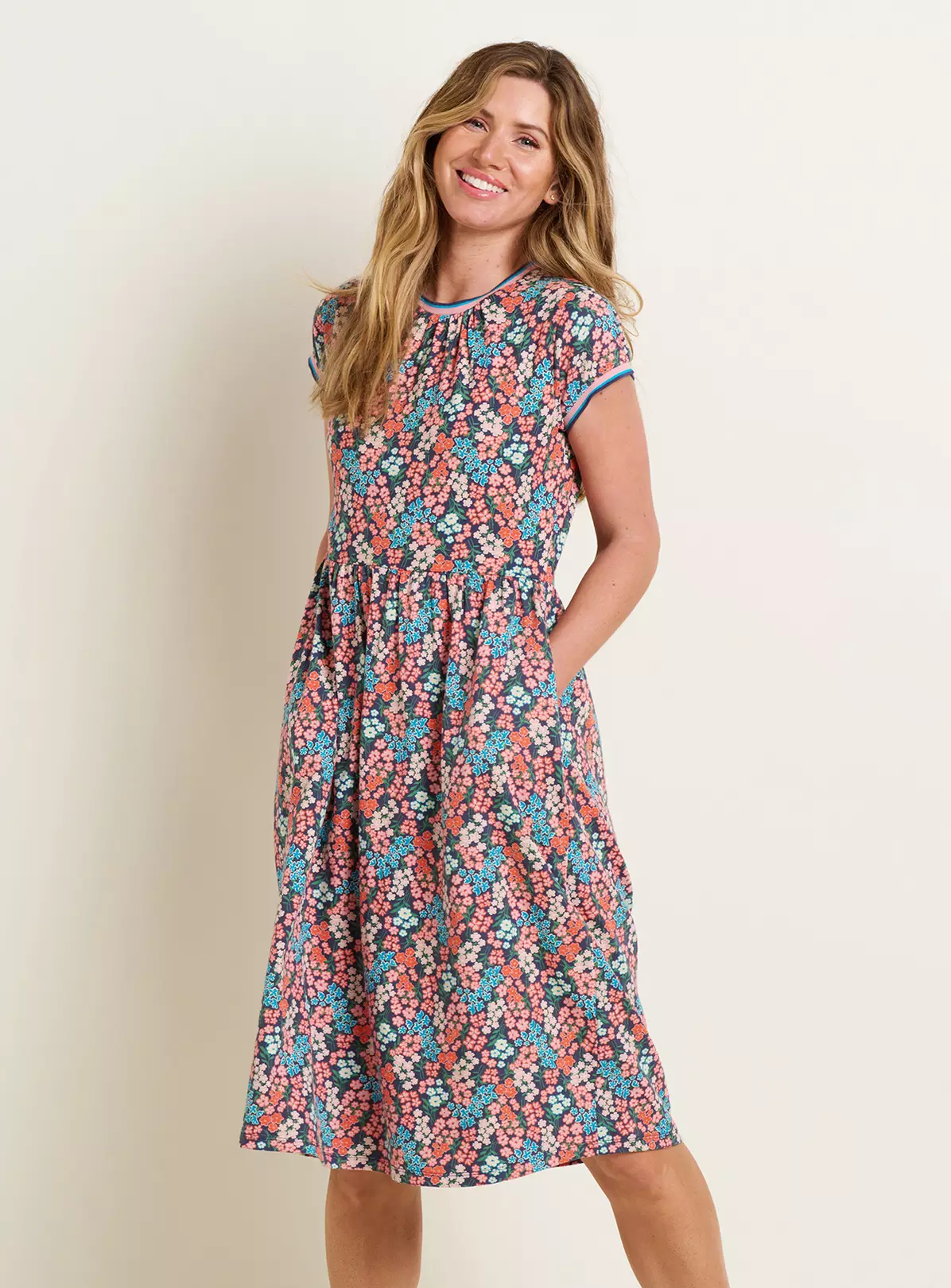 If you’re looking for a floral a-line jersey dress, check out the Millie midi dress. This day dress with pockets has a colorful flower print with striped contrasting cuffs and neckline for a laidback, retro style. Wear with sandals and lightweight cardi or chunky white trainers for a sporty summer look. Also available in this range: sleeveless dress and top.