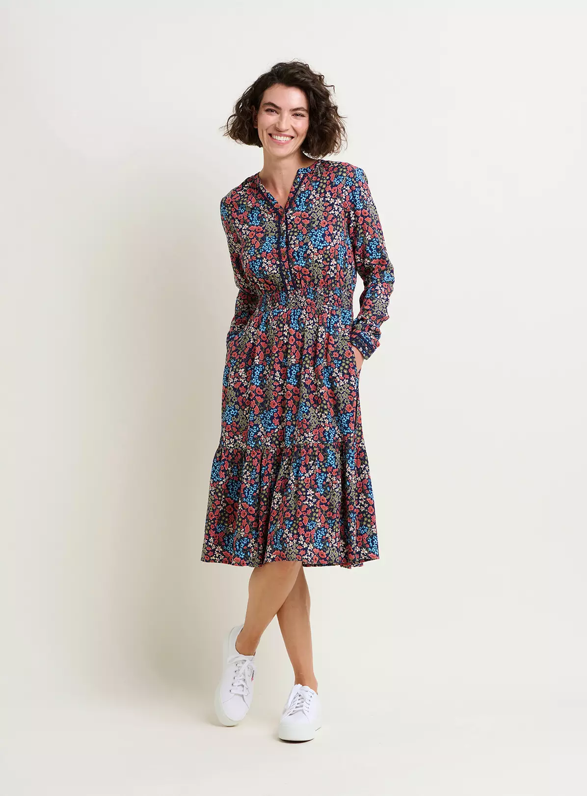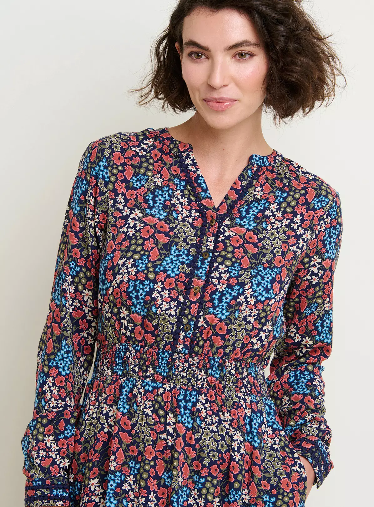 Bring the autumnal glamour in this long sleeve floral midi dress featuring a notch neck and midi-length, perfect for versatile styling. The full-length sleeves and shirred waistband add a flattering touch, while the viscose fabric offers a soft and comfortable fit. It features a decorative trim around the neckline and cuffs adding a charming finish to complemnt the print, and it also has pockets.