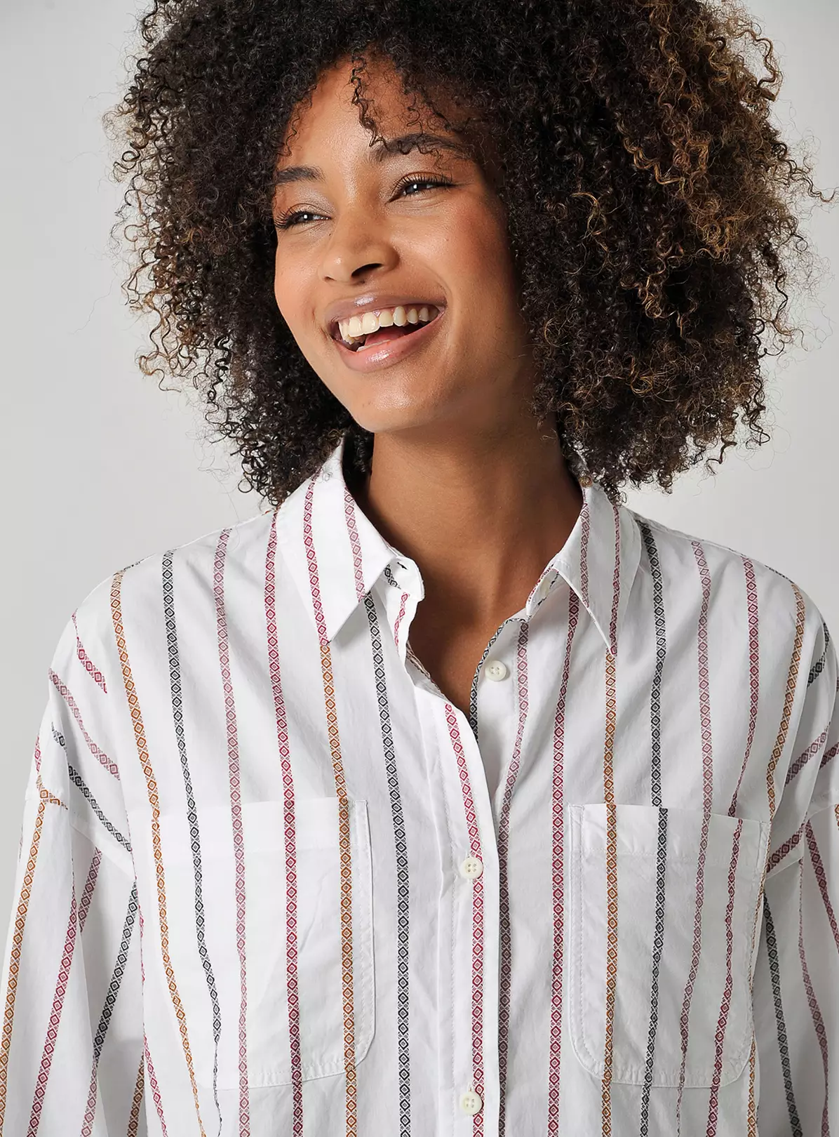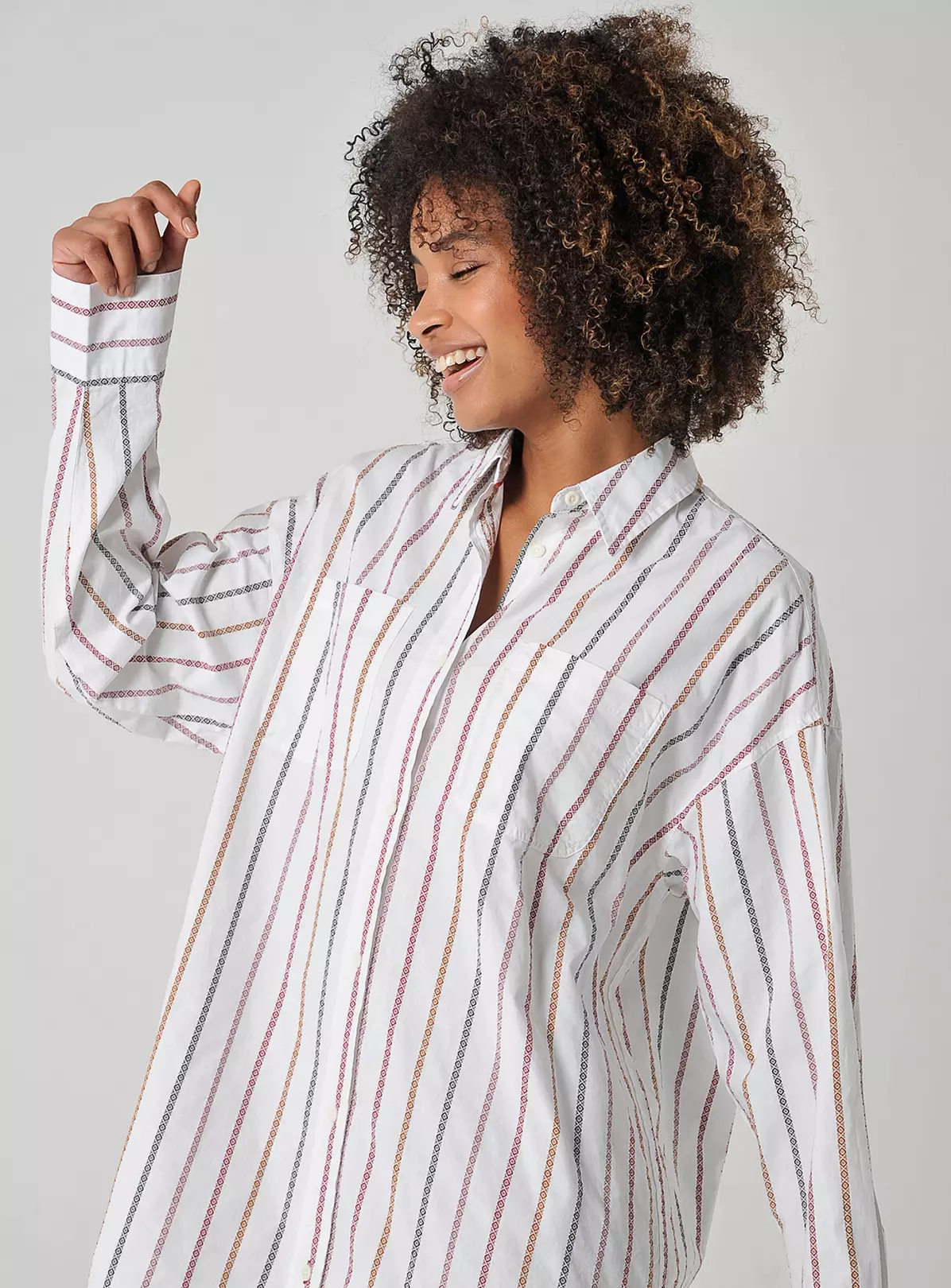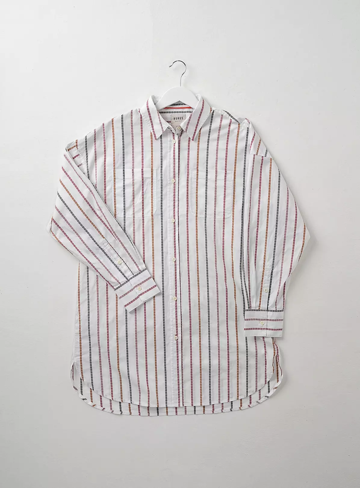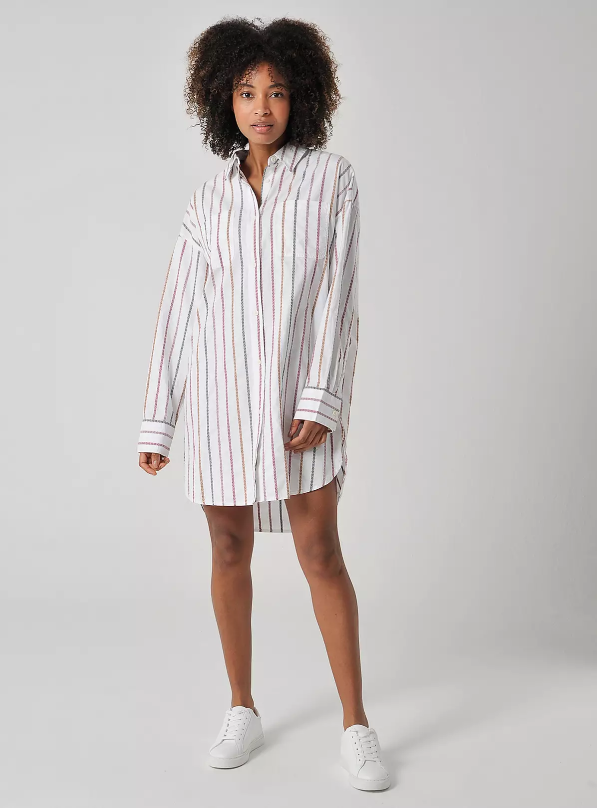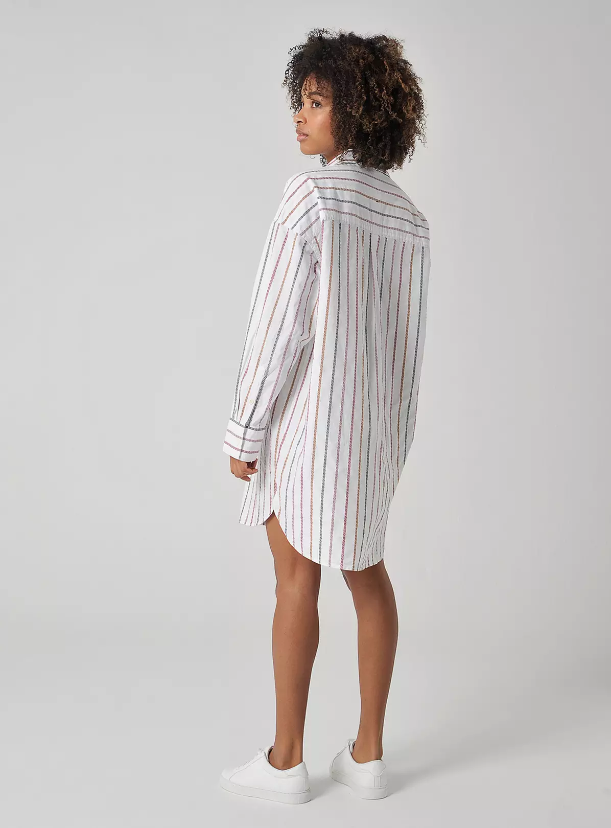 Our Anderton Dobby stripe shirt dress is designed to be worn in an effortless and fun way. This iconic shape can be worn as a dress or worn un-valueed as an oversized shirt layered with our everyday cove jersey tee. This vibrant stripe inspired our love for colour.Across our product range, we only use recycled and recyclable labelling and packaging.