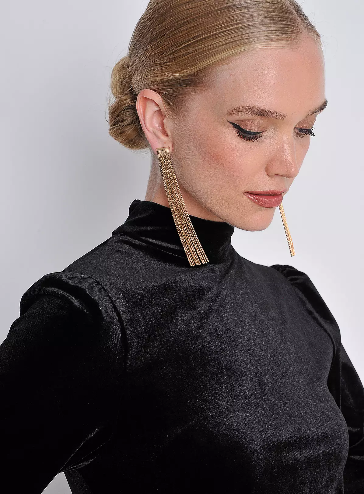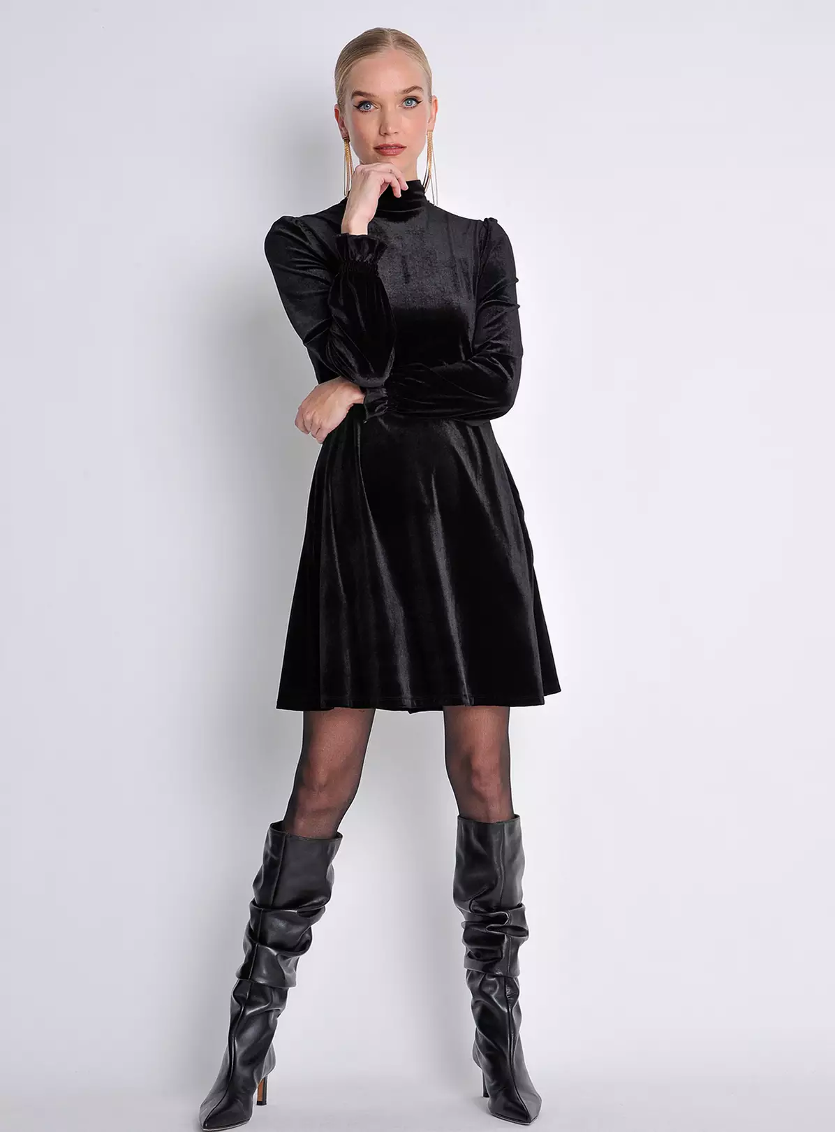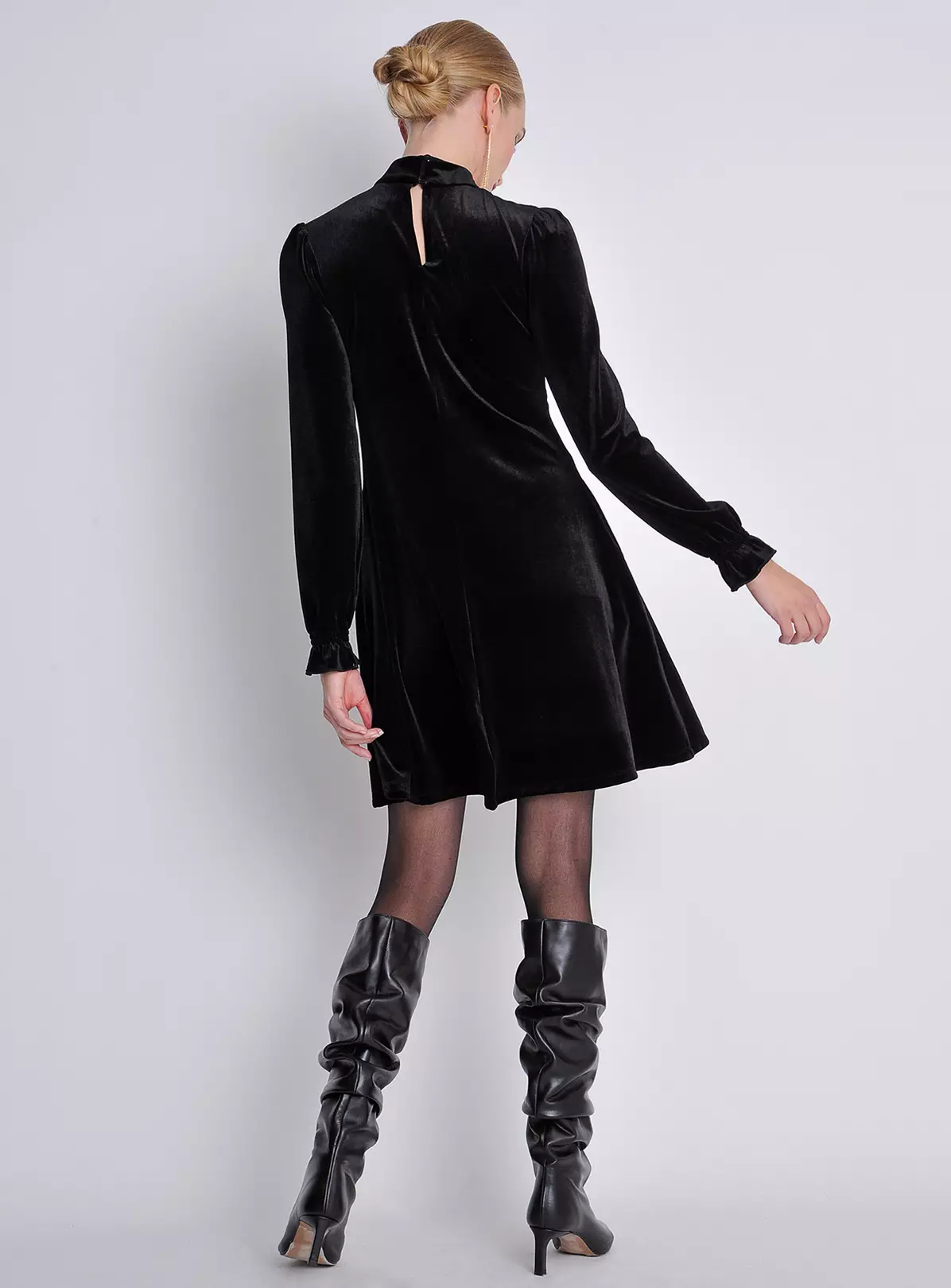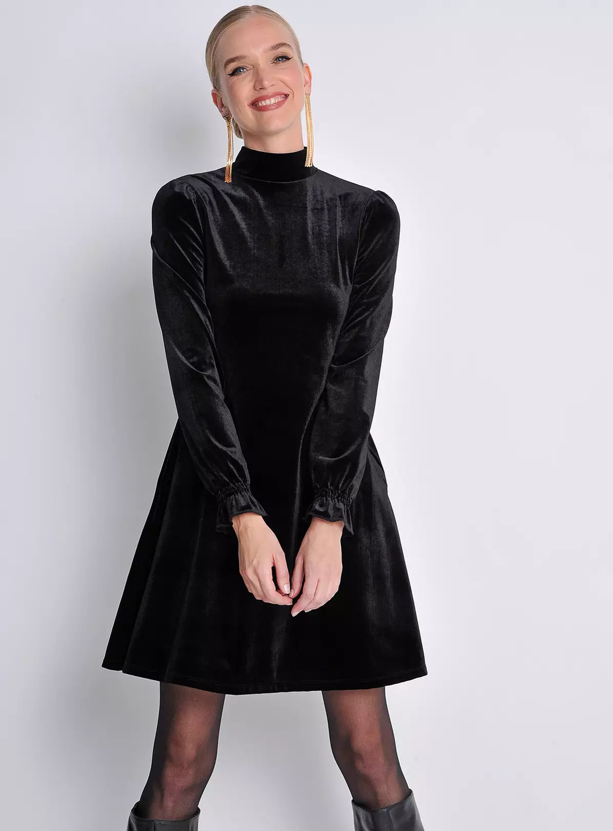 Cosy meets feminine with this fit-and-flare swing mini dress. Cut in soft and fluid velvet fabric, it has a warm turtleneck that can be rolled down and long sleeves finished with delicate shirring and frill detail. Whether you dress it up or down, be ready for the compliments! This one comes in jet black. Across our product range, we only use recycled and recyclable labelling and packaging.