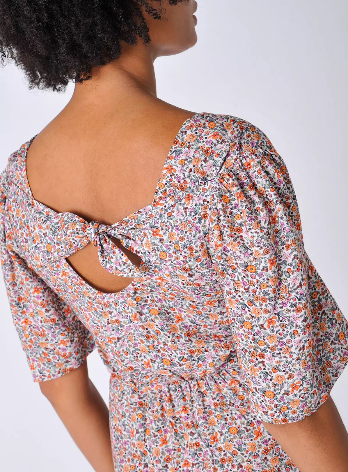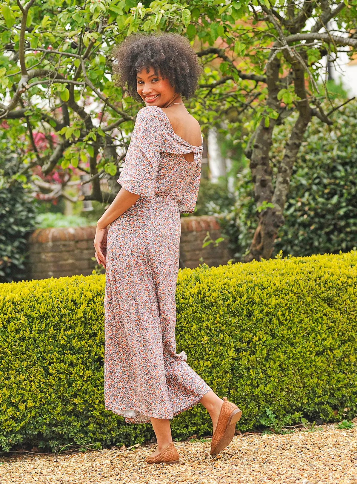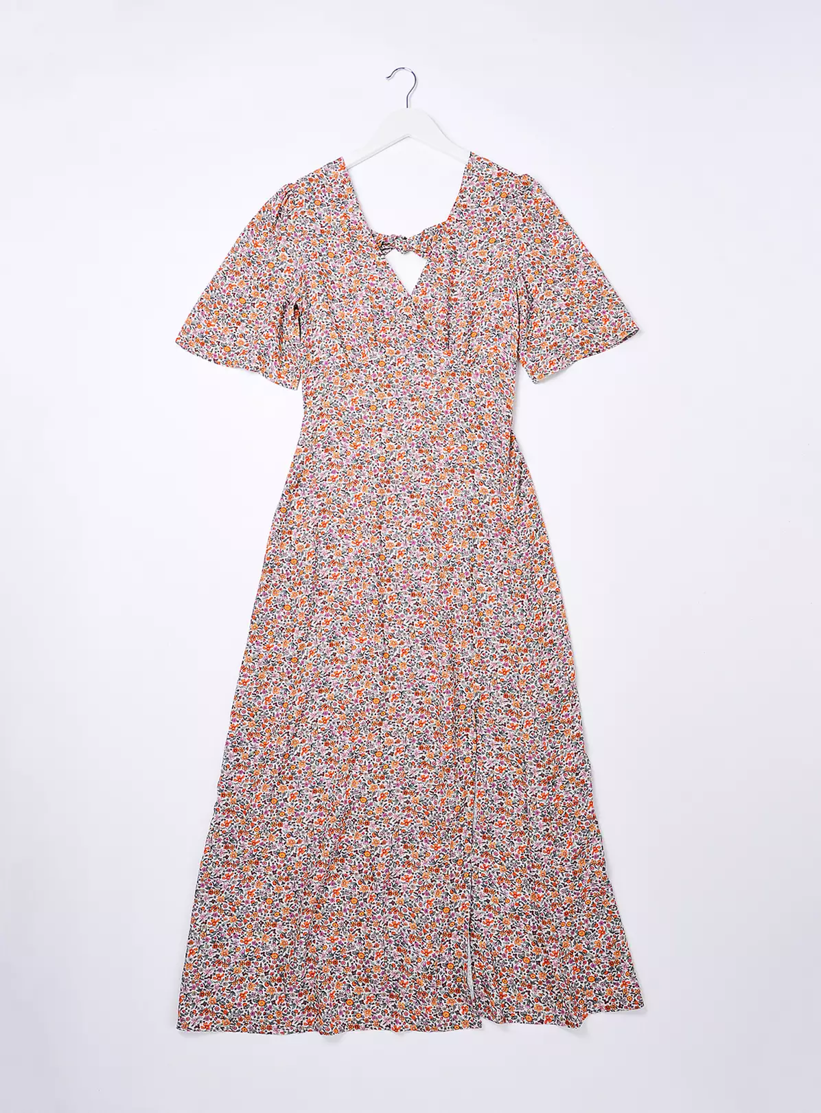 Milton midi printed dress is a perfect warm weather classic.Crafted from a soft viscose fabric covered all over in our hand-drawn ditsy print in soft earthy hues.Features an empire waist, floaty skirt with a subtle split, flutter sleeves and a plunge neck.Turn to reveal the open back that neatly ties with a bow.Across our product range, we only use recycled and recyclable labelling and packaging.