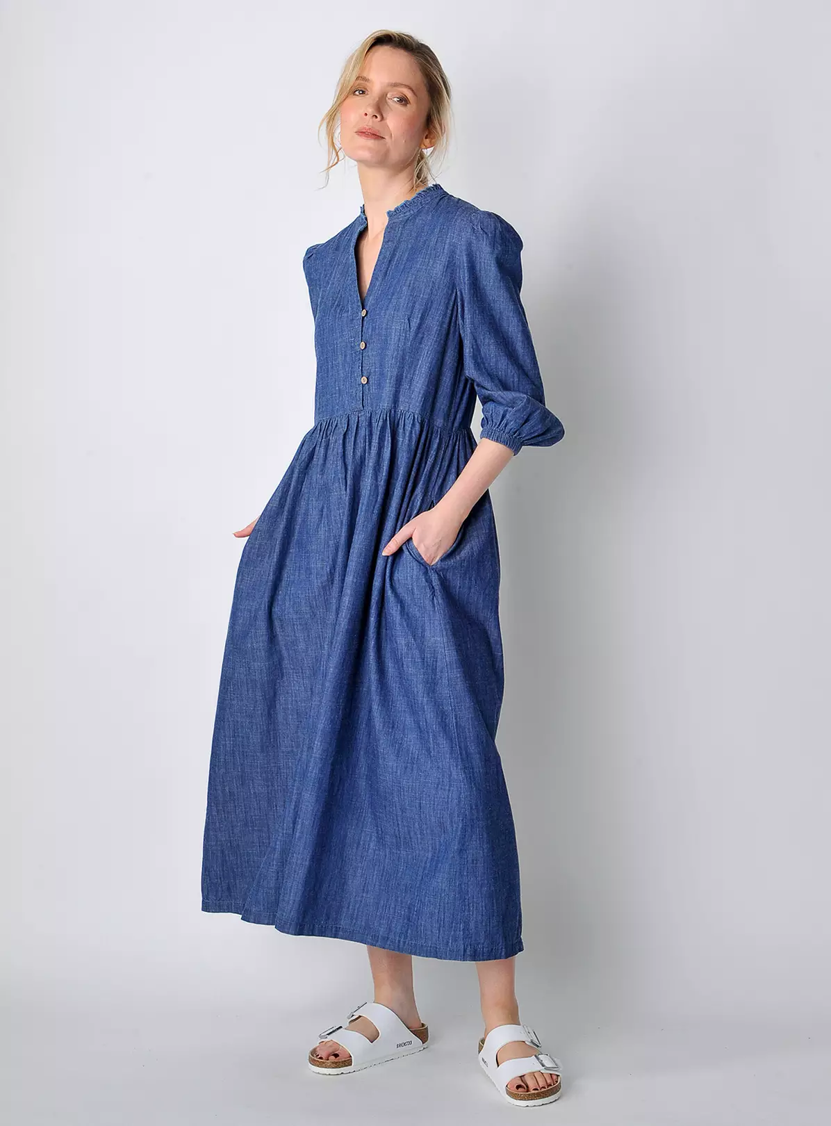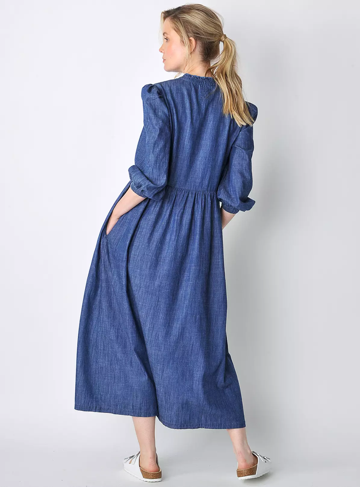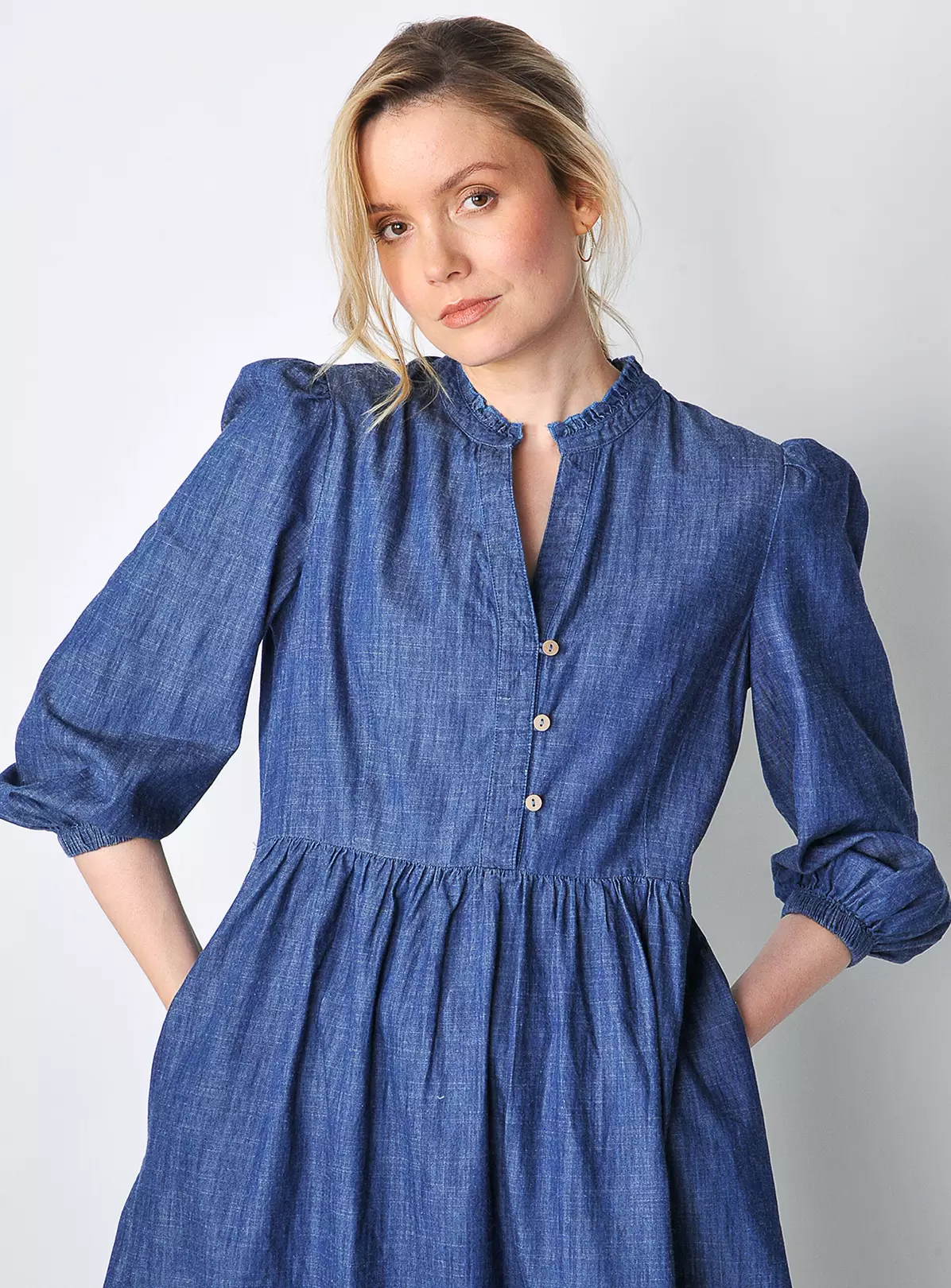 Comfortable and flattering thanks to the loose fitting silhouette, our Valley dress is made of our heavier-weight indigo-dyed cotton chambray. Features delicate frill decrating the collar, puff sleeves and V-shaped neckline with functional values on the top part. Dress it up or down and wear all day long in this transitional weather.