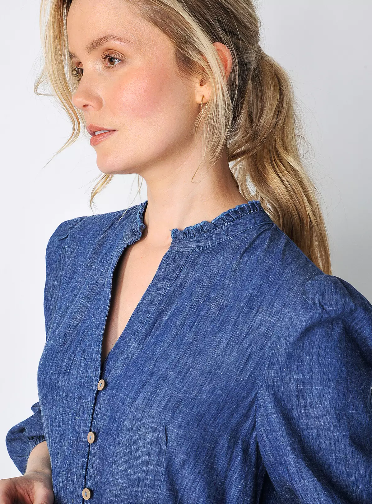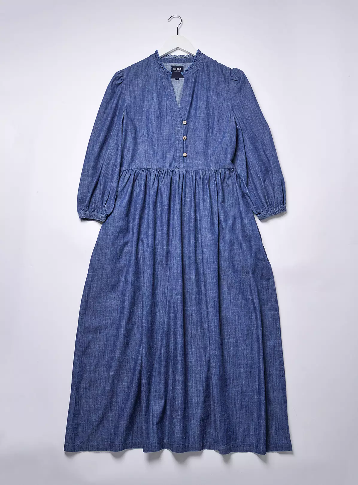 Comfortable and flattering thanks to the loose fitting silhouette, our Valley dress is made of our heavier-weight indigo-dyed cotton chambray. Features delicate frill decrating the collar, puff sleeves and V-shaped neckline with functional values on the top part. Dress it up or down and wear all day long in this transitional weather.