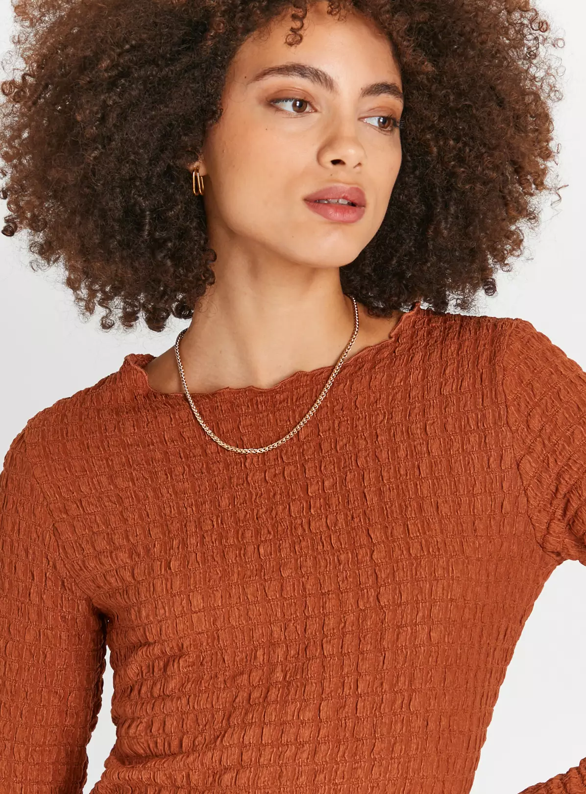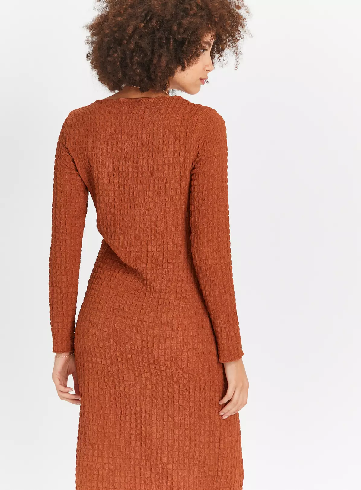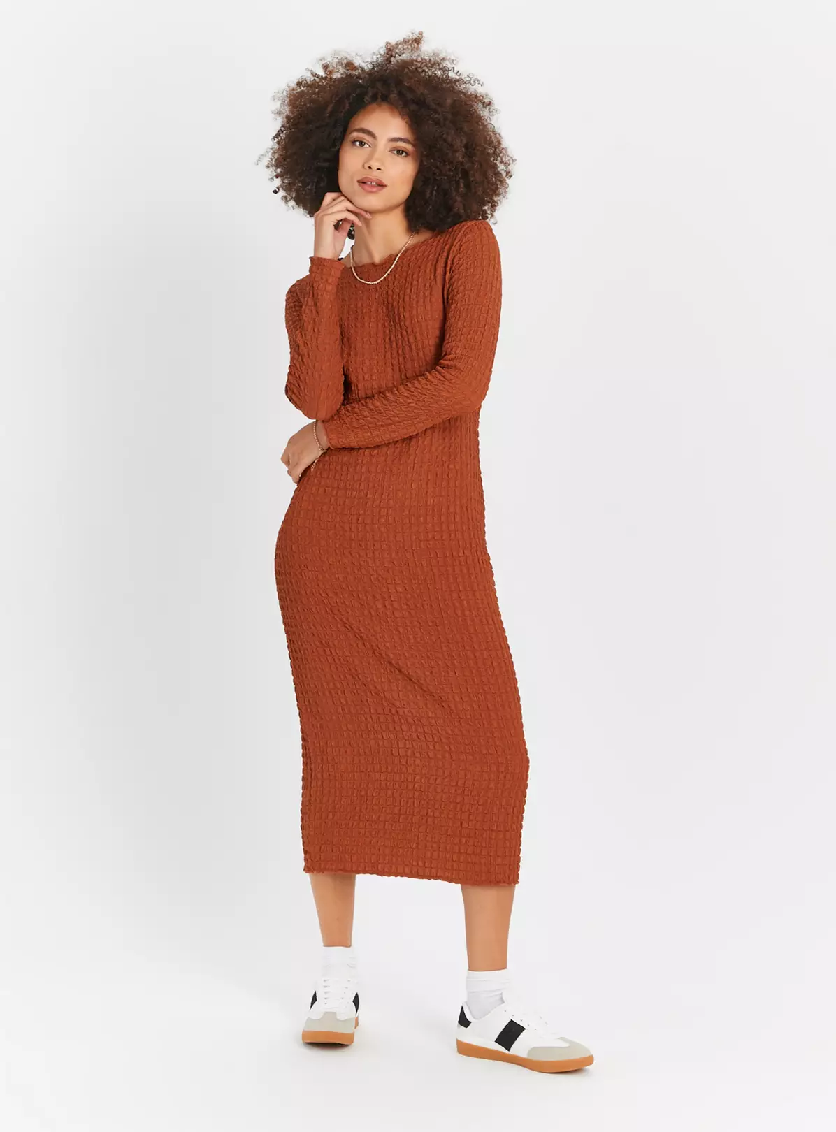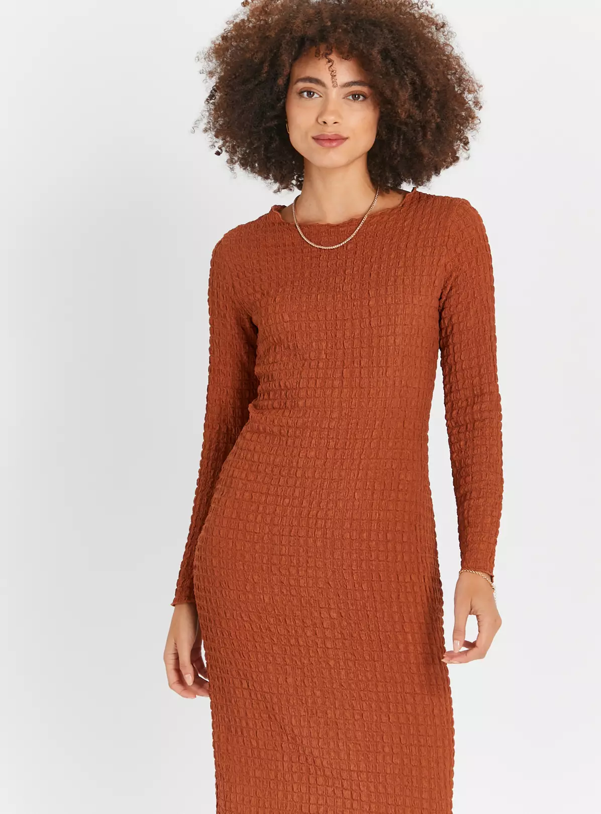 Elevated by a stunning bubble textured design, our long sleeve dress is a staple for your collection! It comes in a gorgeous chestnut shade and has a midaxi length for a flattering look. Team it with a pair of white trainers for a chic weekend outfit.