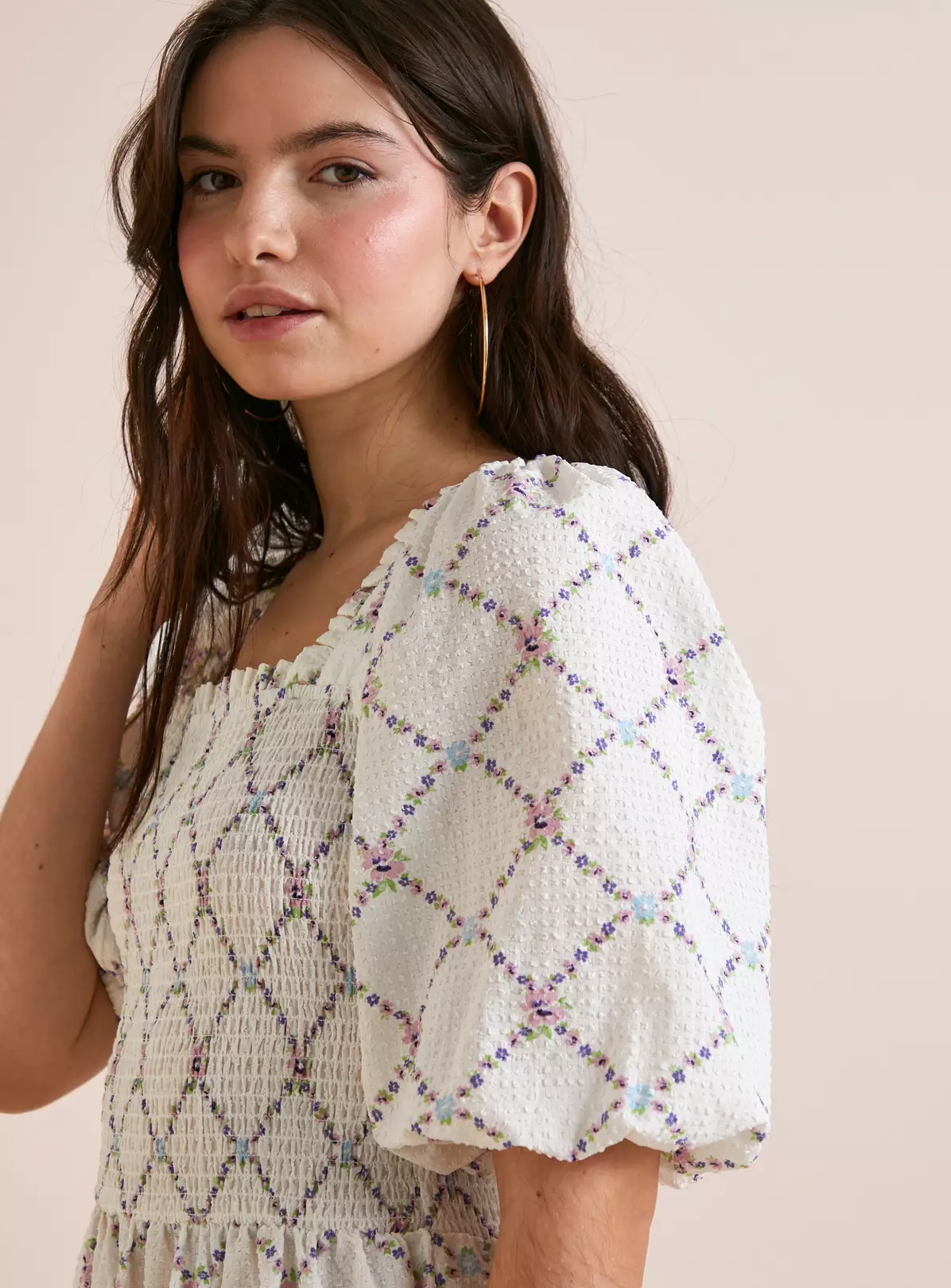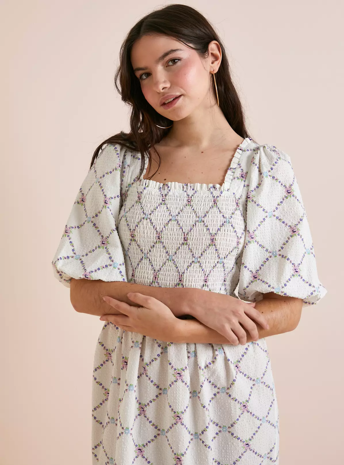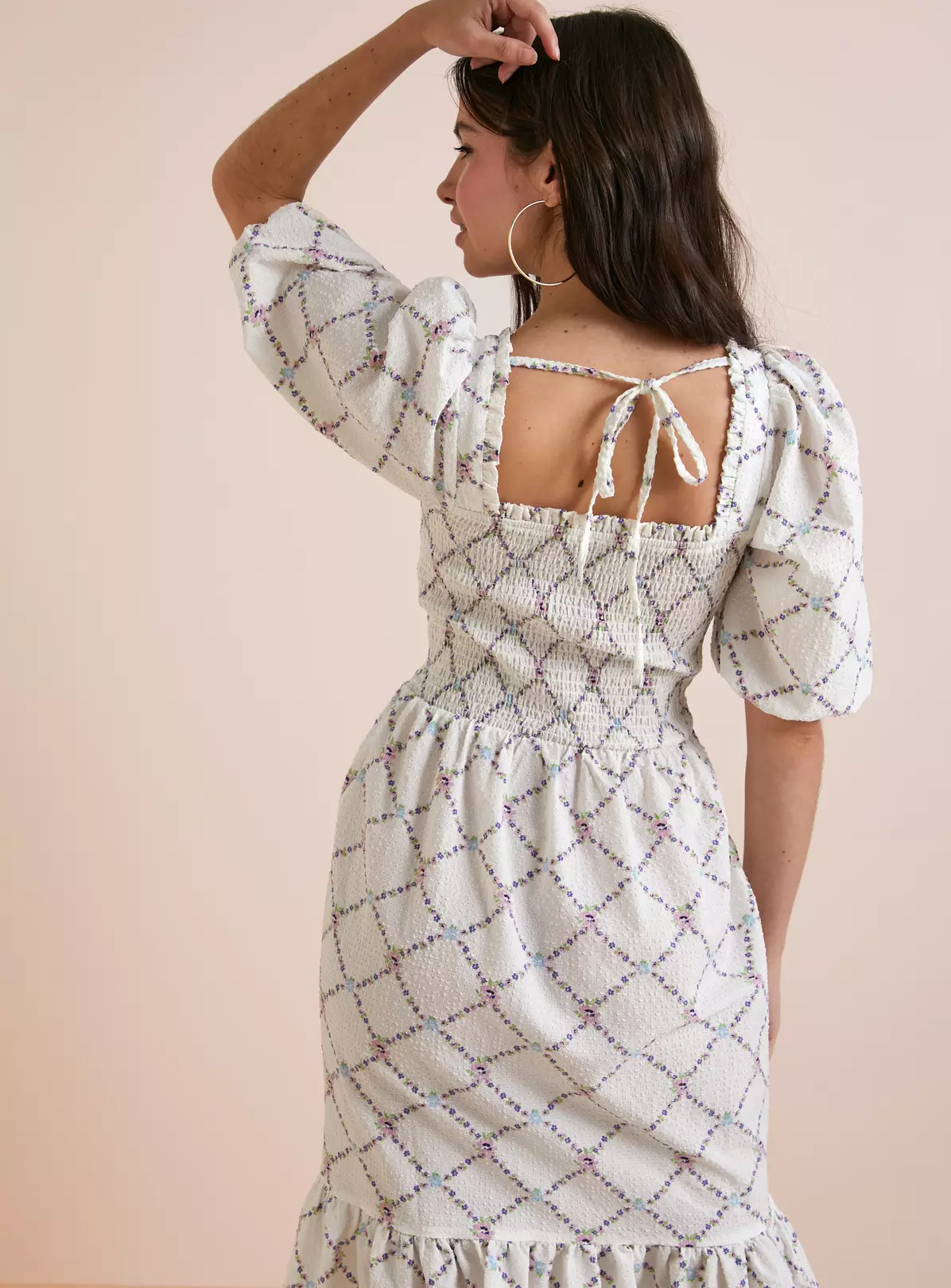 - Defined by its trellis floral check print with shades of lilac, blue and sage