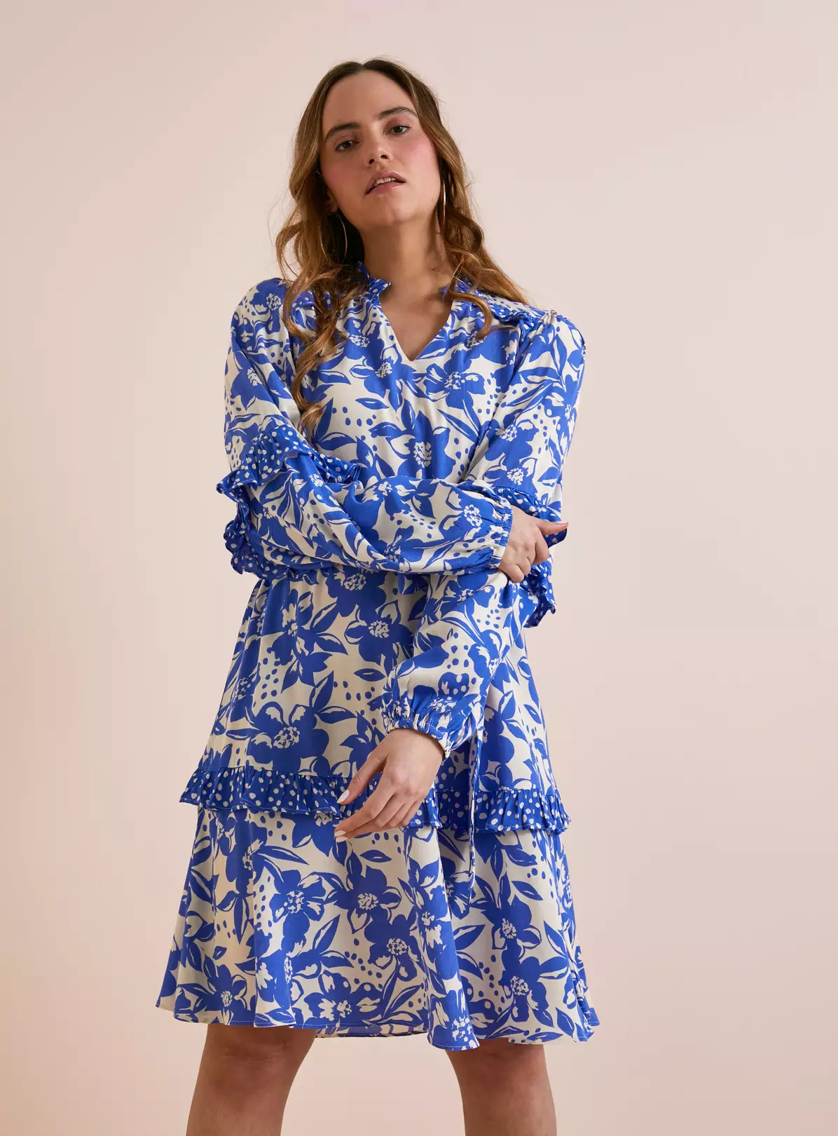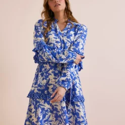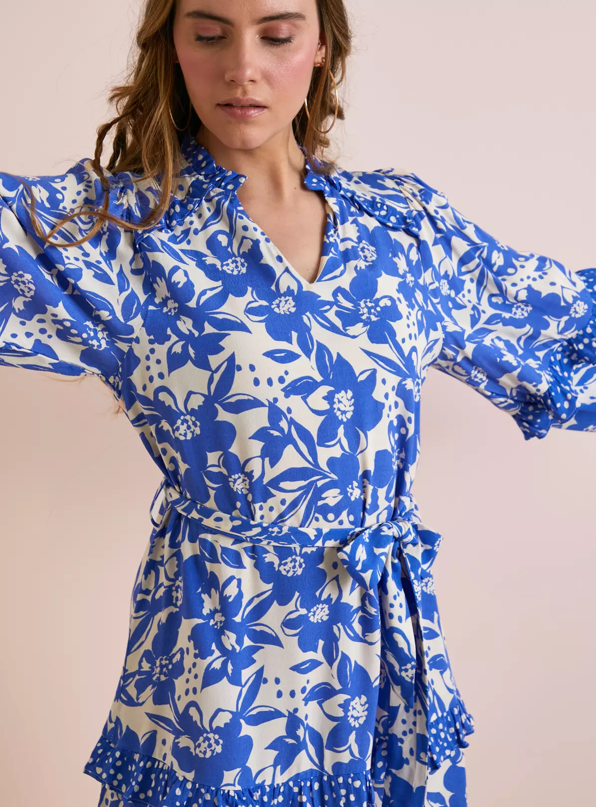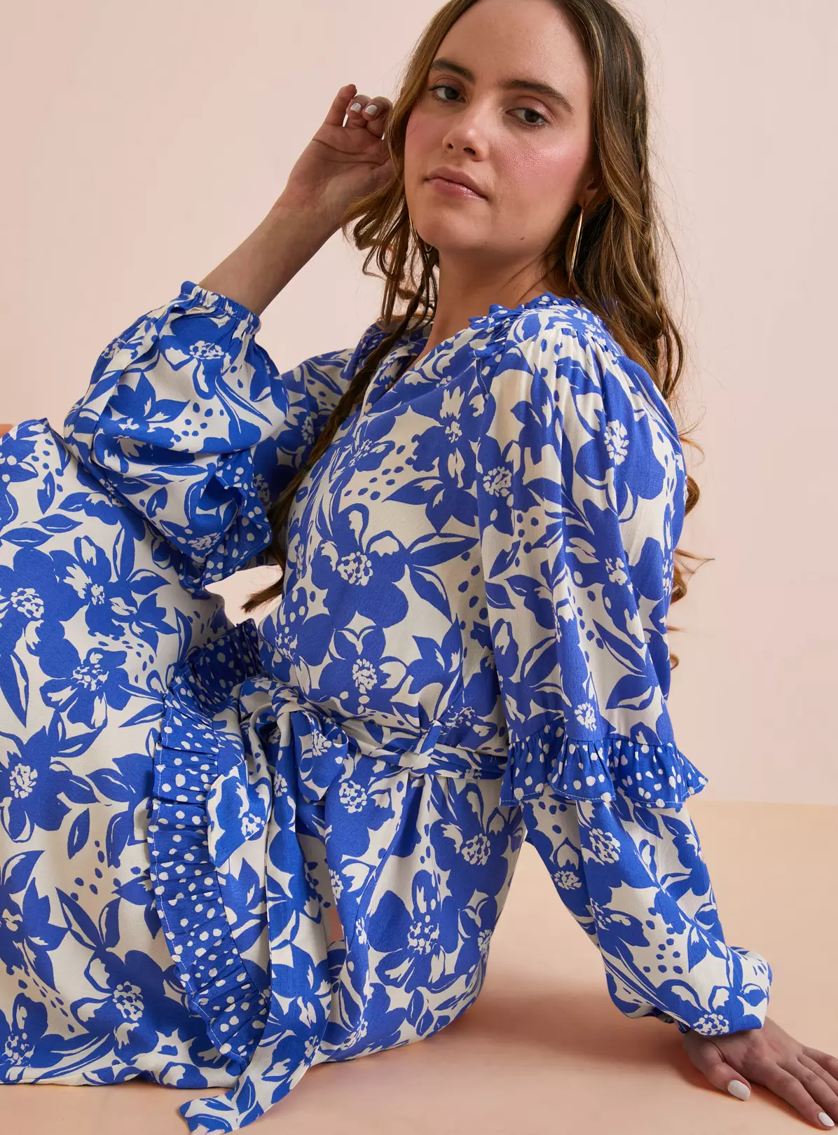 - Adorned by a patchwork dotty floral design in a deep hue of blue