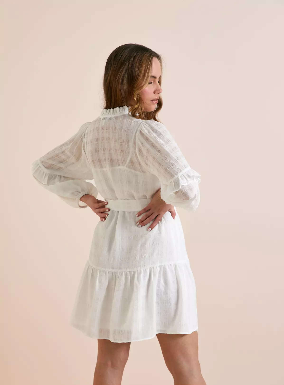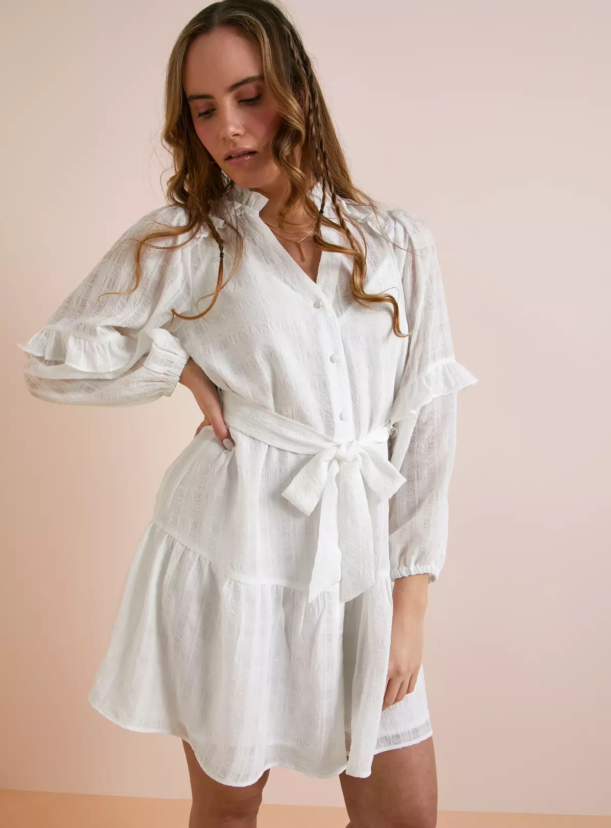 - A classic piece elevated by its sheer, woven check pattern and delicate frill detailing
