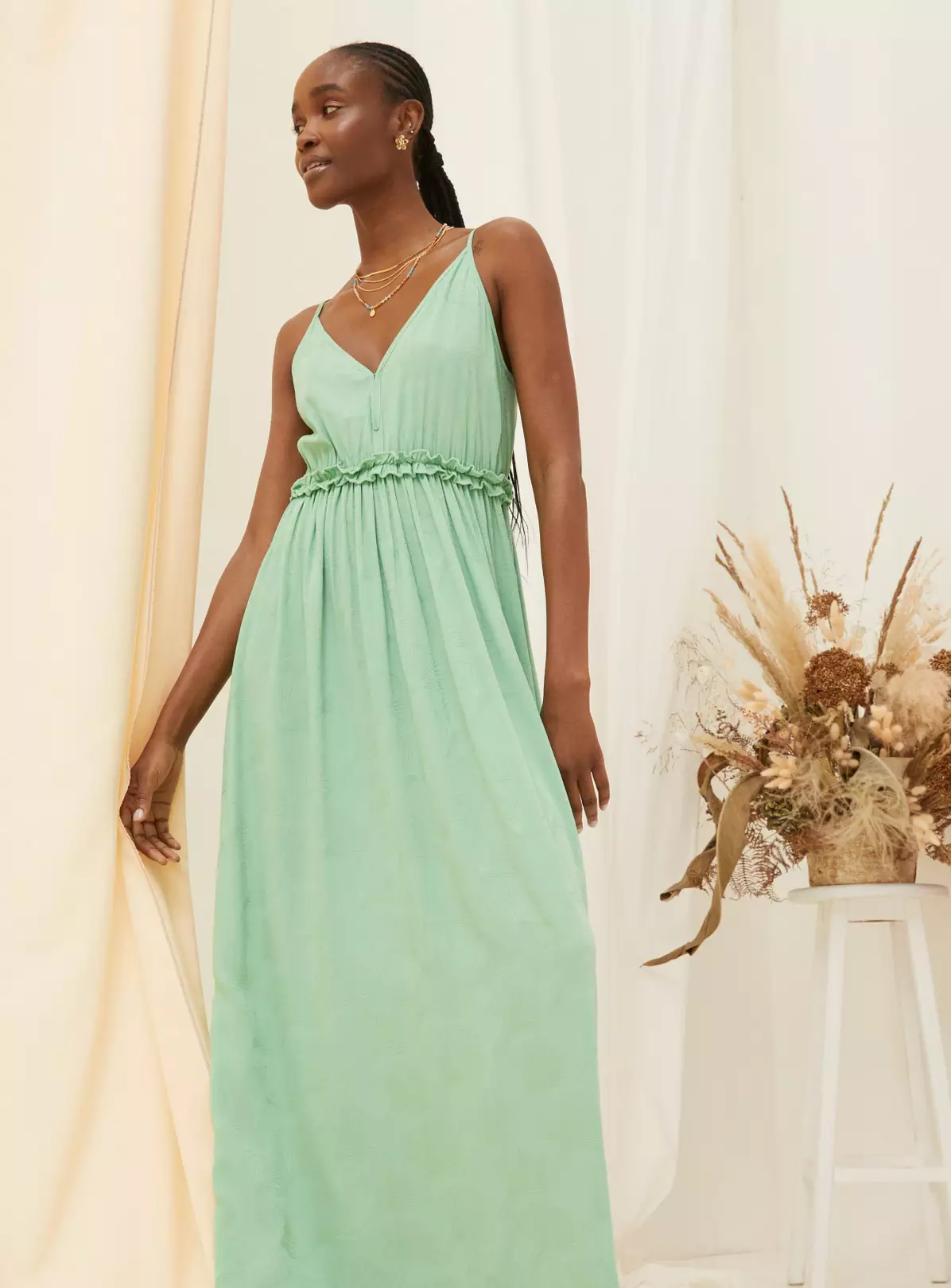Designed for all your spring and summer socials, our Lily maxi dress is the perfect addition to your wardrobe. It boasts a halter style back, V front and gorgeous leaf texture. The pie-crust cinched waist creates a lovely silhouette that’s ideal for the sunshine.
