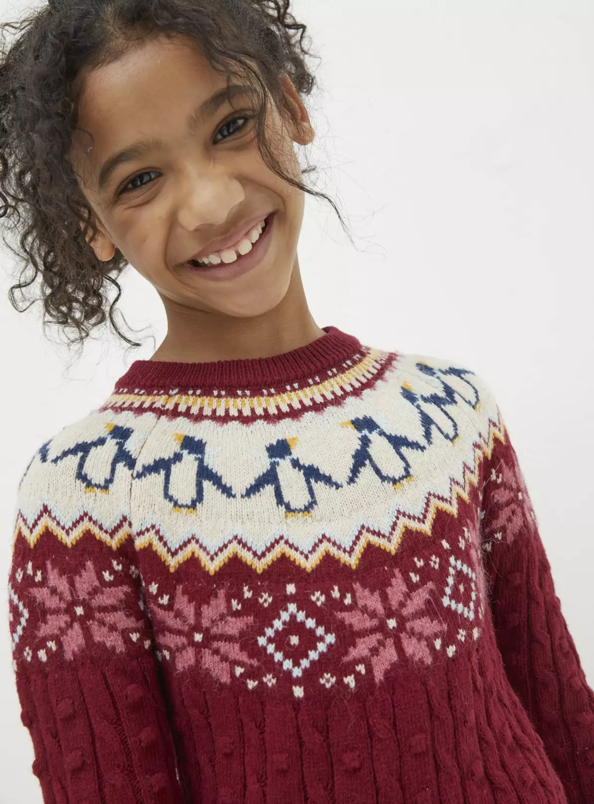 Get the little all dressed up for the cold season ahead. Our adorable knitted dress boasts a cute penguin fairisle print, ready for all the upcoming festivities and considered style seen in the rows of cabling and warm cosy cuffs. This lovely knit has been crafted from a comfortable cotton blend with a touch of wool for extra warmth and looks perfect paired with snug tights and cosy boots.