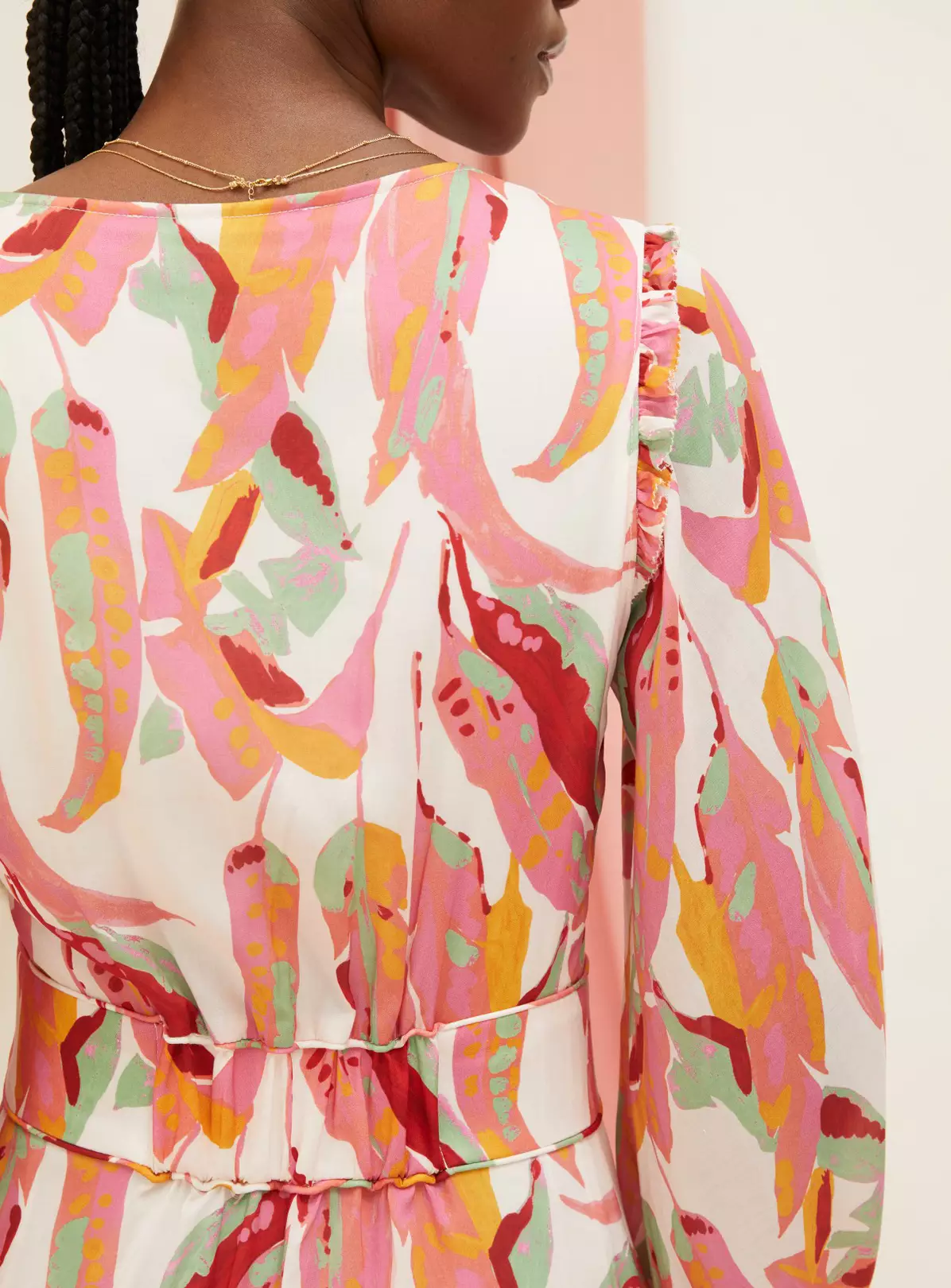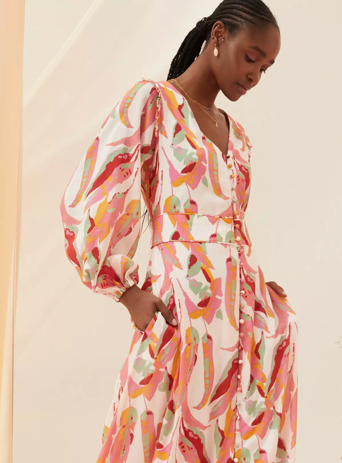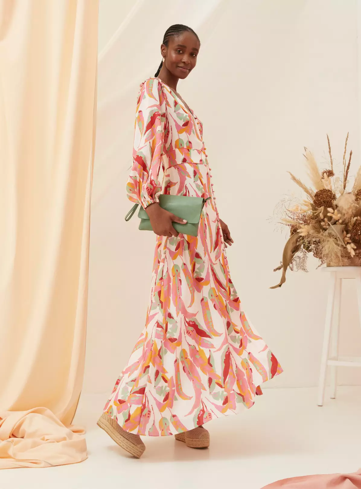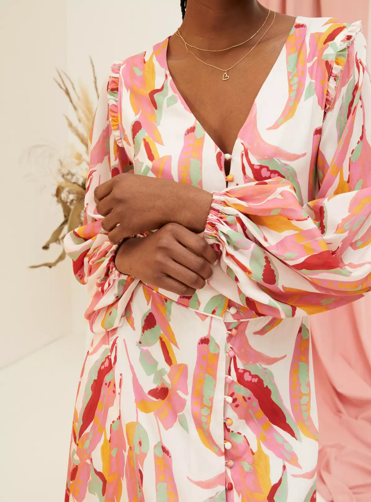 Inspired by the beauty of nature, our Peony painted leaves dress is the perfect choice for when your calendar is back-to-back with spring socials. The ever-flattering shape boasts a lovely V neckline, balloon sleeves and frill shoulders. Other details we love and know you will too are the fabric covered values, side pockets and bold print.