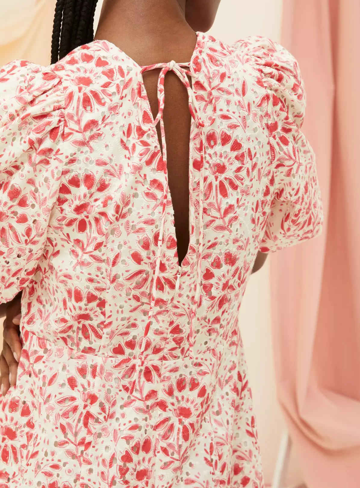 Our tulip floral tile dress, is ideal for all your spring and summer socials. From weddings to garden parties, she’s been designed to make you the centre of attention. It’s crafted with 100% cotton and has beautiful puff sleeves and a tie back. Wear it with wedges or sandals for a lovely look.