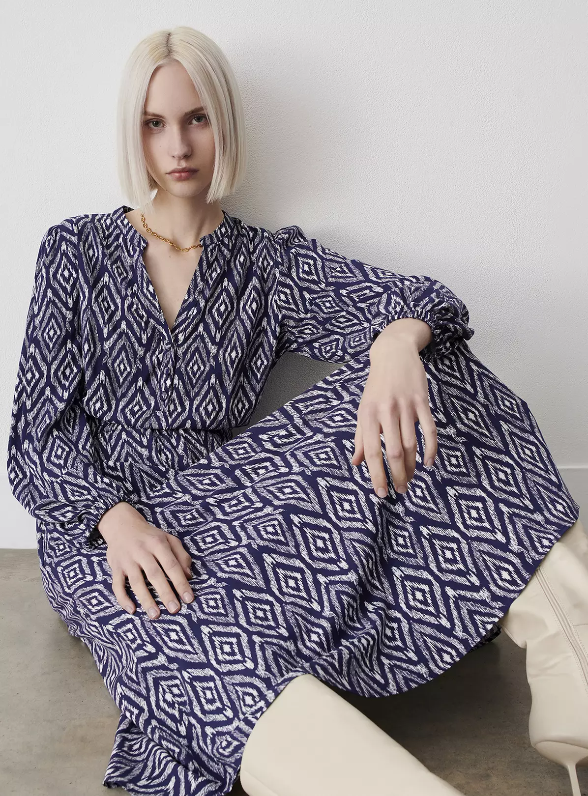 With front covered values, Amy has a comfortable elasticated waist and a v-neckline with collar detail. Midi in length she also features blouson sleeves with elasticated cuffs. Pair with ankle boots and layer over your favourite winter jacket.