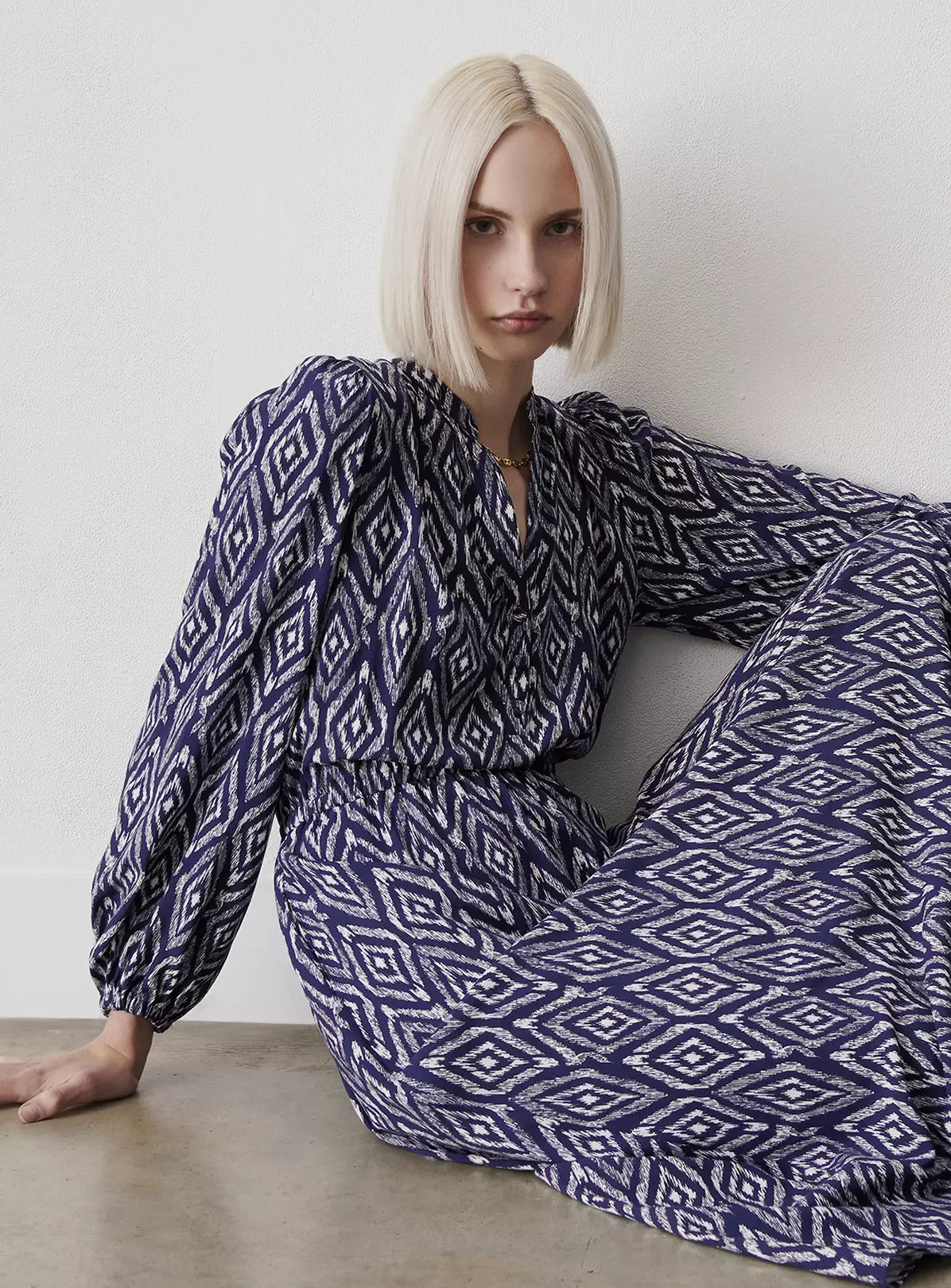 With front covered values, Amy has a comfortable elasticated waist and a v-neckline with collar detail. Midi in length she also features blouson sleeves with elasticated cuffs. Pair with ankle boots and layer over your favourite winter jacket.
