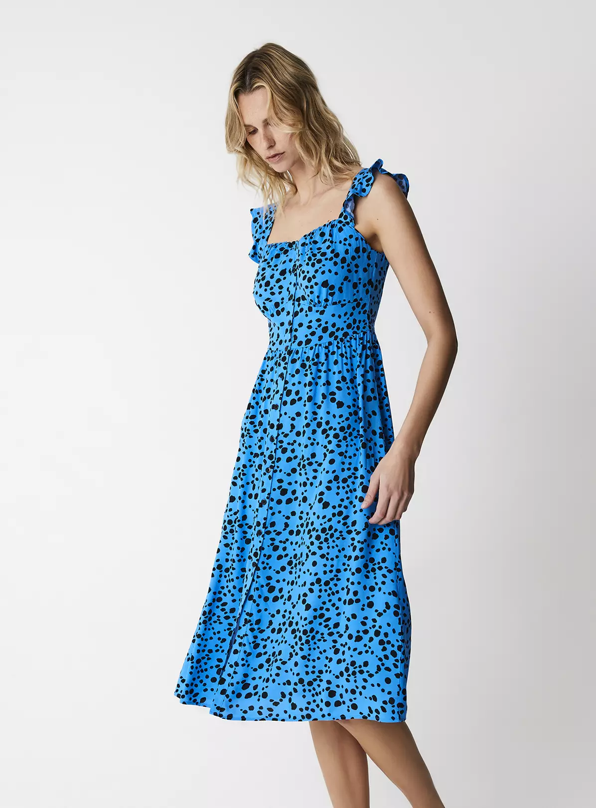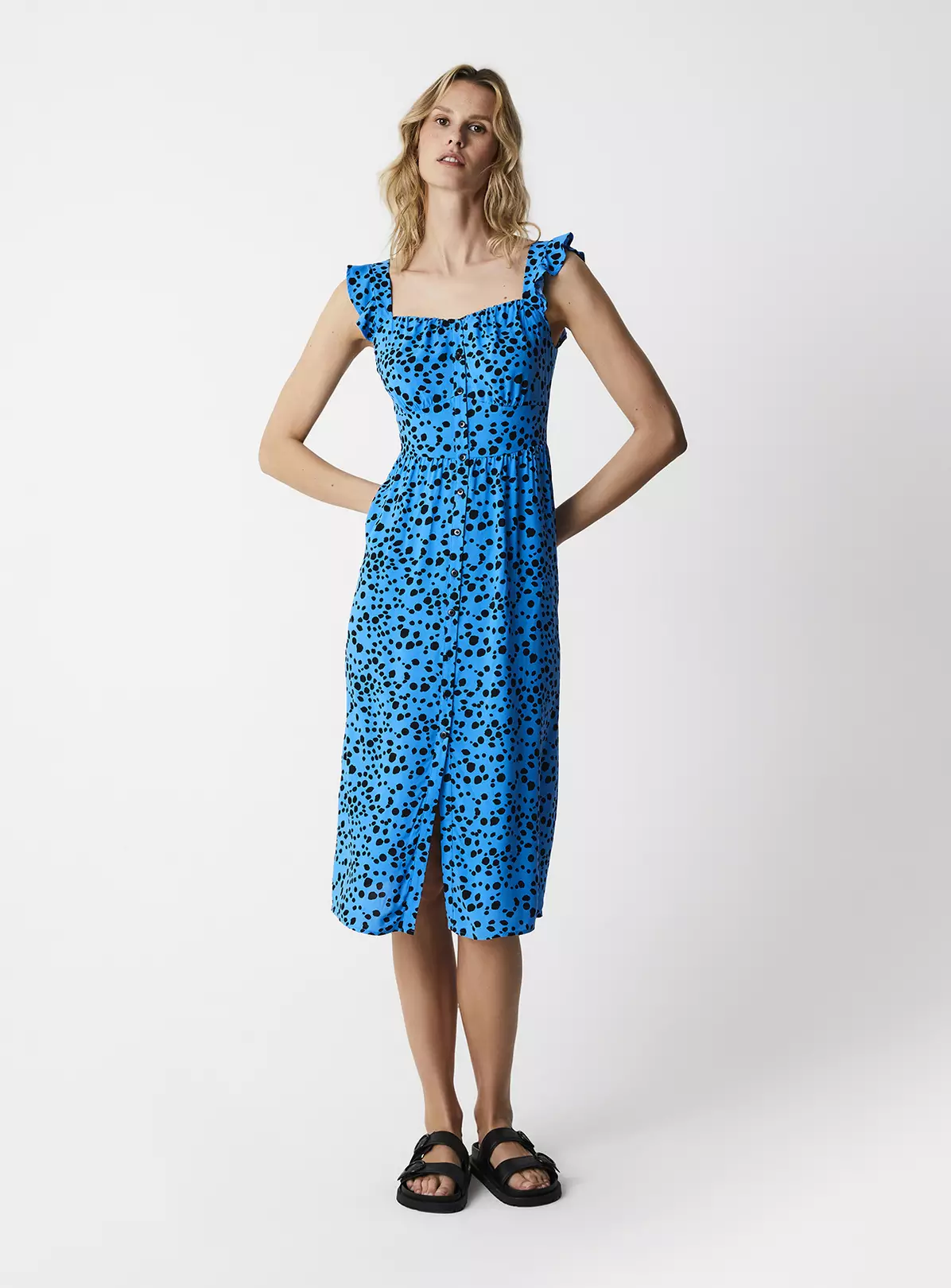 With a fitted waist panel that accentuates the silhouette, Ania is midi in length and crafted from our signature viscose. A sweetheart neckline is complimented by frill detailed shoulder straps, and ruched bust detail. The skirt features a tiered hemline that provides just the right amount of movement.