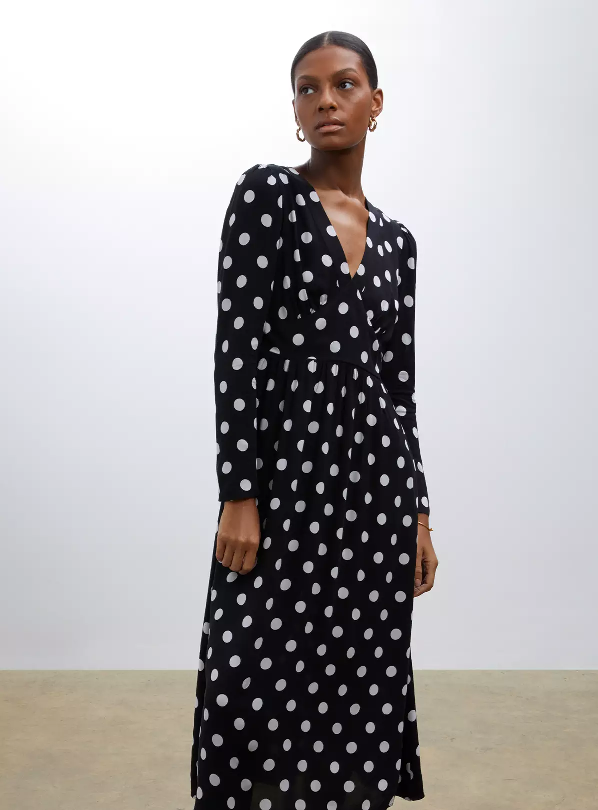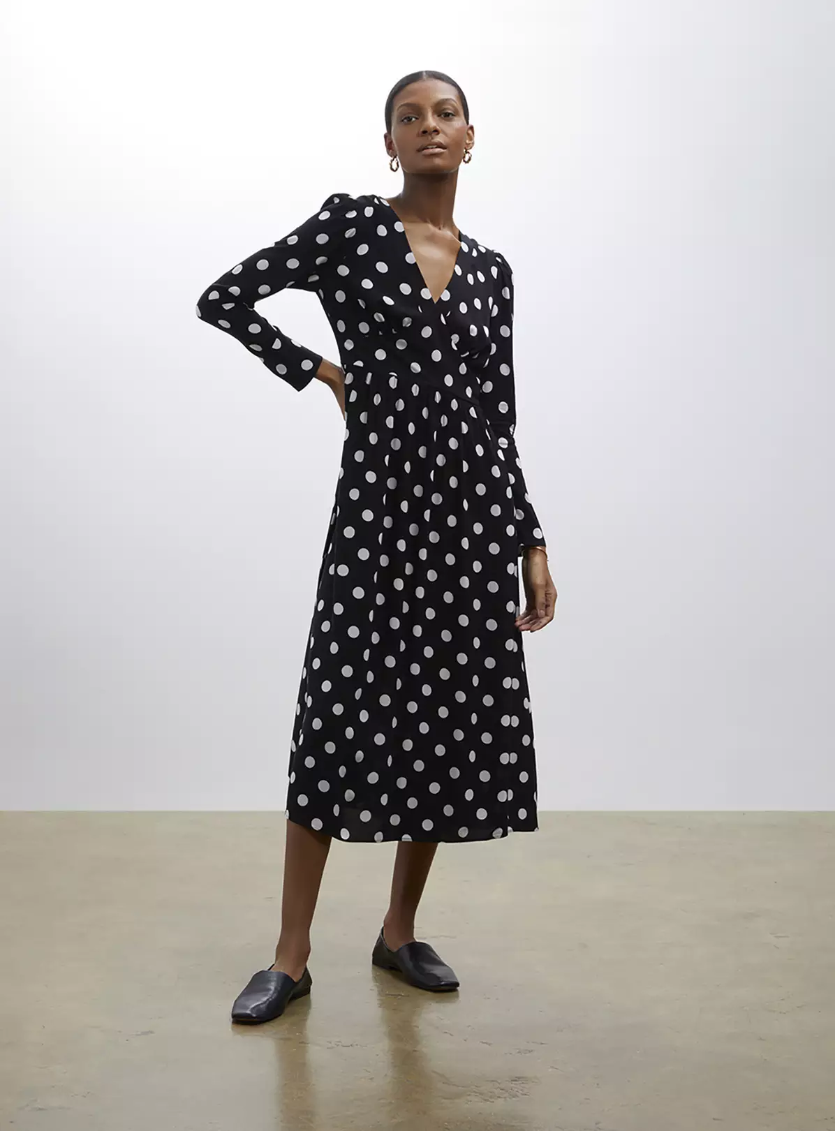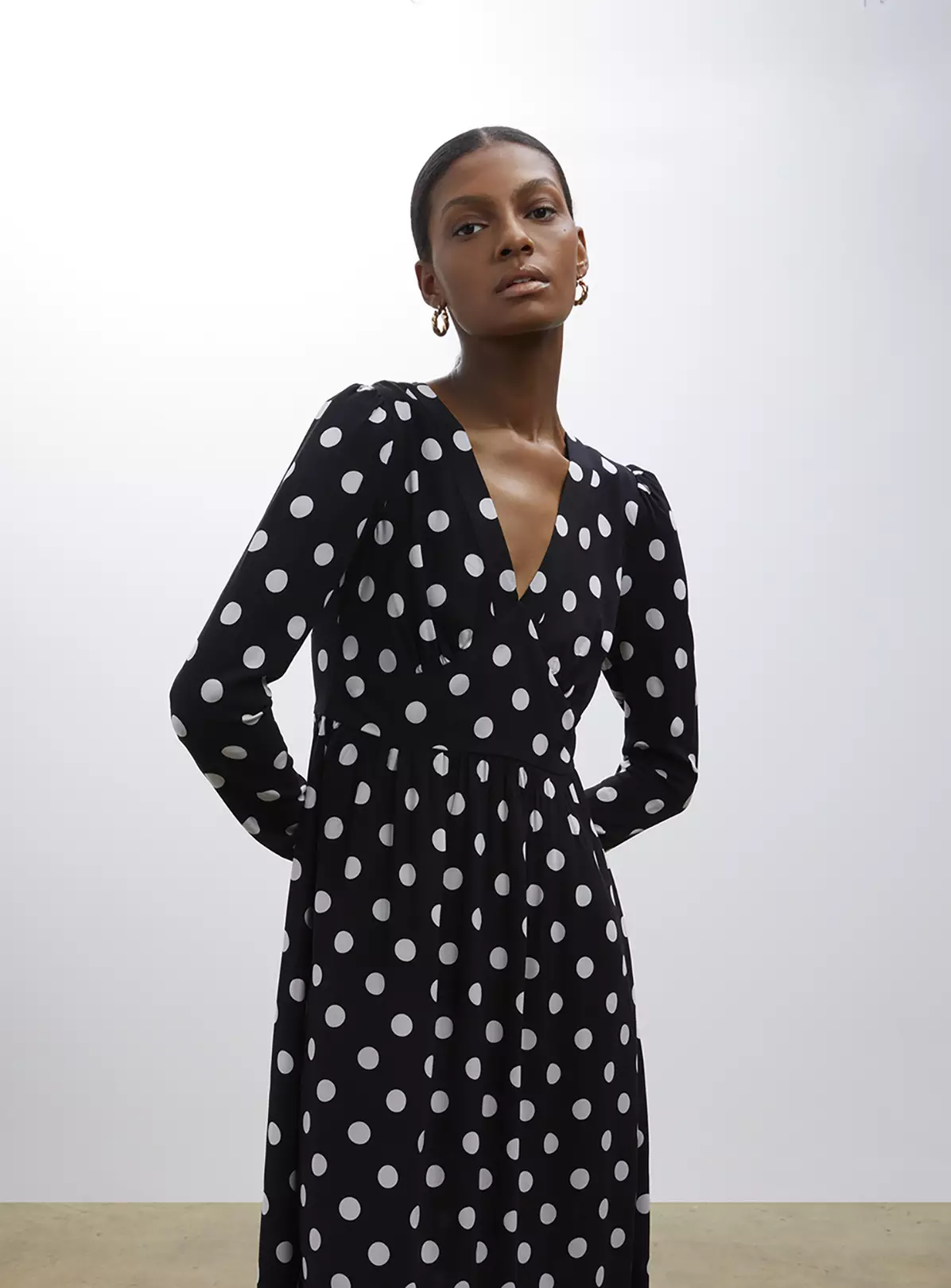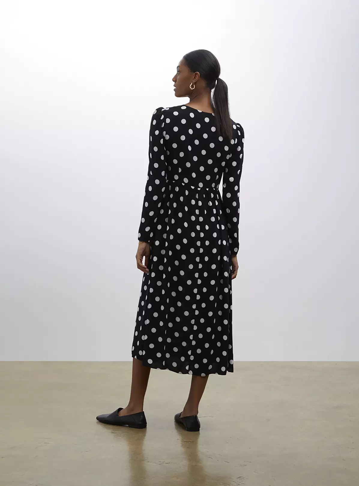 A classic black spot you can dress up or down, Carrie is crafted from our signature viscose and is midi in length. An empire line waist panel and v-neckline make for a flattering bodice, before flowing into a voluminous skirt, to enhance the fit and flare style.