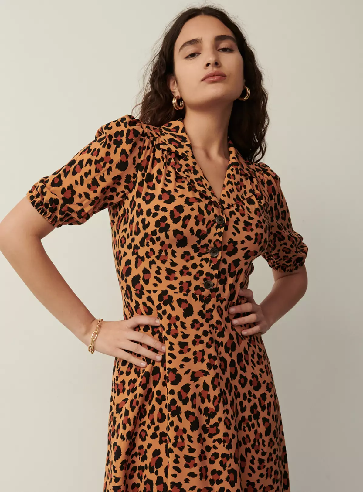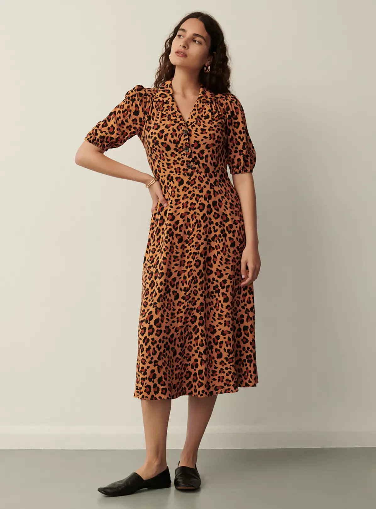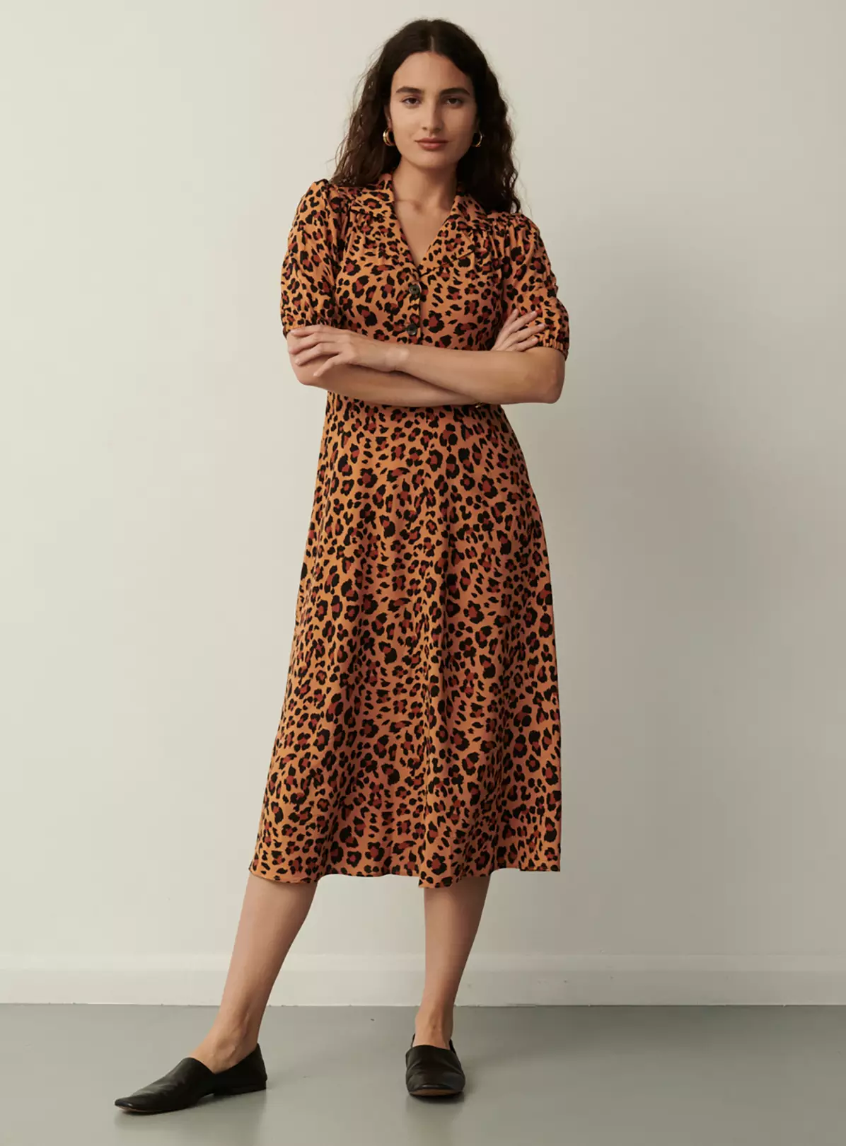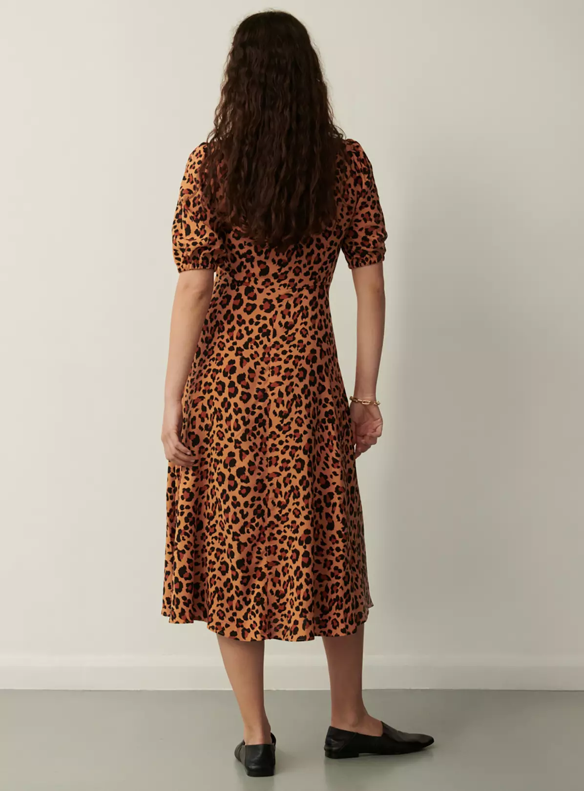 Deandra is a shirt dress that is valueed-through to the waist with tortoiseshell values. Midi in length, and crafted from viscose. Deandra has short sleeves with elasticated cuffs and ruched detailing on both the shoulder and along the clavicle.