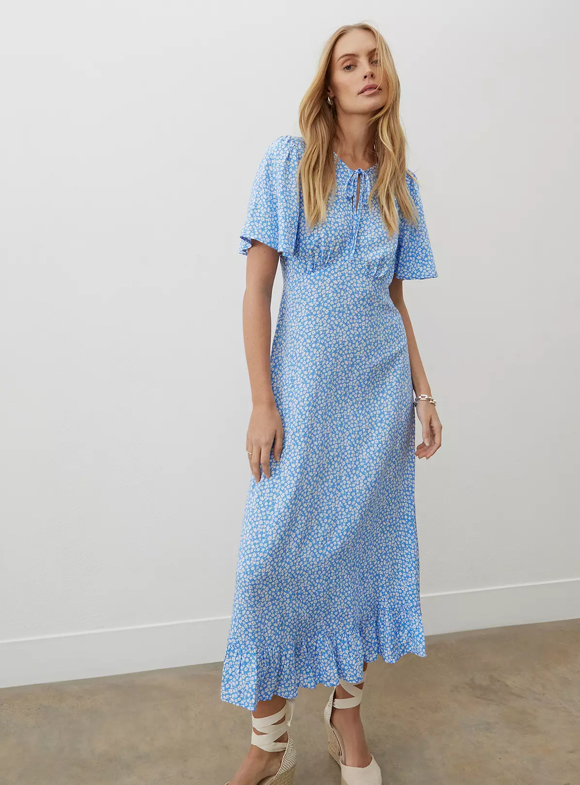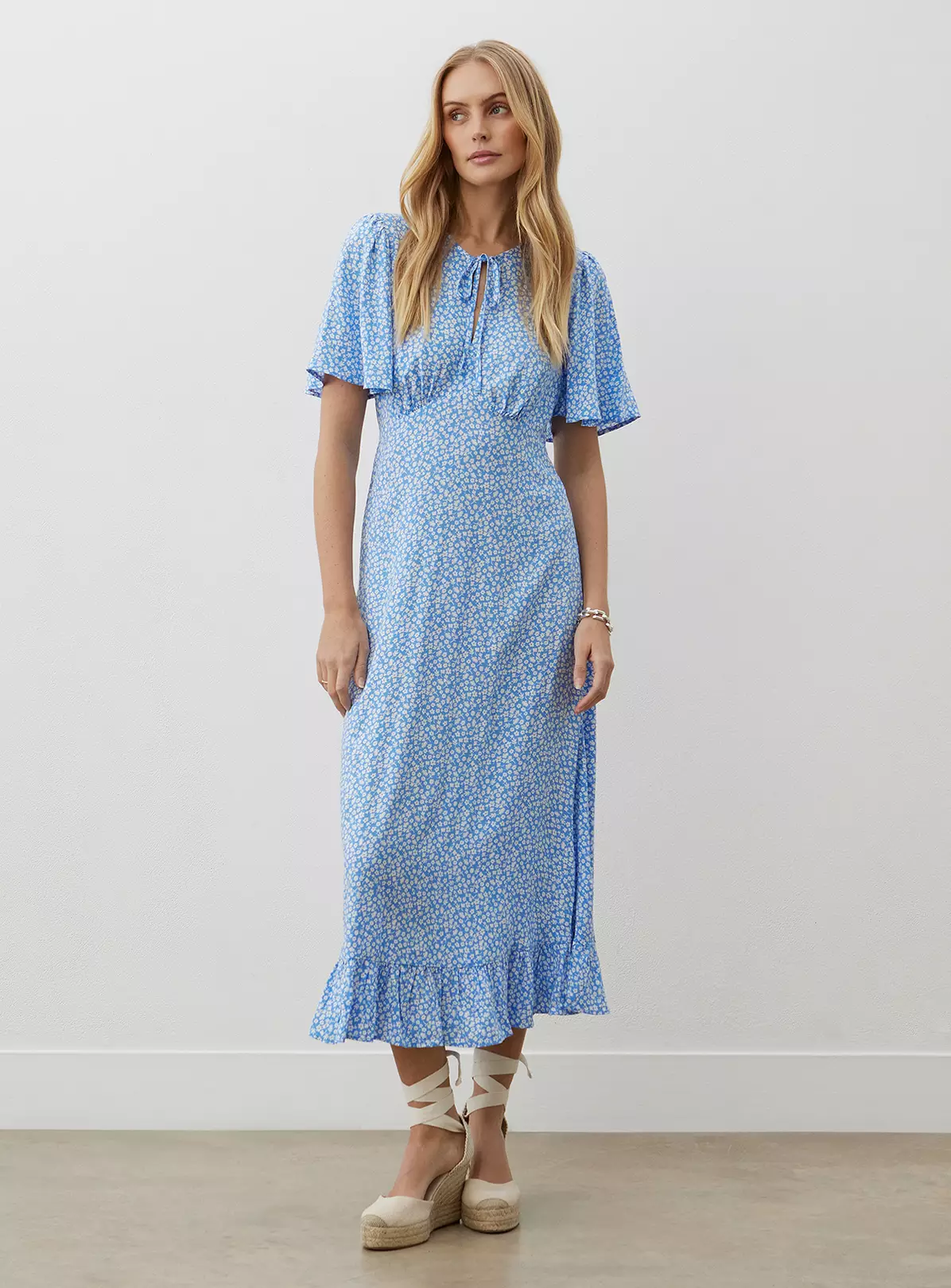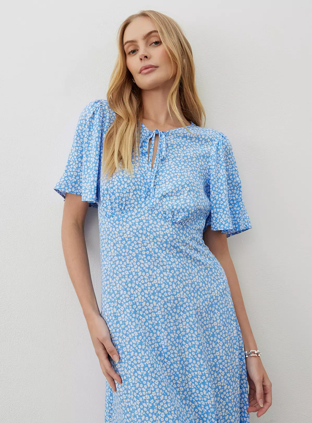Not only is Isabella a stylish ditsy midi dress, but she also features a delicate tie neckline, puffed shoulders and gorgeous angel sleeves. Pair with sandals or sneakers to suit the occasion.