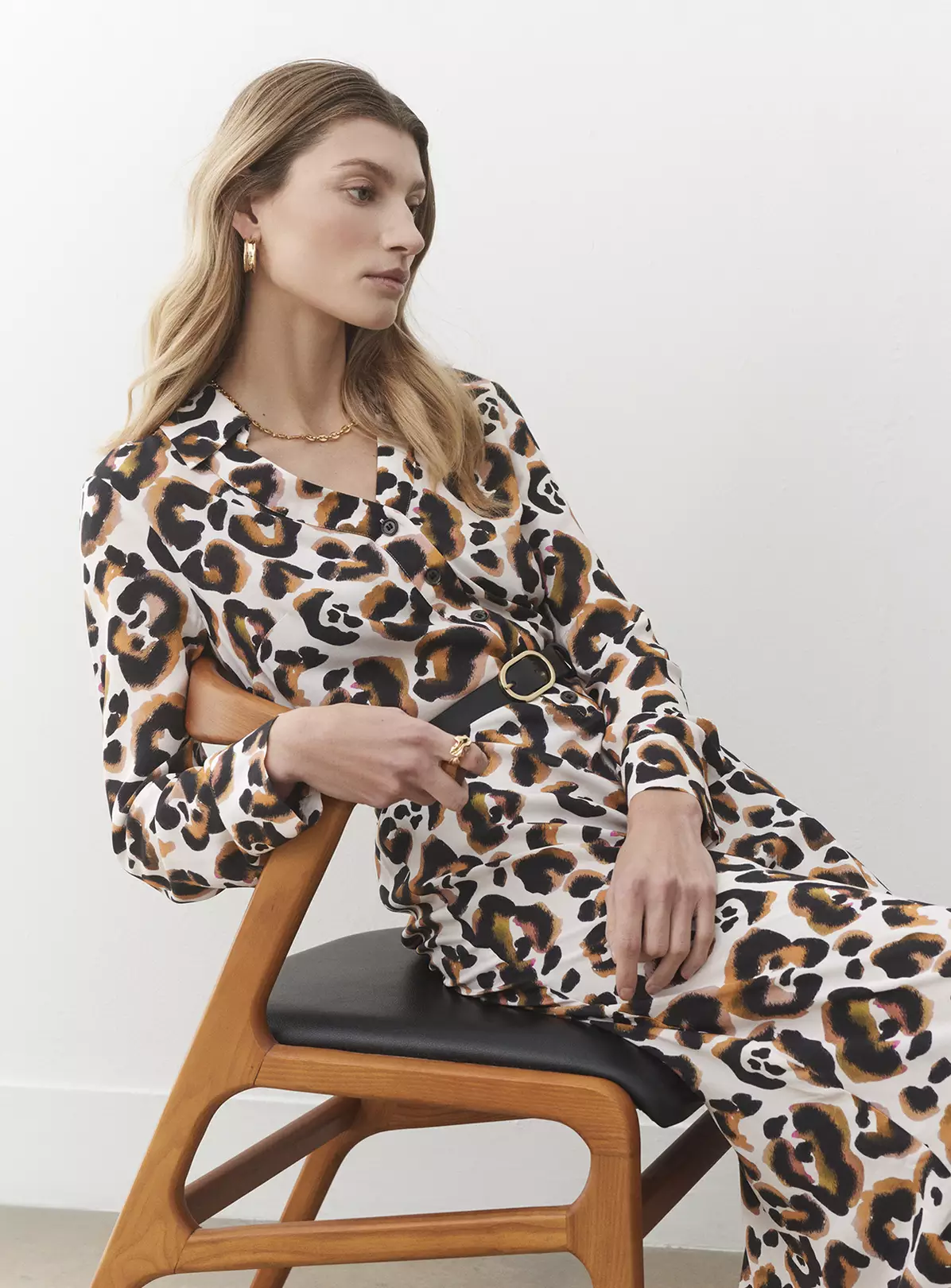 Buttoned through to the waist, Isla is a shirt dress in an eye-catching animal print. She features tie-waist detail and long elegant sleeves that end in cuff and value detail. Wear with ankle boots and layer under a leather jacket.