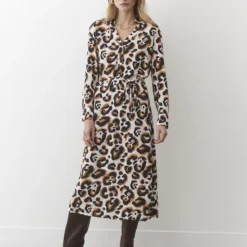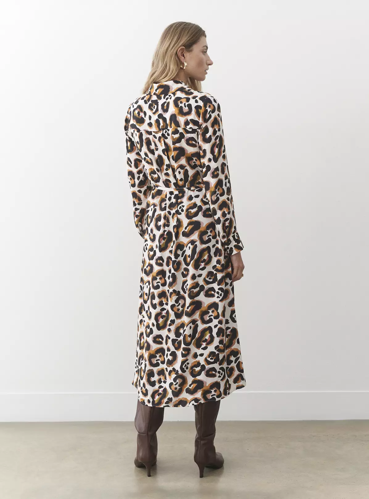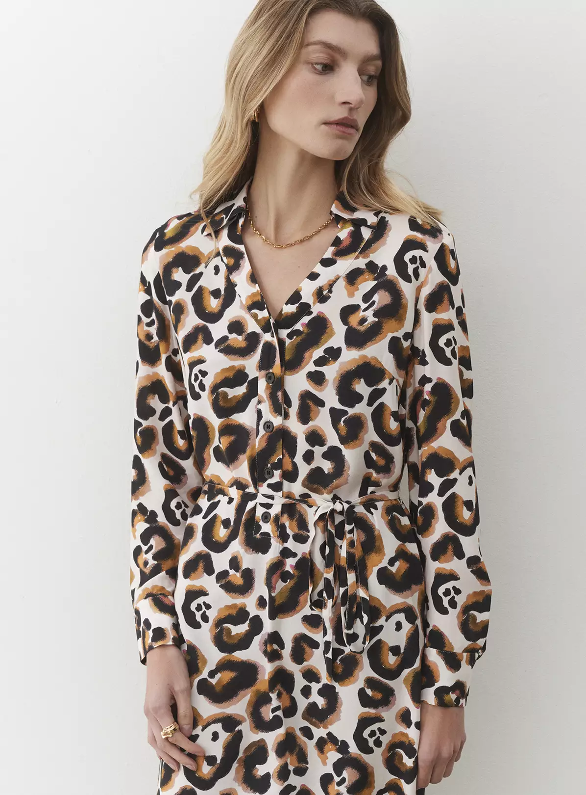 Buttoned through to the waist, Isla is a shirt dress in an eye-catching animal print. She features tie-waist detail and long elegant sleeves that end in cuff and value detail. Wear with ankle boots and layer under a leather jacket.