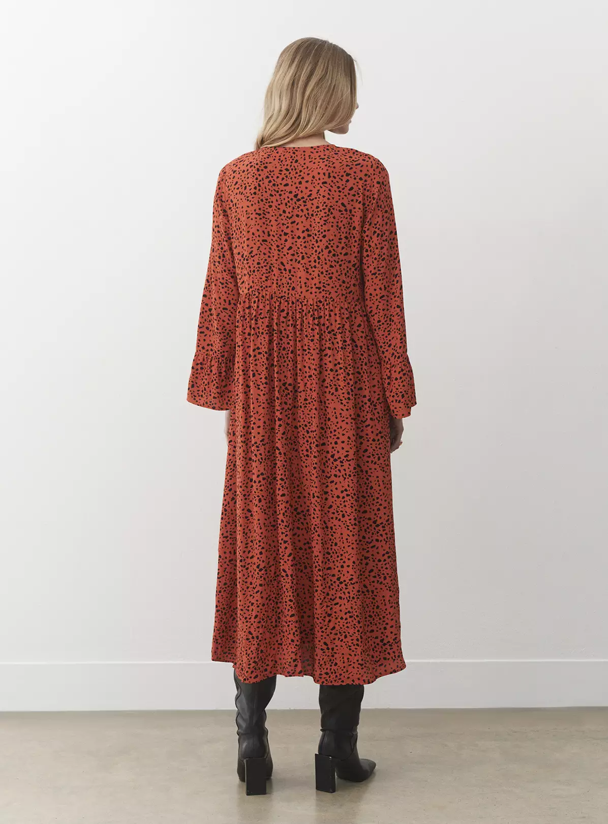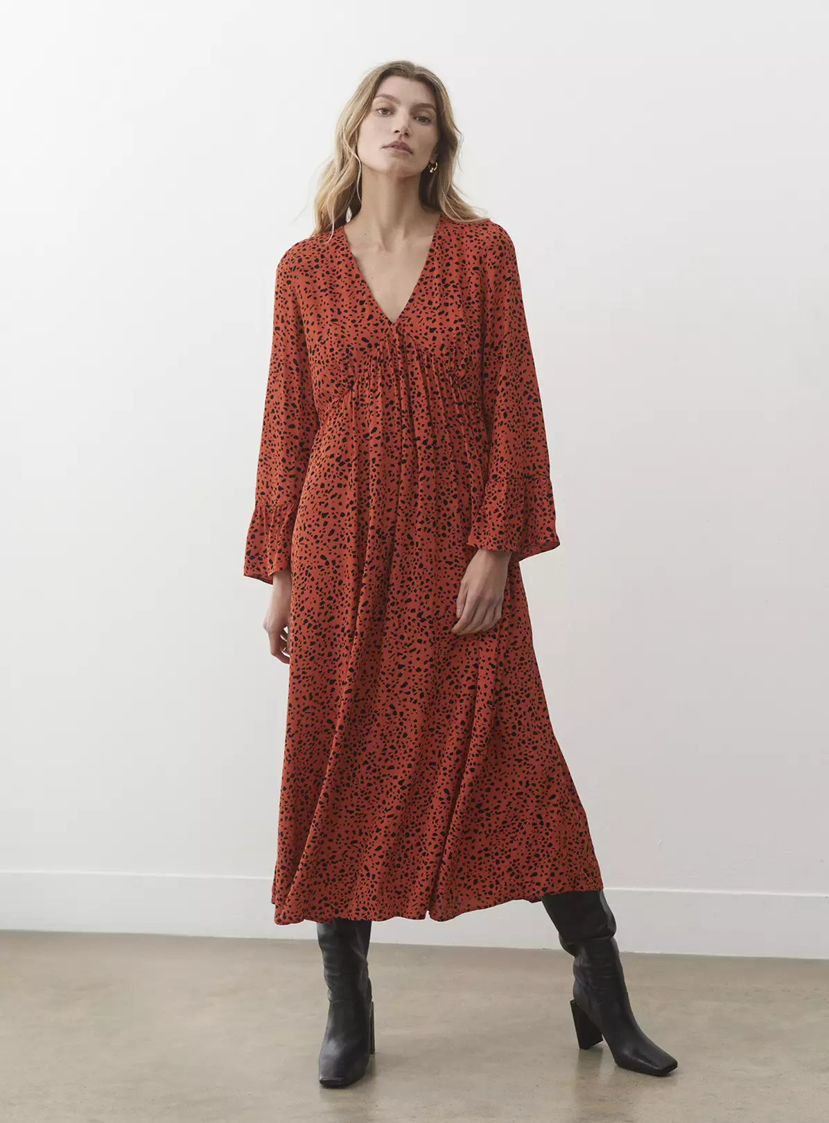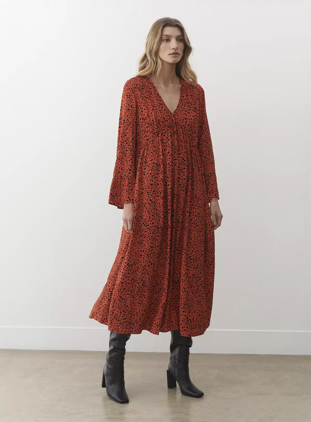 Oversized in style, Laura is a midi dress that features long sleeves with deep flute cuffs. She also features a flattering empire line bust and v-neckline. Wear with ankle boots and layer with a wooly knit.