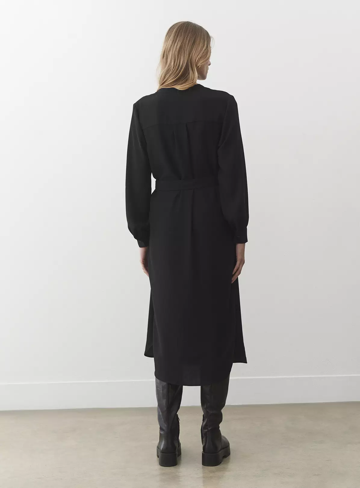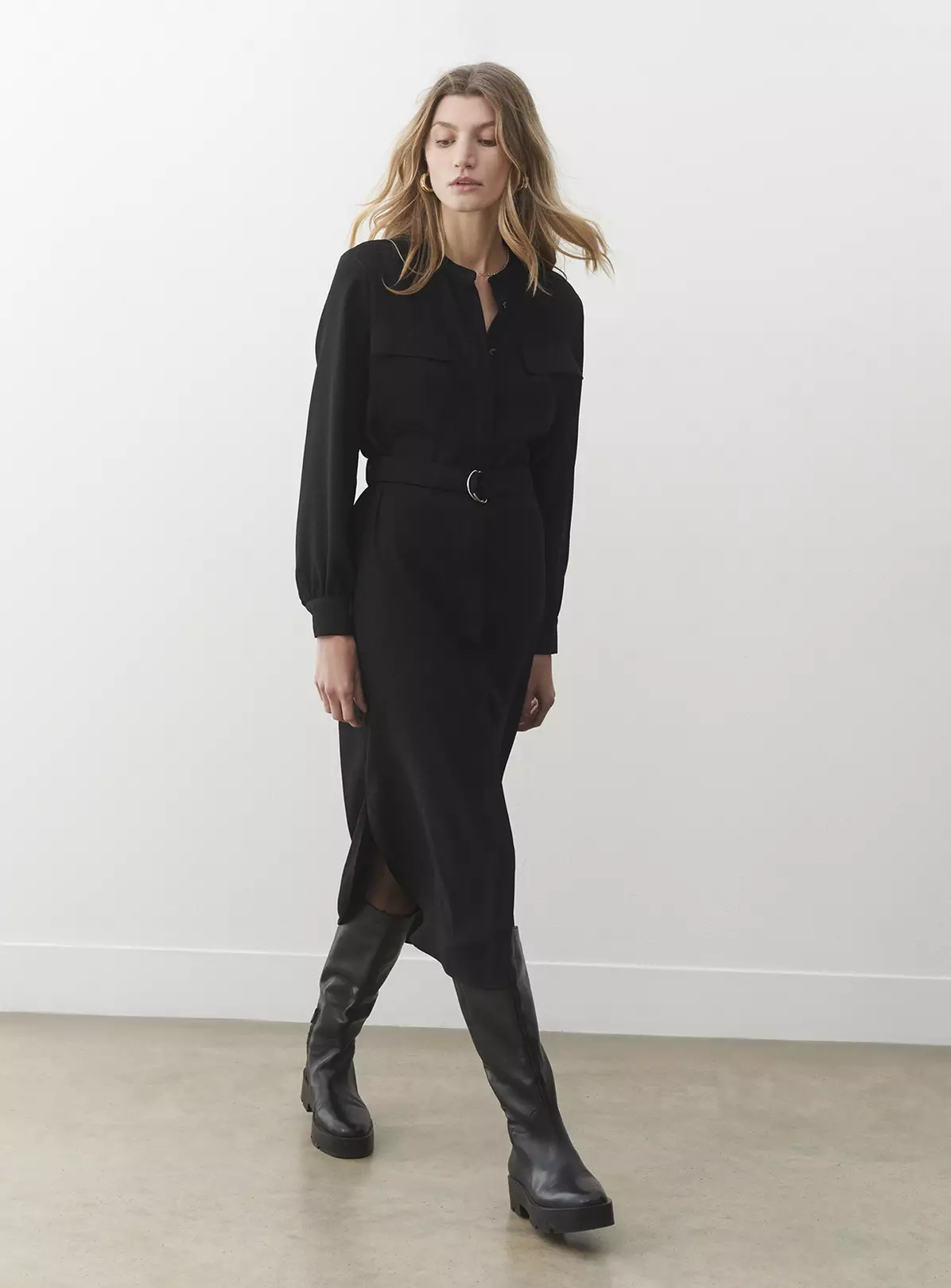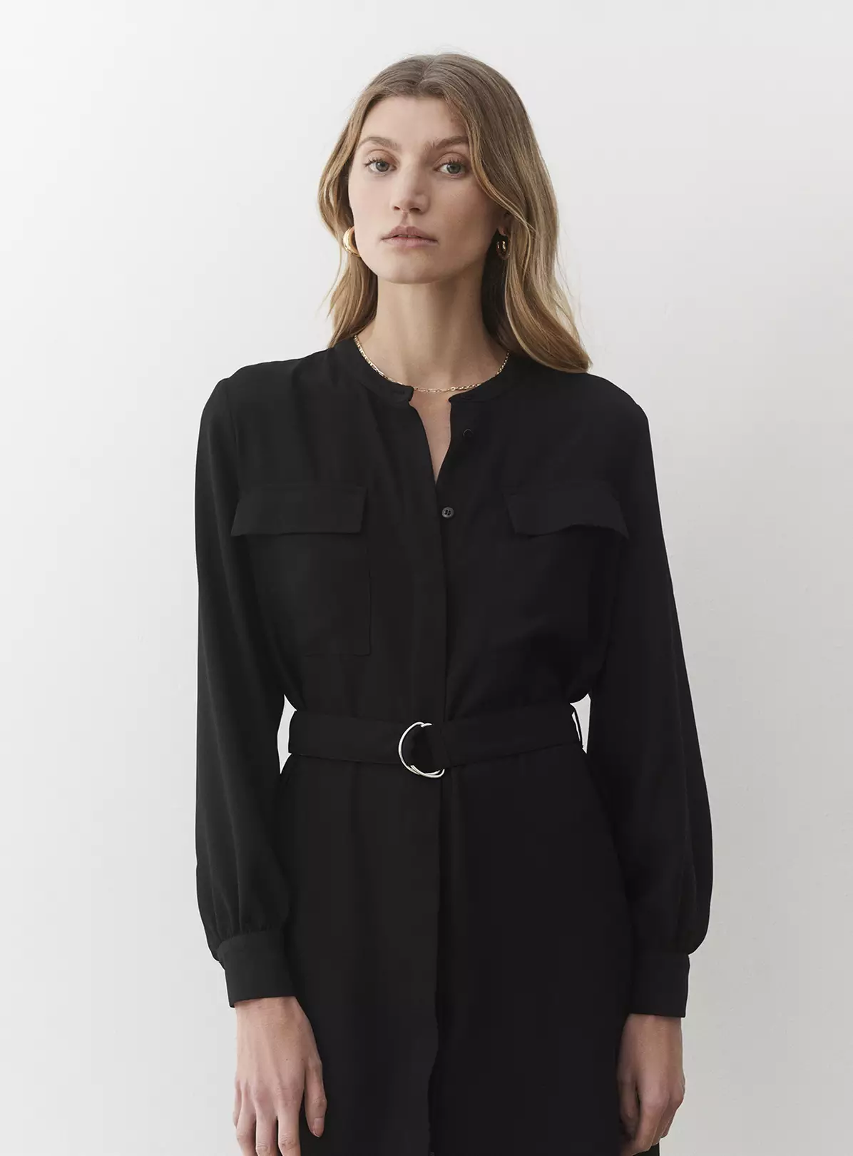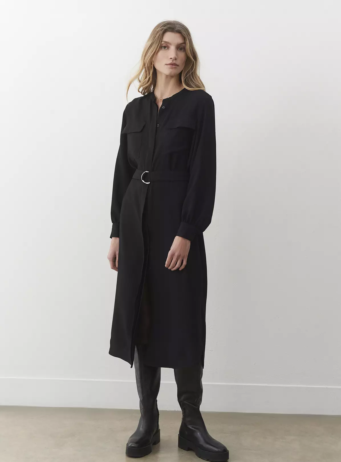 Our tunic-style Lyra midi dress provides the perfect amount of coverage for the colder weather. She features a concealed placket, two front patch pockets, a tie waist and long sleeves that end in cuff and value detail. Dress up or down to suit the occasion.