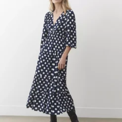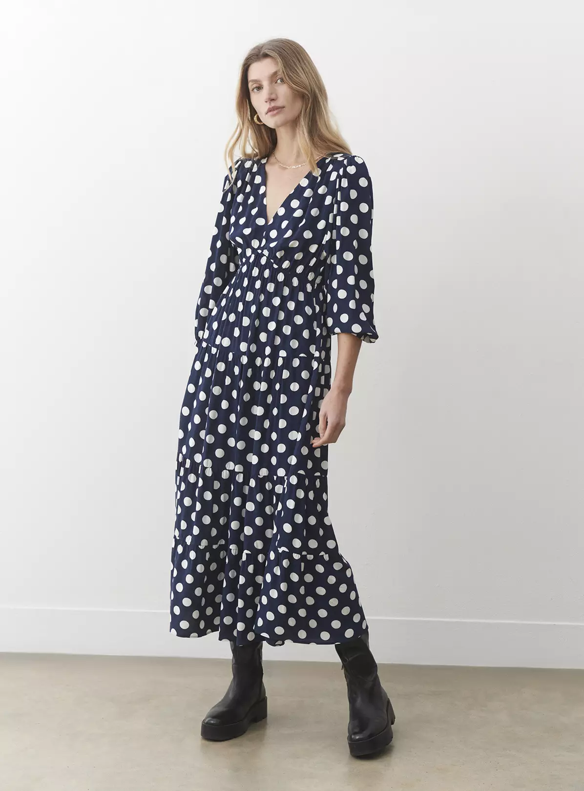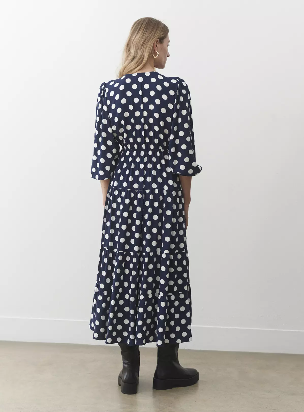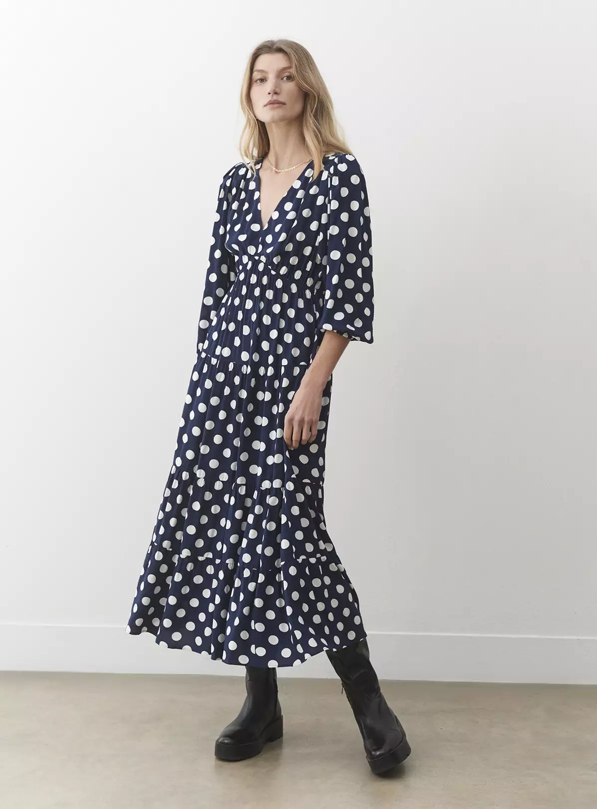 A tiered midi dress with plenty of feminine details, Maria features a v-neckline, an elasticated empire line and elasticated cuffs at the end of voluminous blouson sleeves. In a classic print, Maria can be dressed up or down to suit the occasion.
