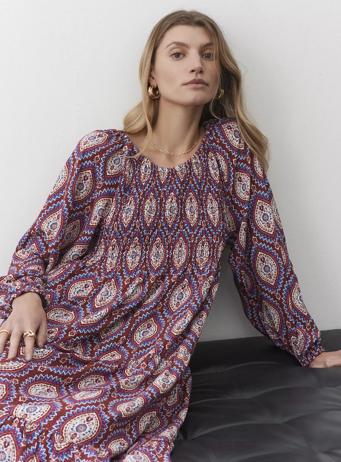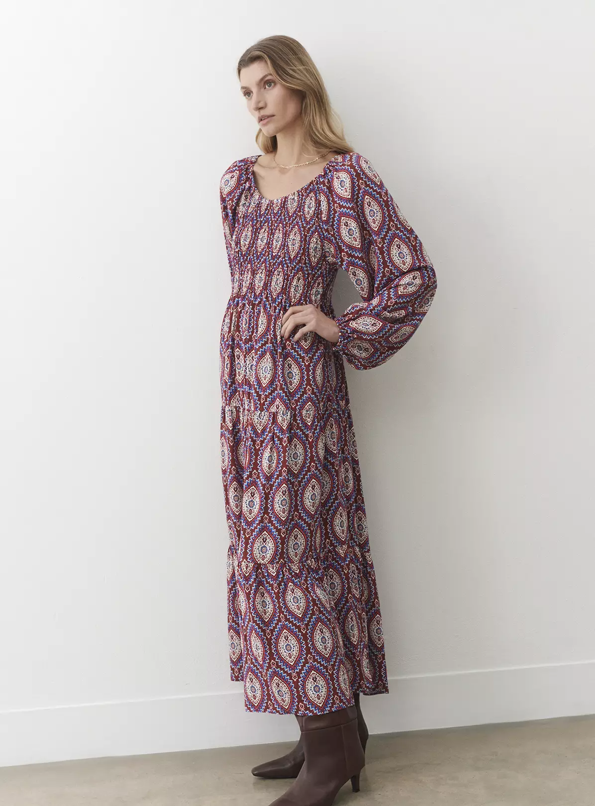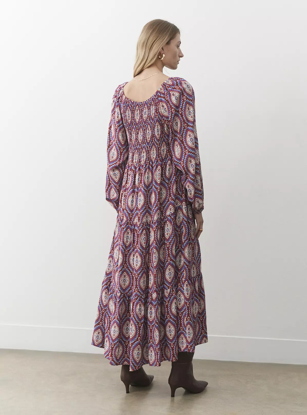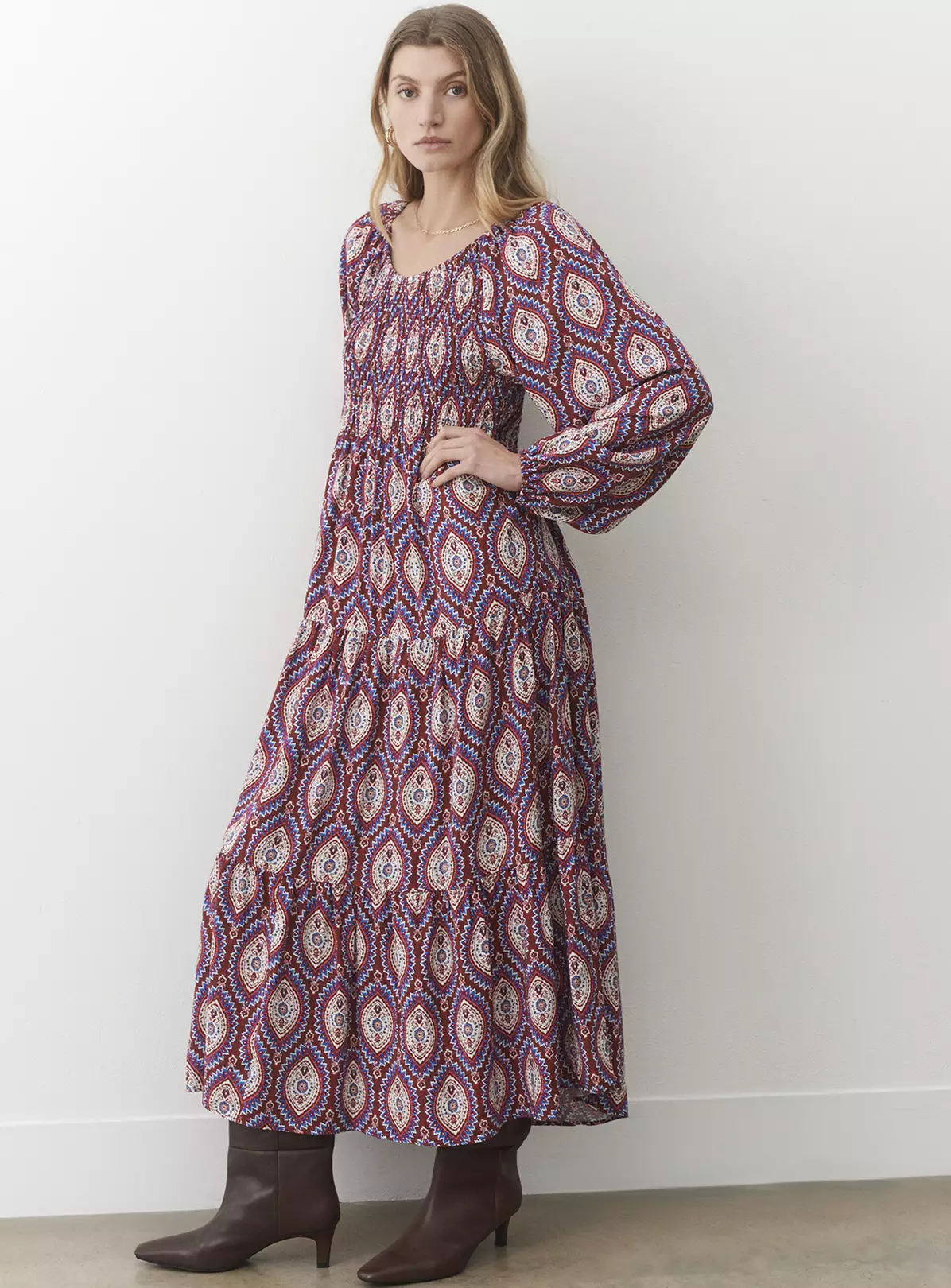 Midi in length with a tiered skirt, Tilly can be worn on or off the shoulder to suit the occasion. She features elasticated shirring on the bust and has long sleeves with elasticated cuffs that create a voluminous blouson sleeve. Wear with ankle boots and your favourite cropped jacket.