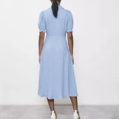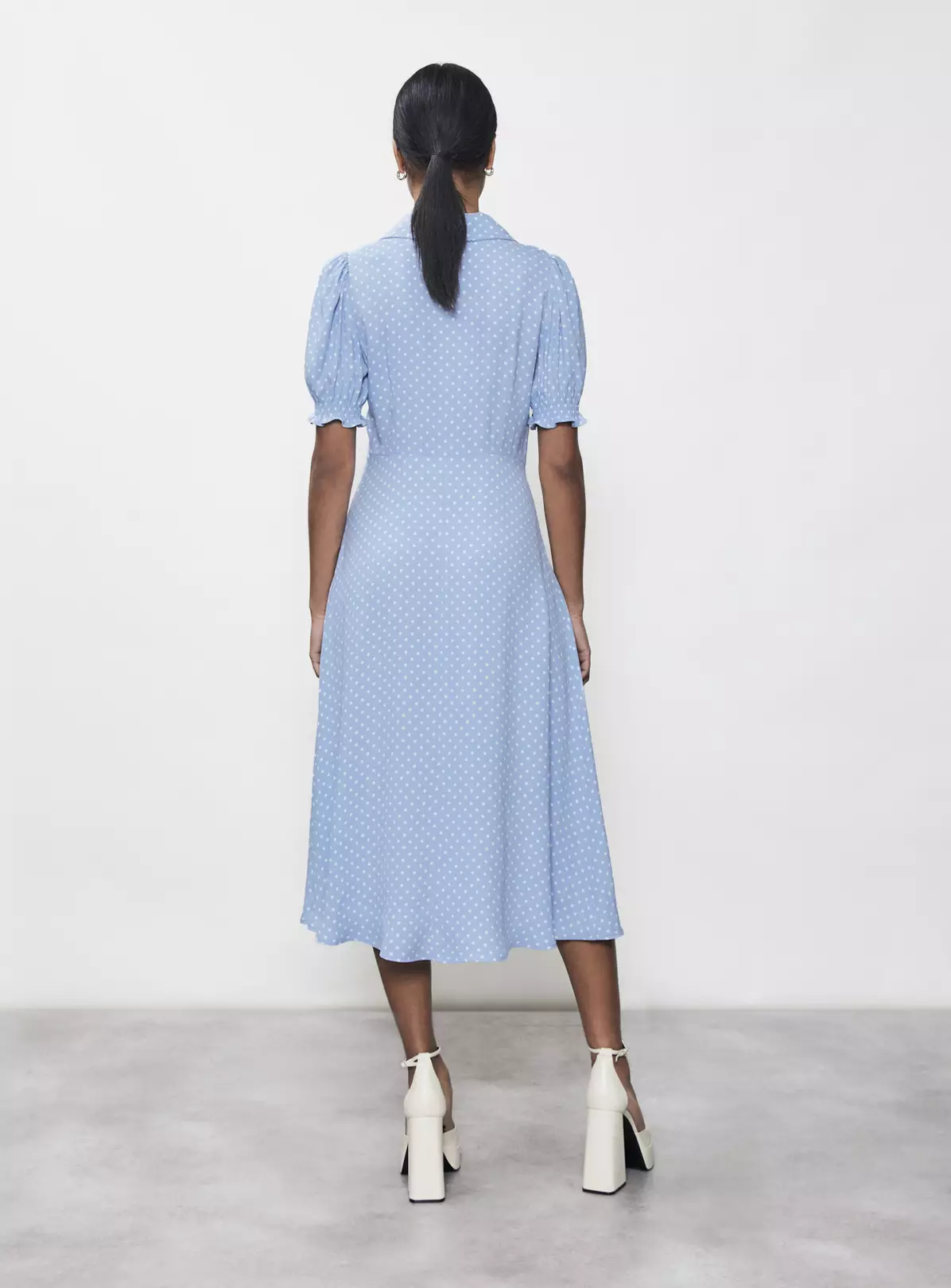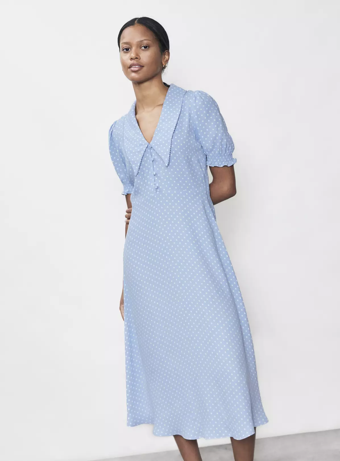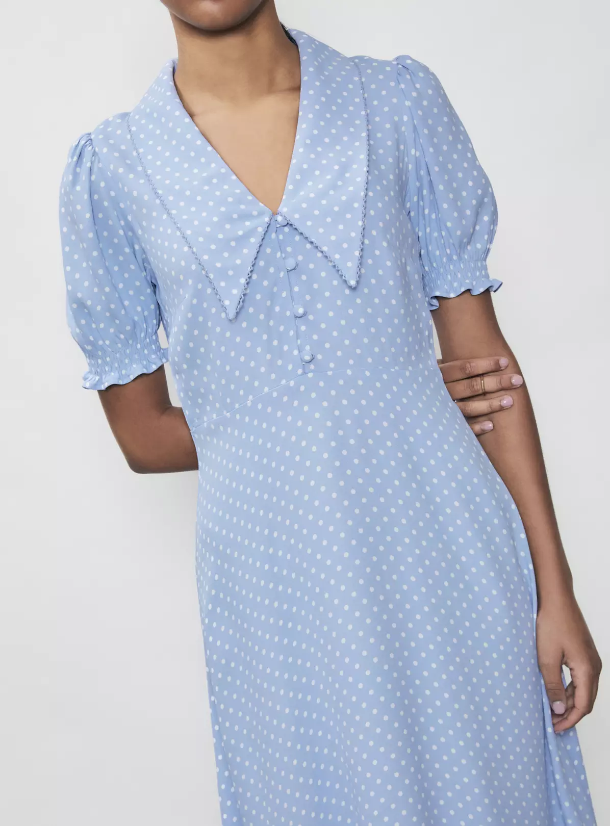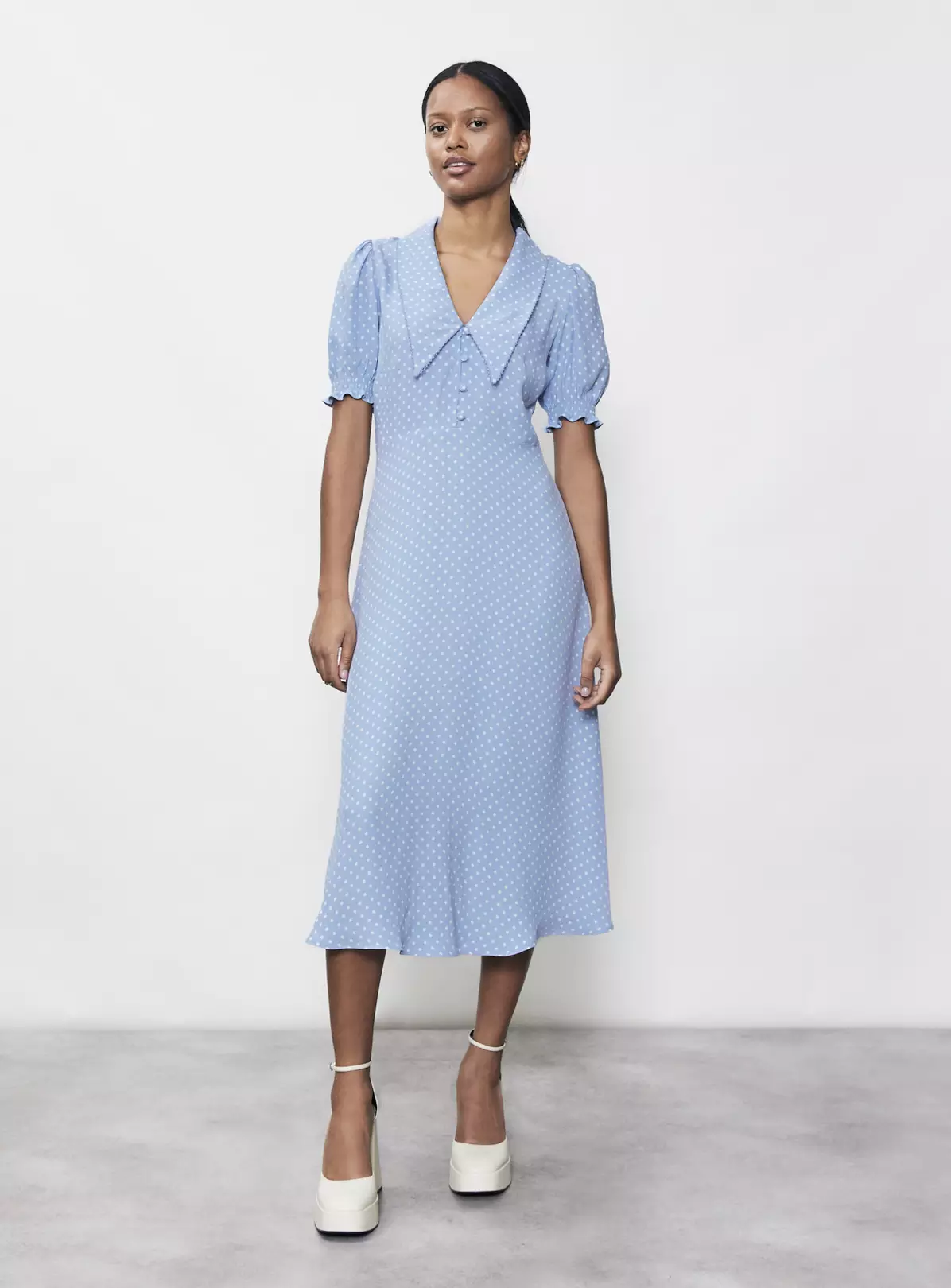 Valerie is all about the details. Midi in length and crafted from our signature satin back crepe in a classic dot print, she features covered values to the waist and short sleeves that have elasticated shirring cuffs, with frills. Our favourite part is the oversized pointed collar with beautiful embroidered trim detail. Wear with your favourite strappy wedges or sandals.