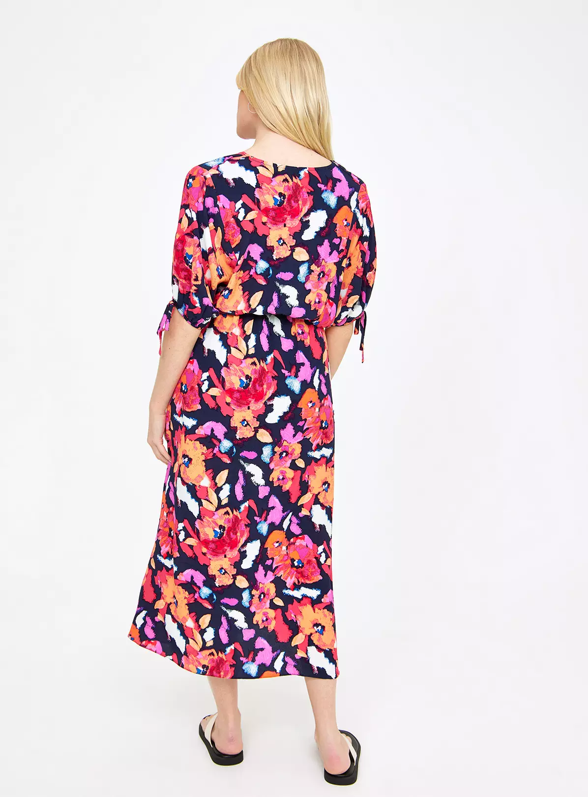 Designed in a beautiful silhouette, our midaxi dress is adorned with a floral bloom print. Featuring a tie-waist belt to flatter your figure, it also has a v neckline and tie details on the sleeves.