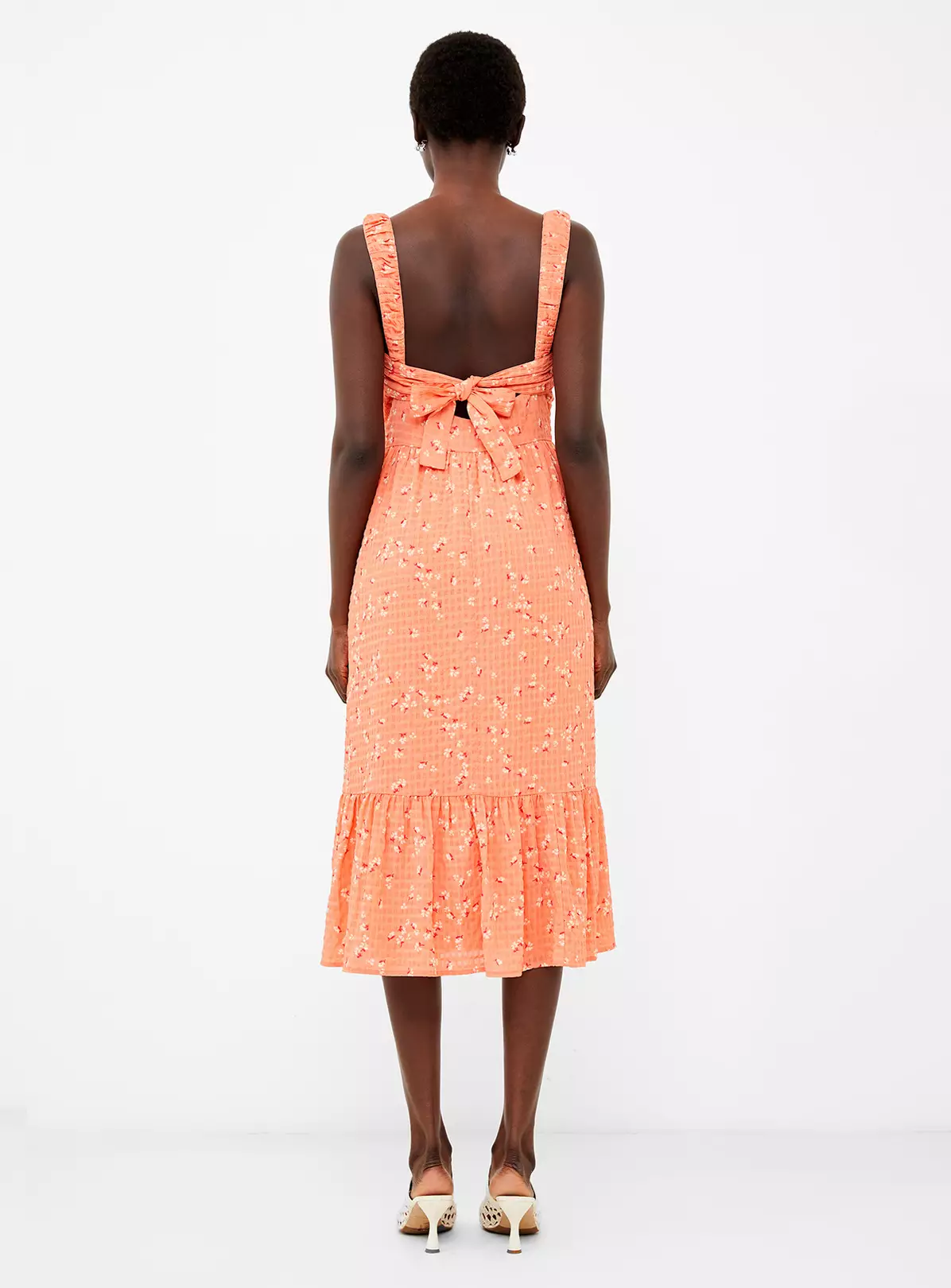 Add a touch of je ne sais quoi to your summer wardrobe with our Erin Gretta Dress. Feminine ruched straps and a sweetheart neckline lead the way to a delightful dress with a ditsy floral print for a touch of playful grace that is perfect for those summer day parties and plans. The seersucker texture finishes this style in a unique fashion with laidback charm to compliment for seaside strolls or picnics in the park. This style is complete with a captivating cut-out back and self-tie element elevating.