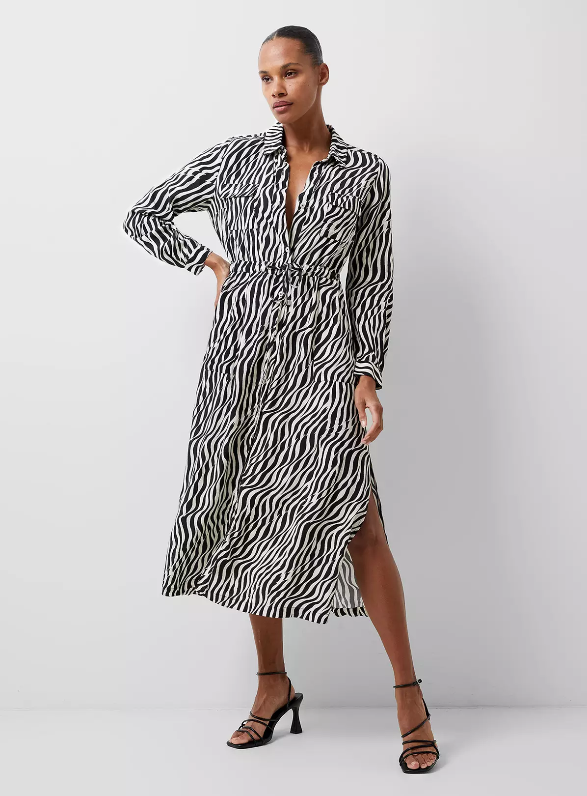 Your wardrobe will go wild for the addition of our Seine Eco Delphine Midi Dress. This lively animal print dress brings must have monochromes to life by revamping traditional shirt dress features such as a collar and breast pockets with updates in the form of a flattering internal drawstring in matching zebra print and a playful side split. This long sleeved midi dress is ideal for desk to date night dressing. We have chosen to use a viscose yarn from LENZING called ECOVERO. The sustainable viscose fibres are produced using wood pulp derived from responsibly managed forests.