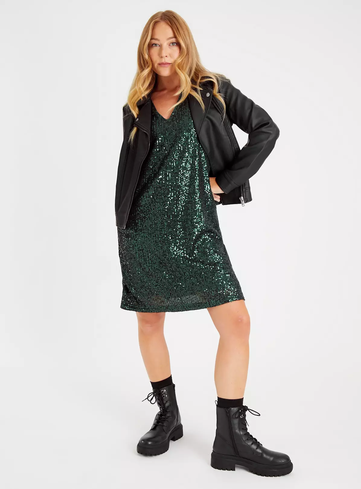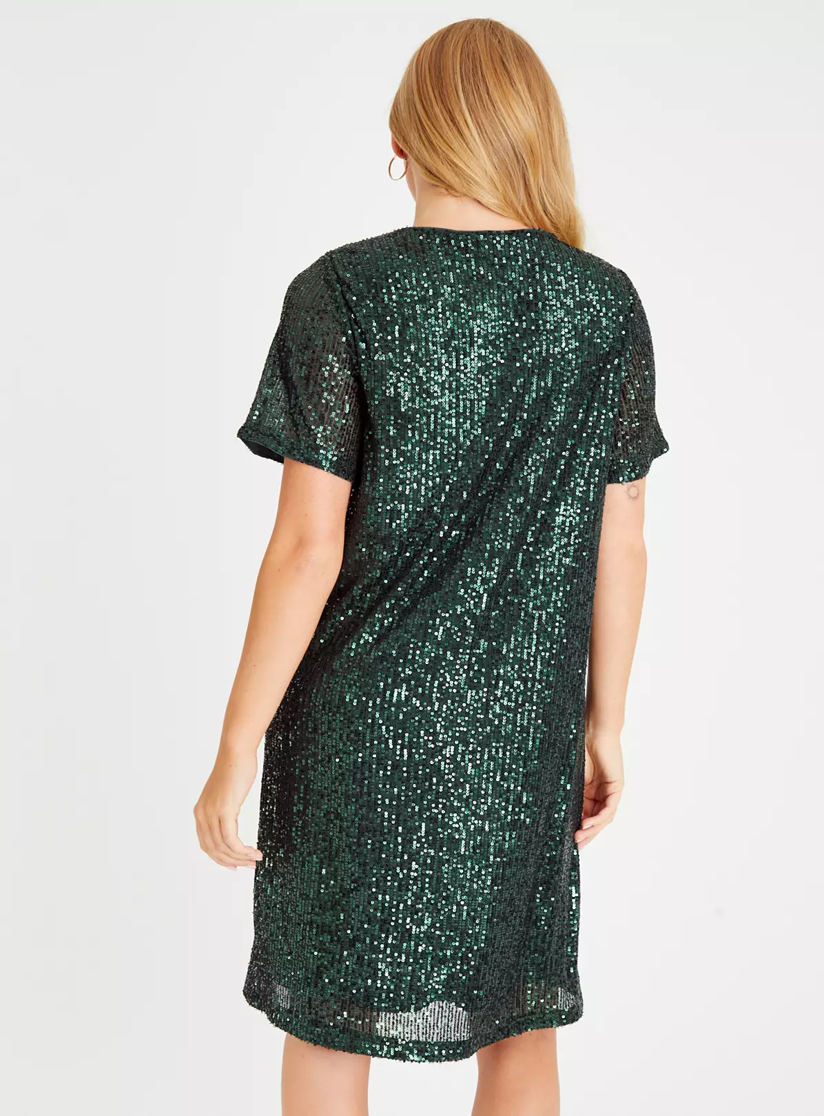 Fresh from our evening wear edit, this glam green dress is the perfect pick for your special occasion or party. With stunning sequin embellishments, it also features a classic V-neck and short sleeves. Time to dance!