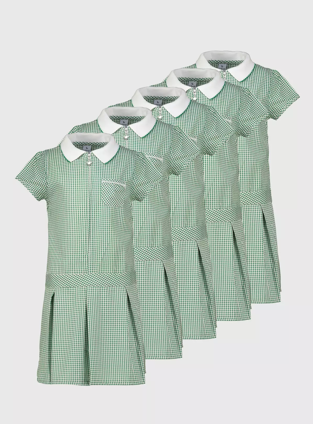 Get ahead for summer term with with our green cap sleeve sporty gingham dress with its zip front, drop hem and cute, low slung pockets. Perfectly practical, it’s made from a fabric which repels water-based stains, and is easy to iron. Presented in a handy five pack, so there’s one for everyday of the school week. See our full range of school uniform, especially designed to kit them out from head to toe this season. Available in a variety of colours.